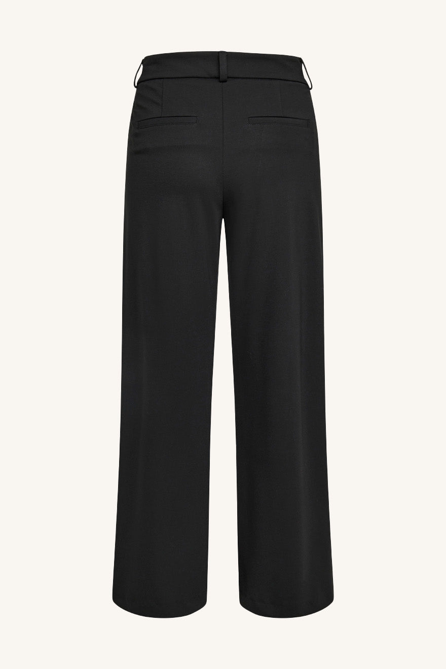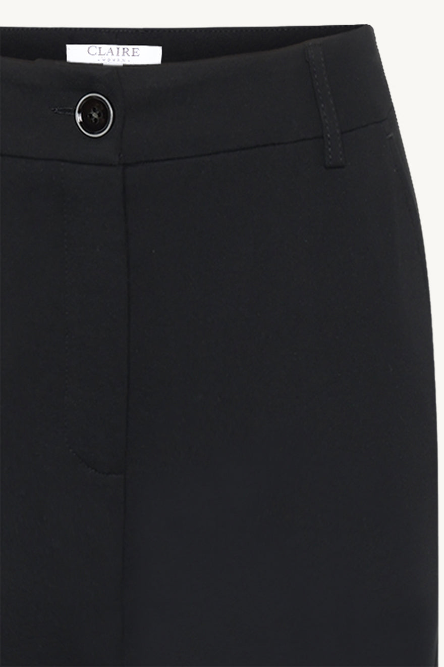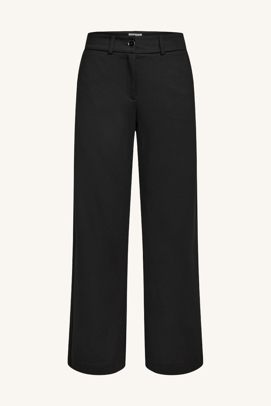Leveät Claire Woman Tarita jerseyhousut, ajattomassa mustan sävyssä. Claire Woman Tarita housuissa on edessä vetoketju ja nappi, sivutaskut ja vyölenkit.