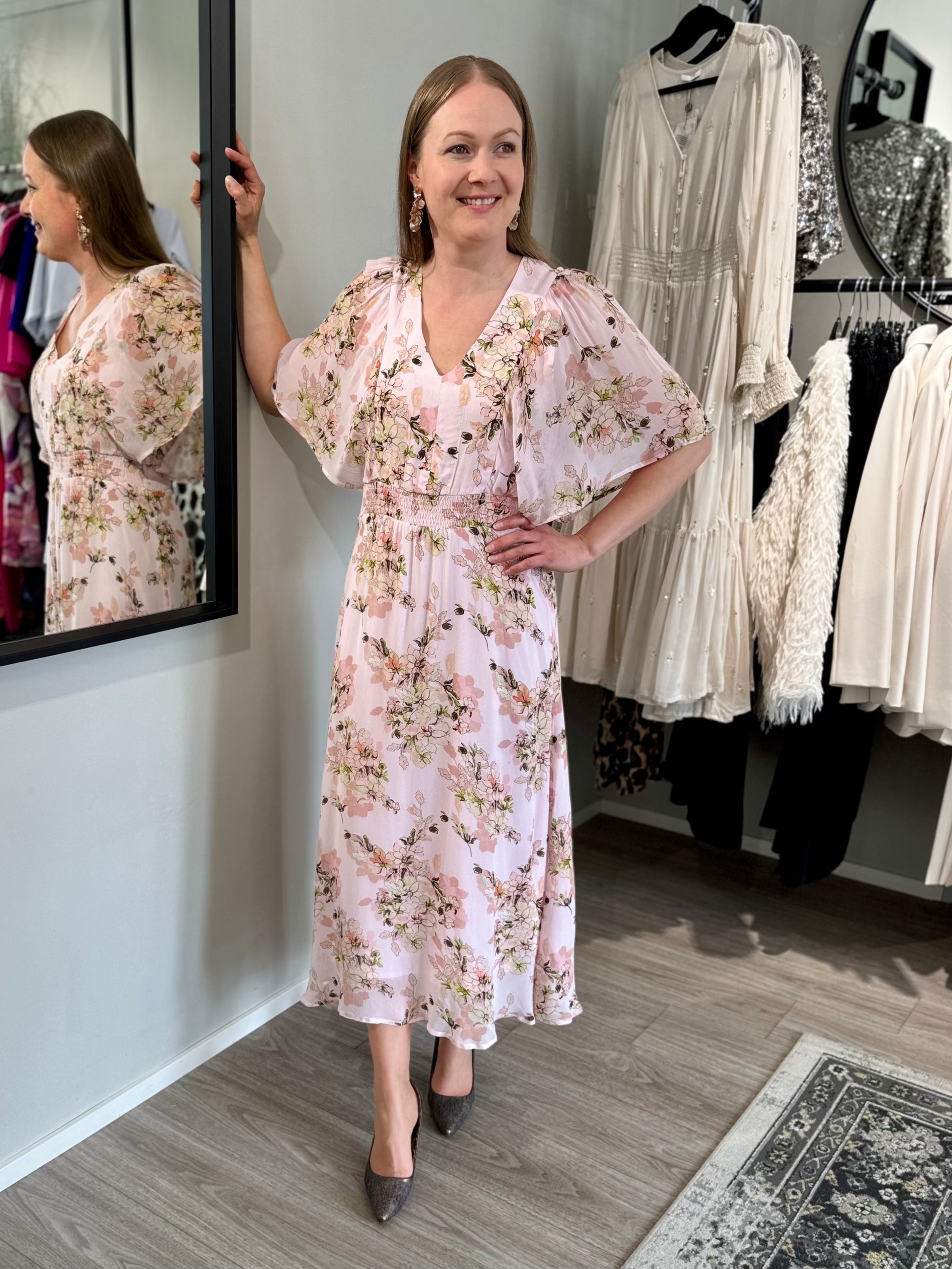 Kesäinen Claire Woman Danijela mekko, jossa on V-pääntie, kauniit, kevyet perhoshihat, sekä kuminauha vyötäröllä. Claire Woman Danijela mekossa on A-linjainen kevyesti laskeutuva helma. Mekossa on vuori ja päällä kaunis kukkakuosinen sifonkikangas.