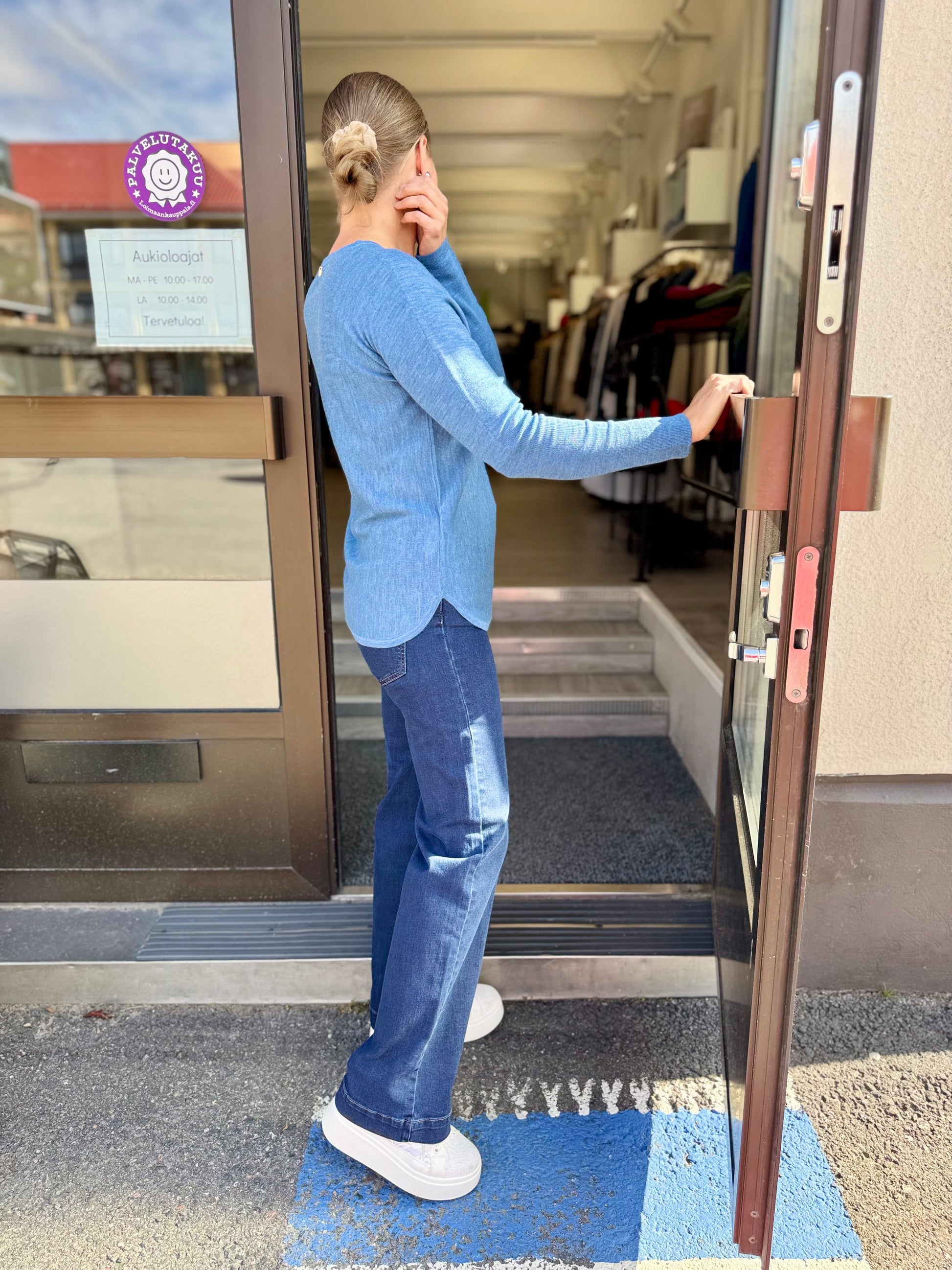 Ajaton ja suosittu Claire Woman Pippa neule meleeratussa sinisen sävyssä. Laadukasta ja ohutta merinovillaneulosta. Claire Woman Pippa neuleessa on hihansuissa pitkät resorineulokset ja helmassa pienet pyöristetyt halkiot molemmin puolin. Sopii usein sellaisillekin, jotka eivät yleensä voi käyttää villatuotteita.