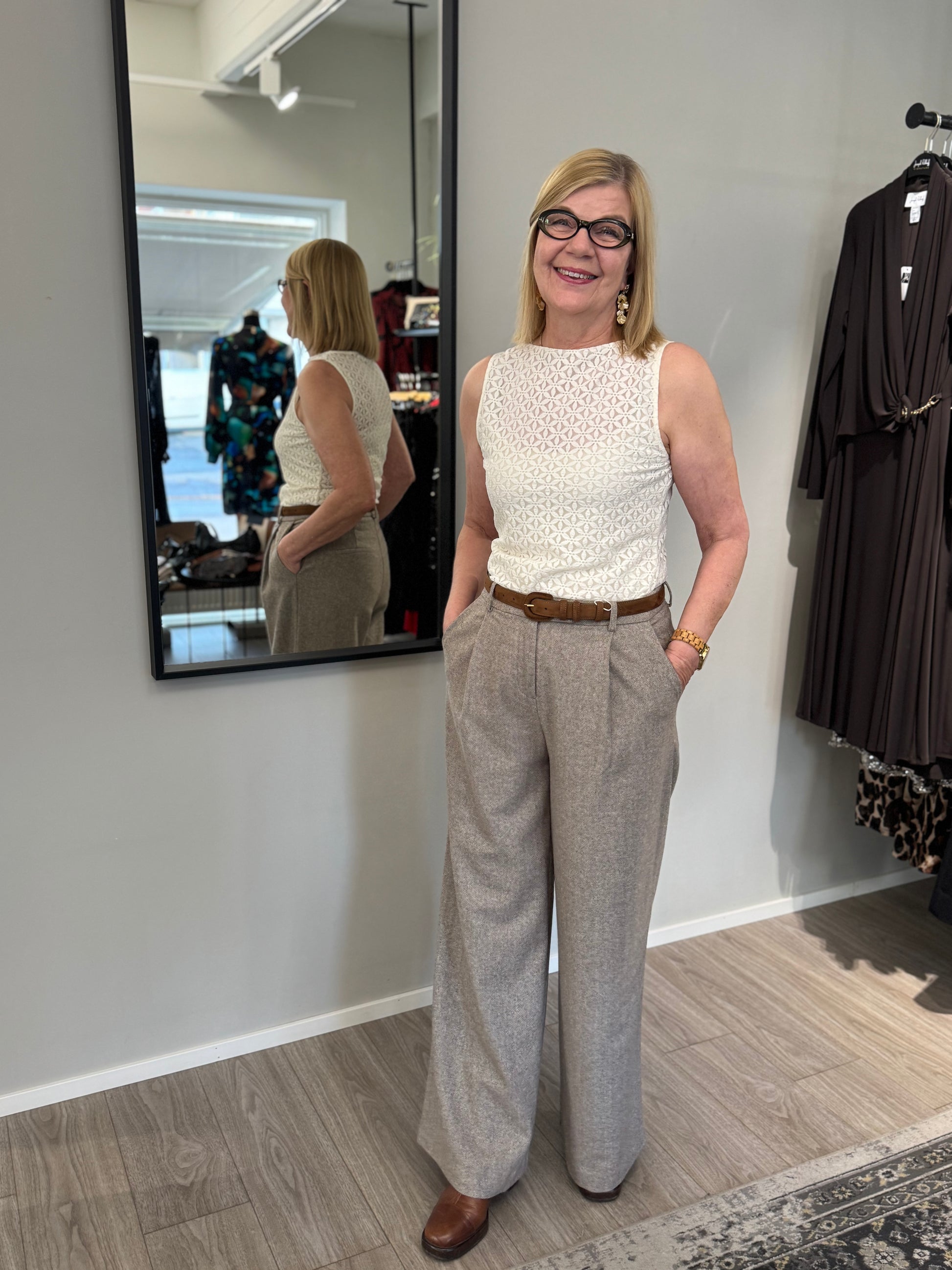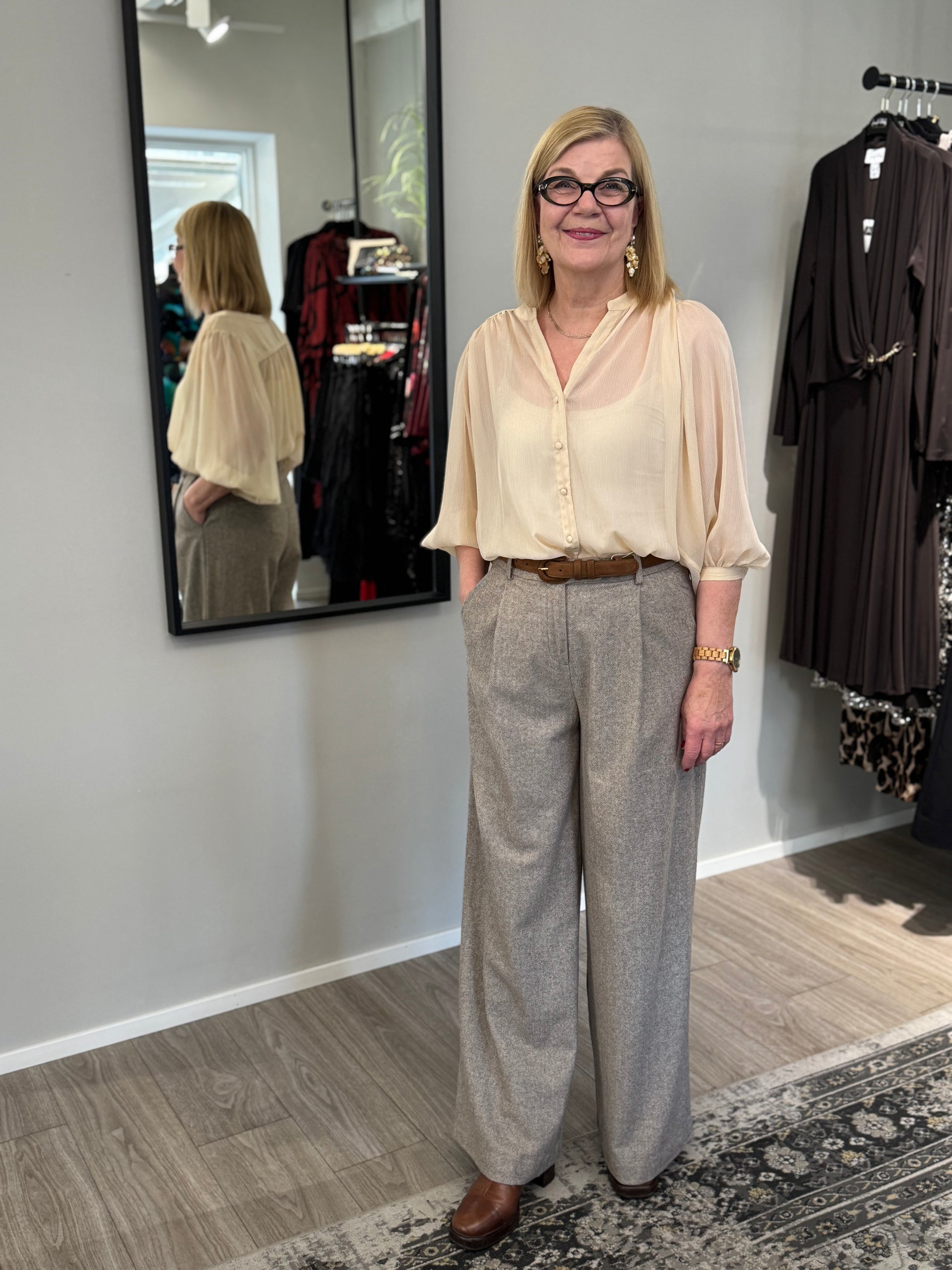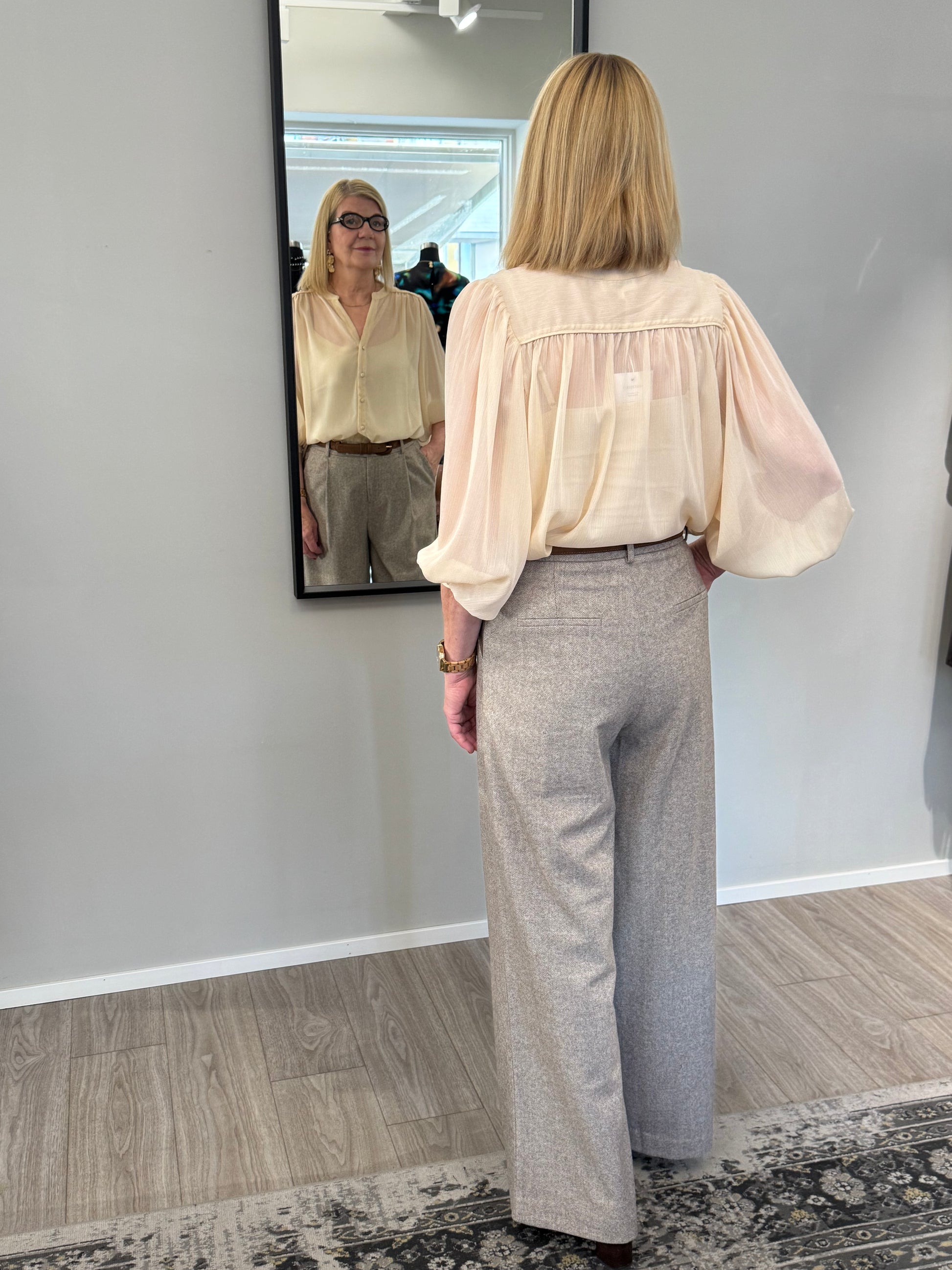 Leveät, villasekoitteesta valmistetut Times housut hennolla kalanruotokuviolla. Grace & Mila Times housuissa on korkea vyötärö, jossa on edessä tyylikkäät laskokset, sekä hakaskiinnitys ja vyölenkit. Housuista löytyy sivutaskut, takaa listataskut ja ne on vuorattu polviin saakka. Yhdistä Grace & Mila Tiffany takin kanssa, saadaksesi täydellisen setin.