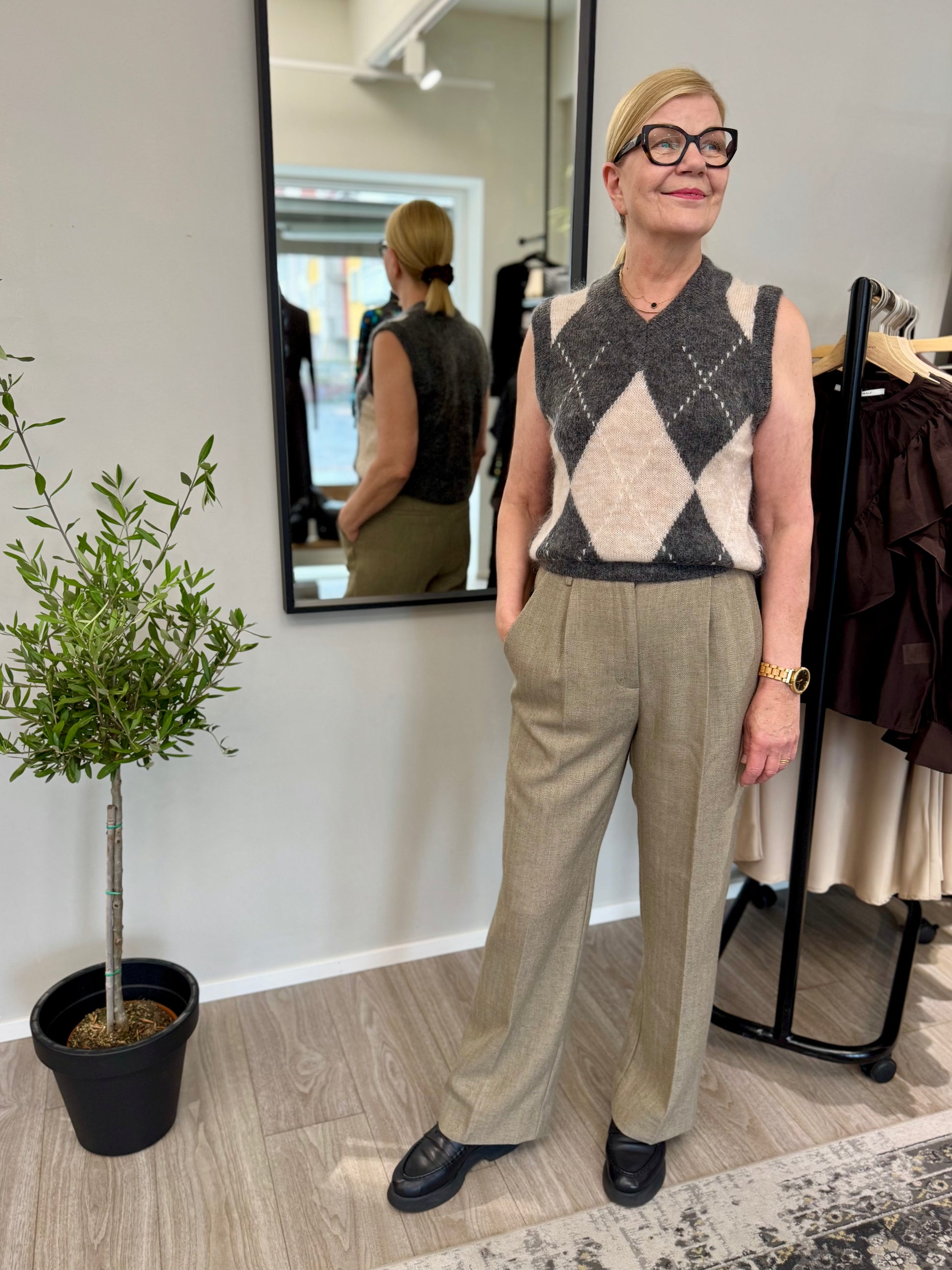 Grace & Mila Salvo neuleliivi tuo argyle-kuvion uudelleen hihattomana versiona, luoden klassisen ja itsevarman siluetin. Grace & Mila Salvo timanttikuvioisen neulepuseron leveä V-pääntie lisää modernia ilmettä ja suora leikkaus ja viimeistely korostavat mallin ajatonta henkeä. RWS-sertifioidusta villasta ja mohairista neulottu lämmin vaatekappale on ehdoton hankinta sesongin vaatekaapiin..