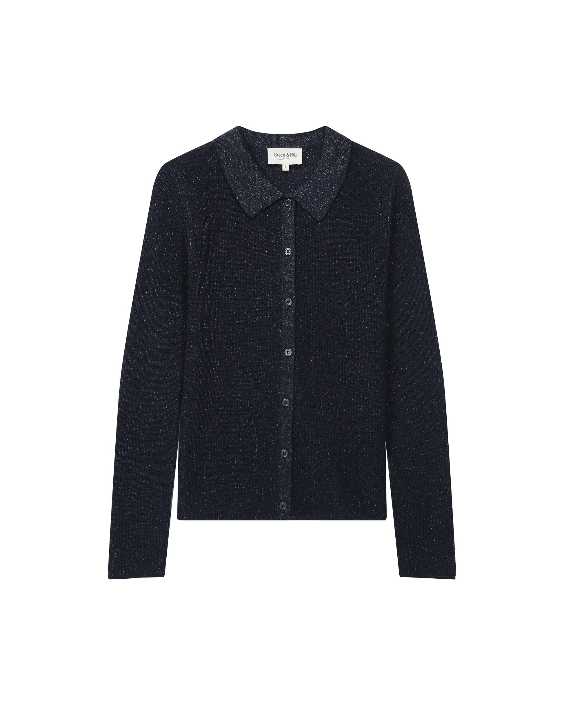 Ohut ja laskeutuva Grace & Mila kauluksilla ja nappikiinnityksellä. Grace & Mila Teller neuletakissa on erittäin joustava ja notkea materiaali, jossa on joukossa hopeista kimalletta.