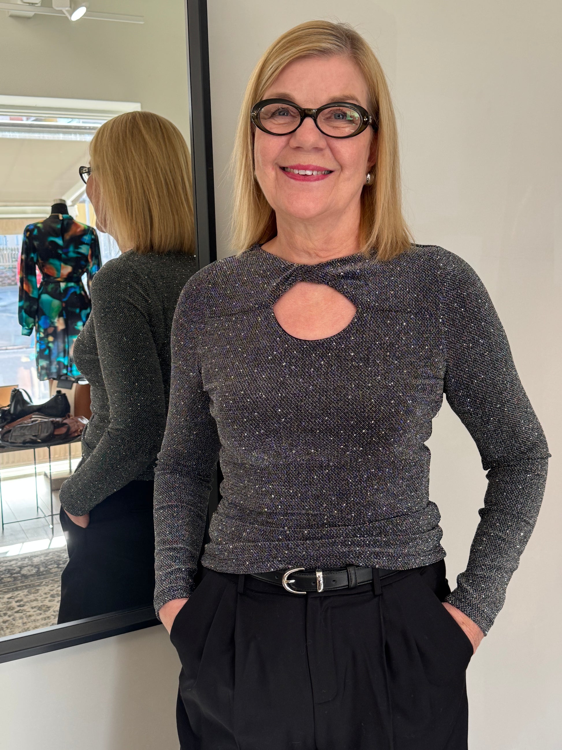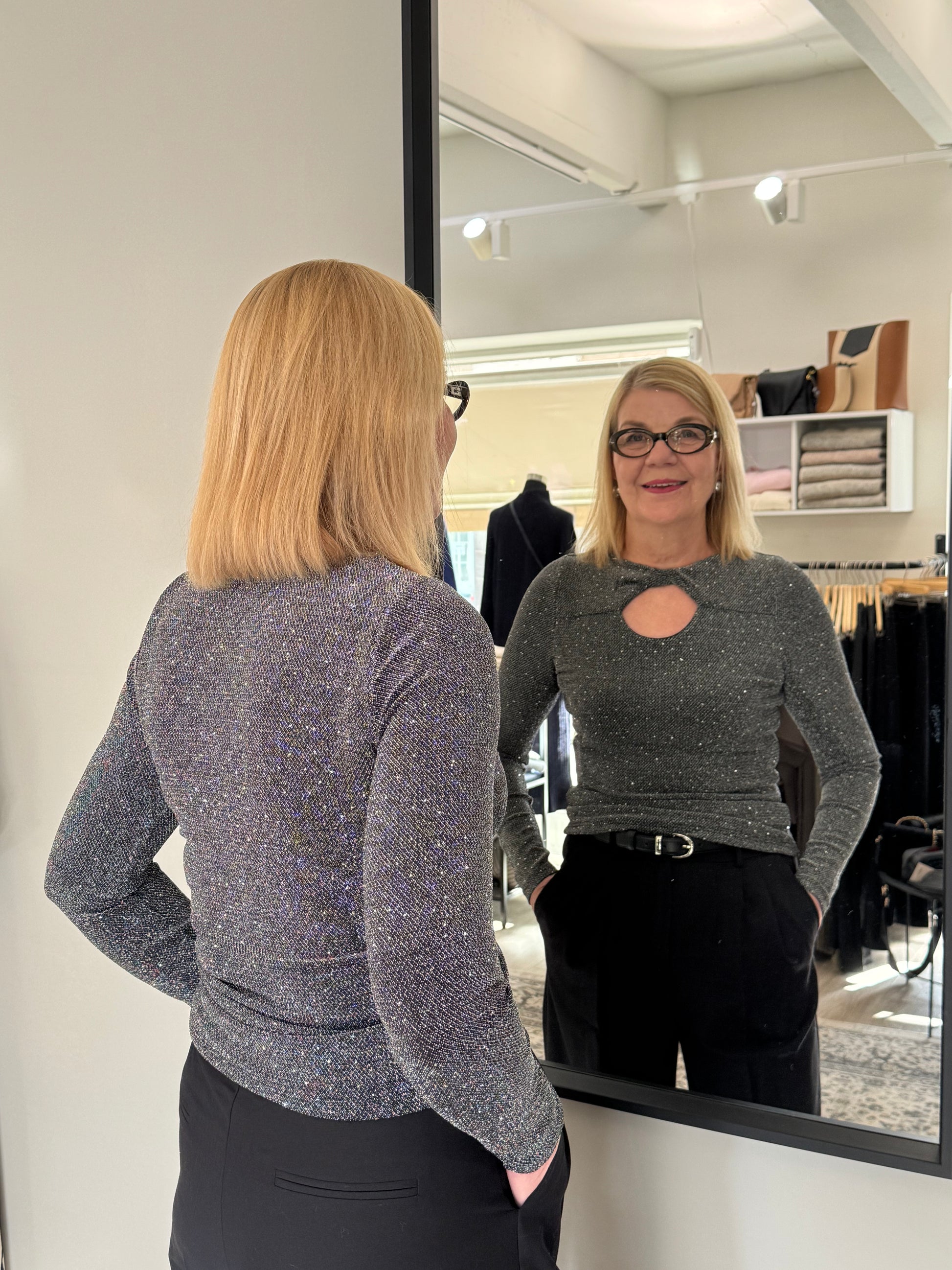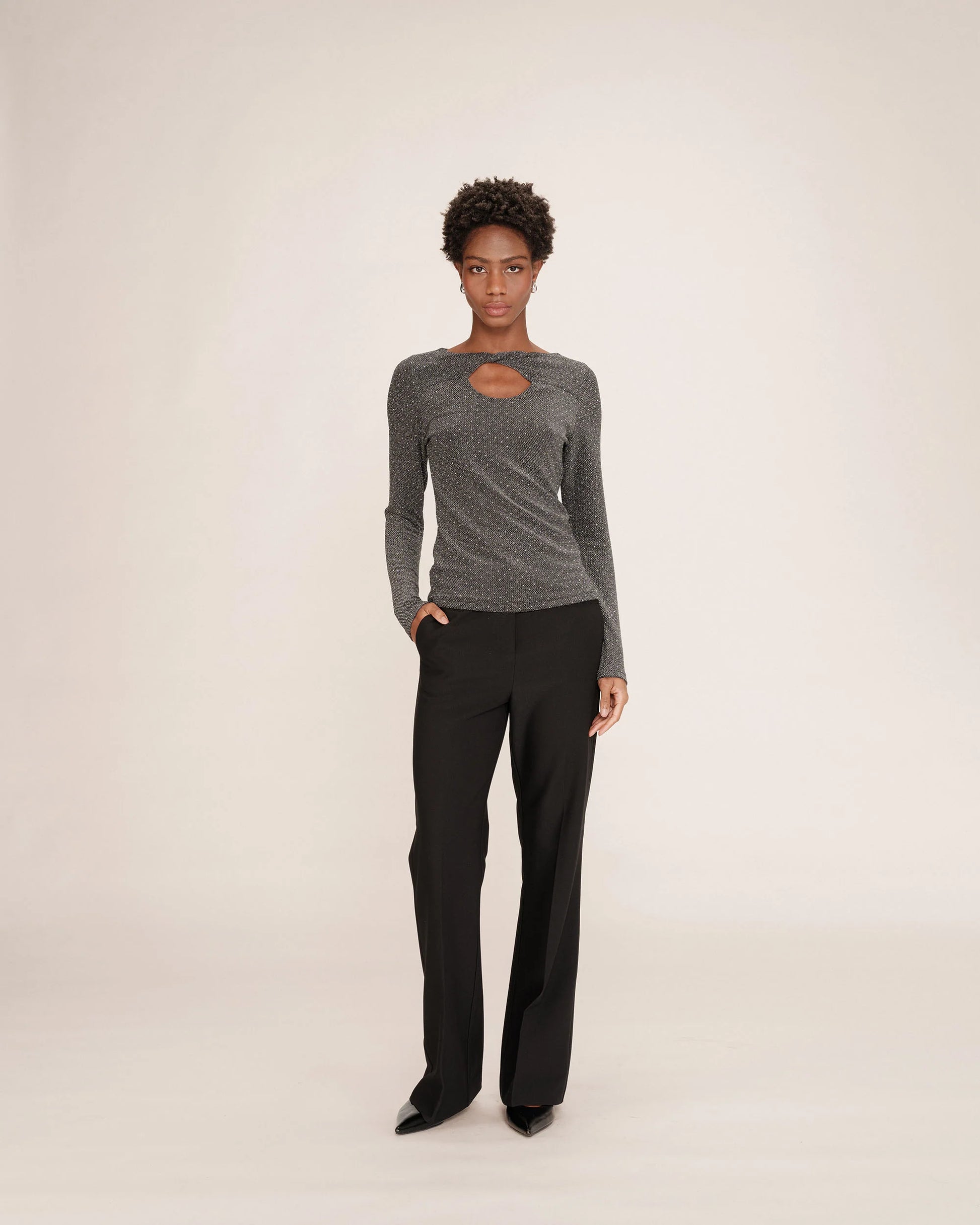 Upeasti kimaltava, joustava ja vartalonmyötäinen Grace & Mila Timothee lurex pusero. Pääntiellä on näyttävä solmuyksityiskohta, jonka voi oman maun mukaan kääntää eteen tai taakse. Grace & Mila Timothee puserossa on ohut mesh vuori.