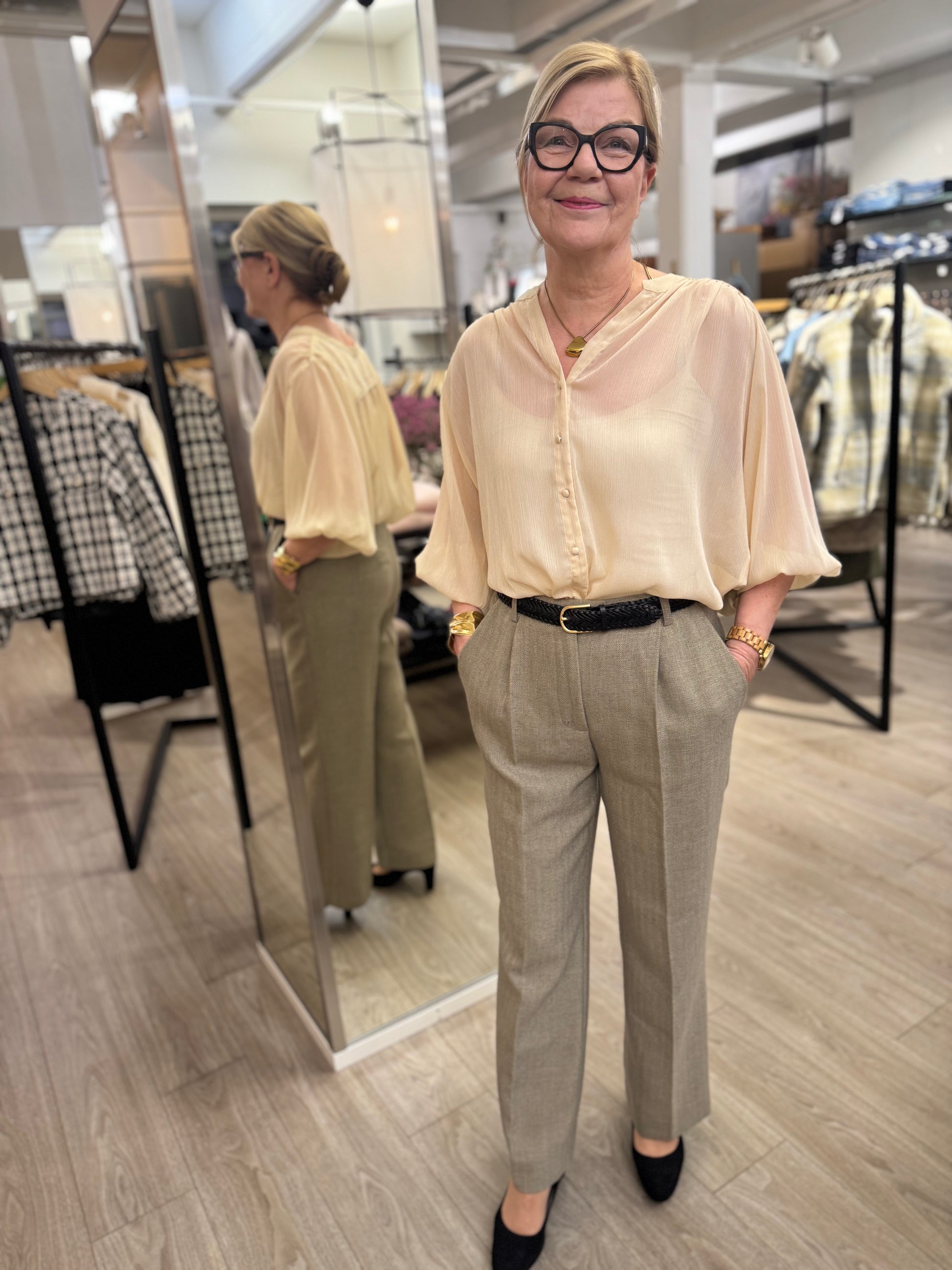 Ilmava, kevyt, väljä ja läpikuultava, nämä kuvastavat tätä hentoa Grace & Mila Tarzy puseroa, jossa on on väljät vajaamittaiset hihat, sekä päällystetyt napit. Puserossa on pyöristetty helma ja se on takaa hieman pidempi. Kankaassa on kaunis, hillitty kimallus.