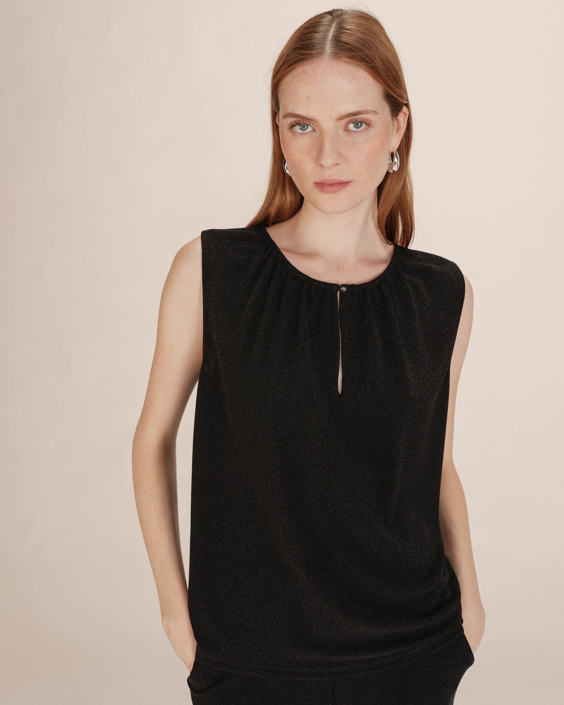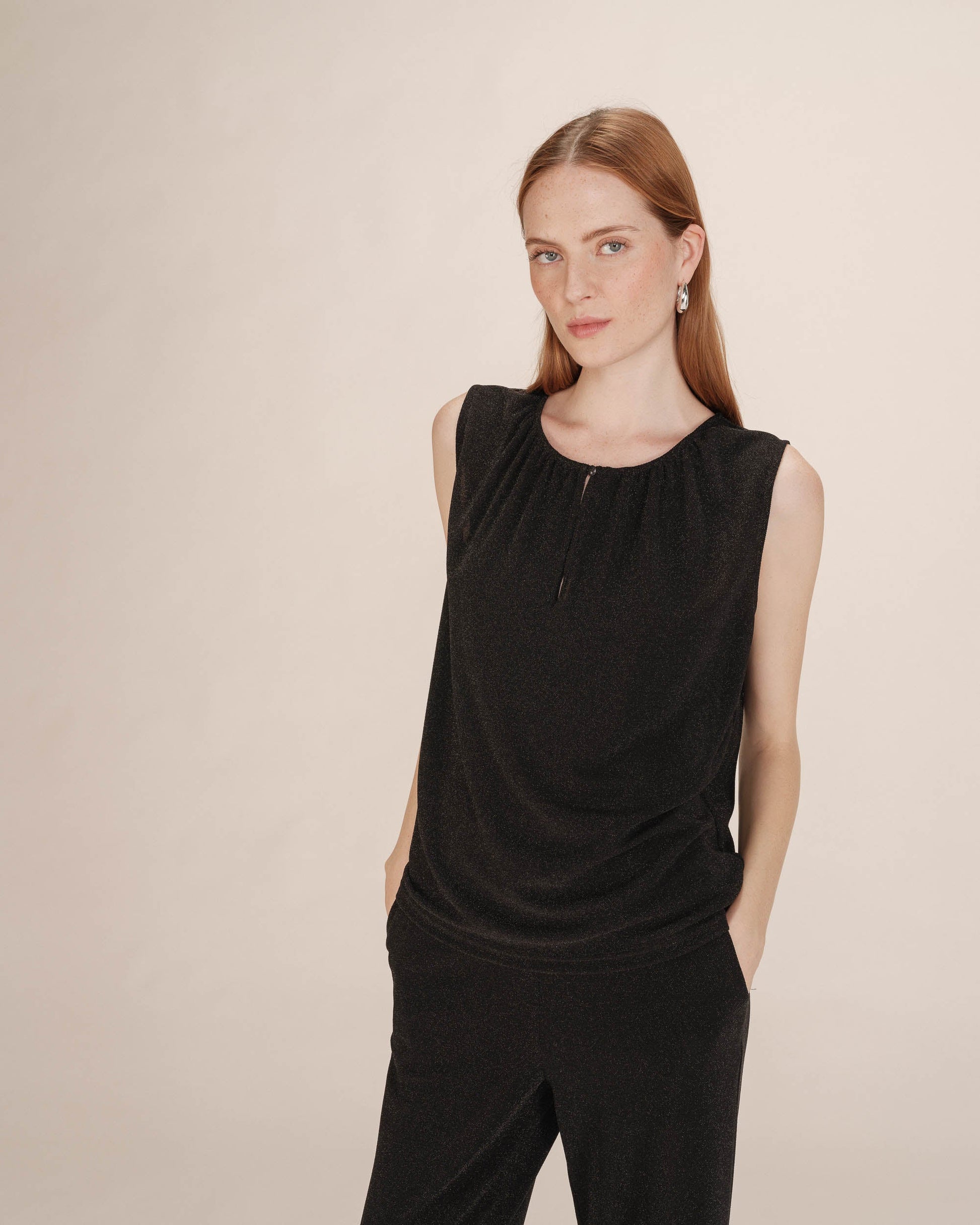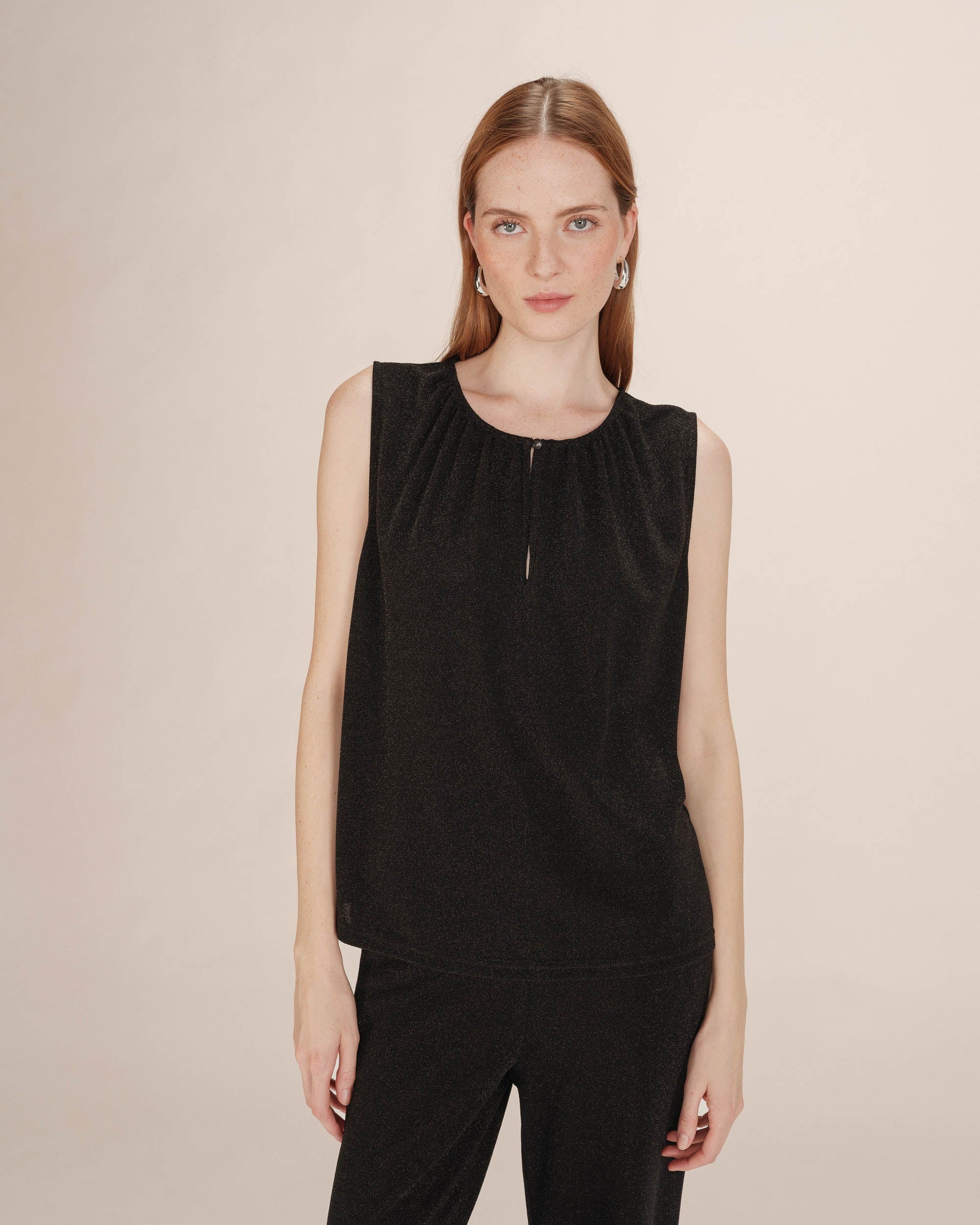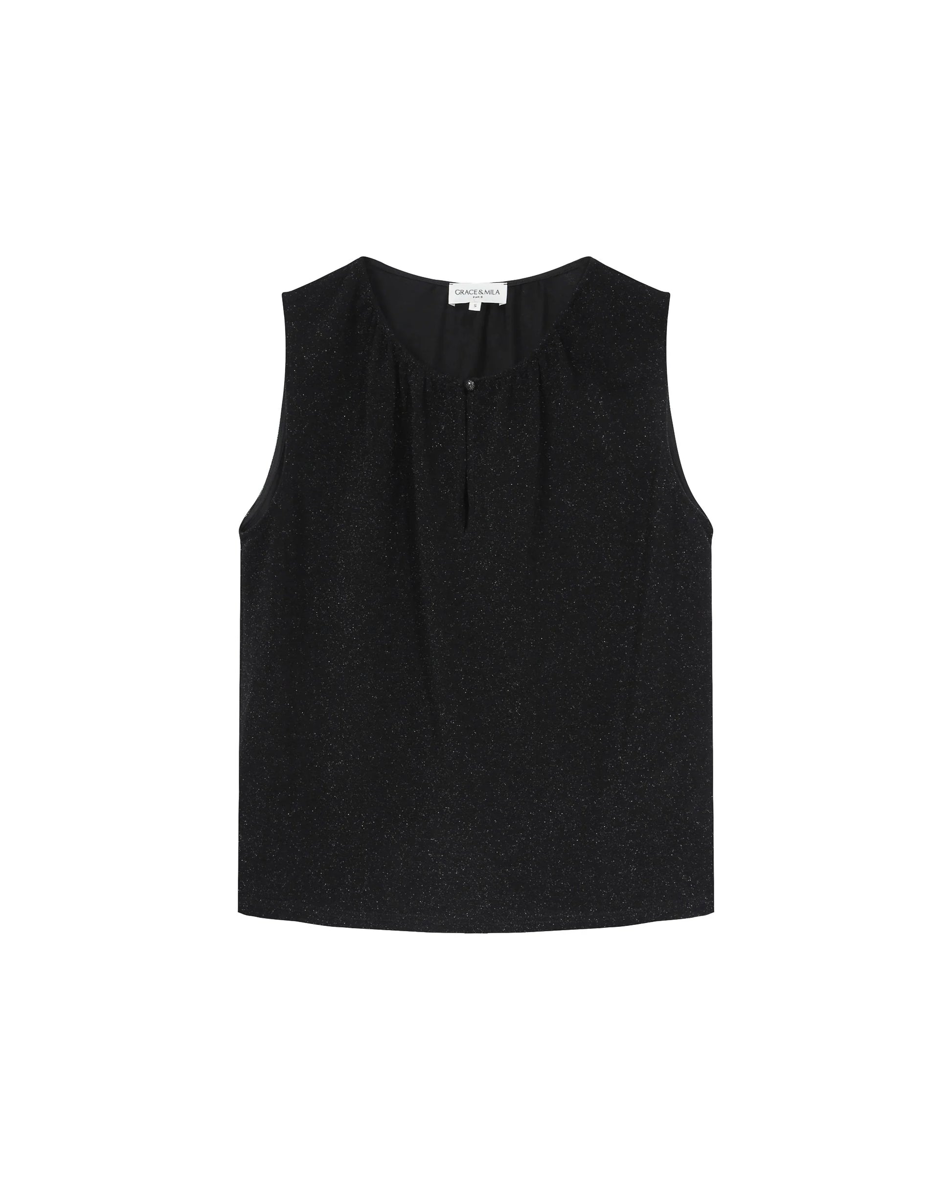 Hillitysti kimaltava Grace & Mila Texto lurextoppi, jossa pyöreä pääntie napillisella halkiolla. Grace & Mila Texto topissa on suora, väljä malli ja ohut, joustava materiaali.