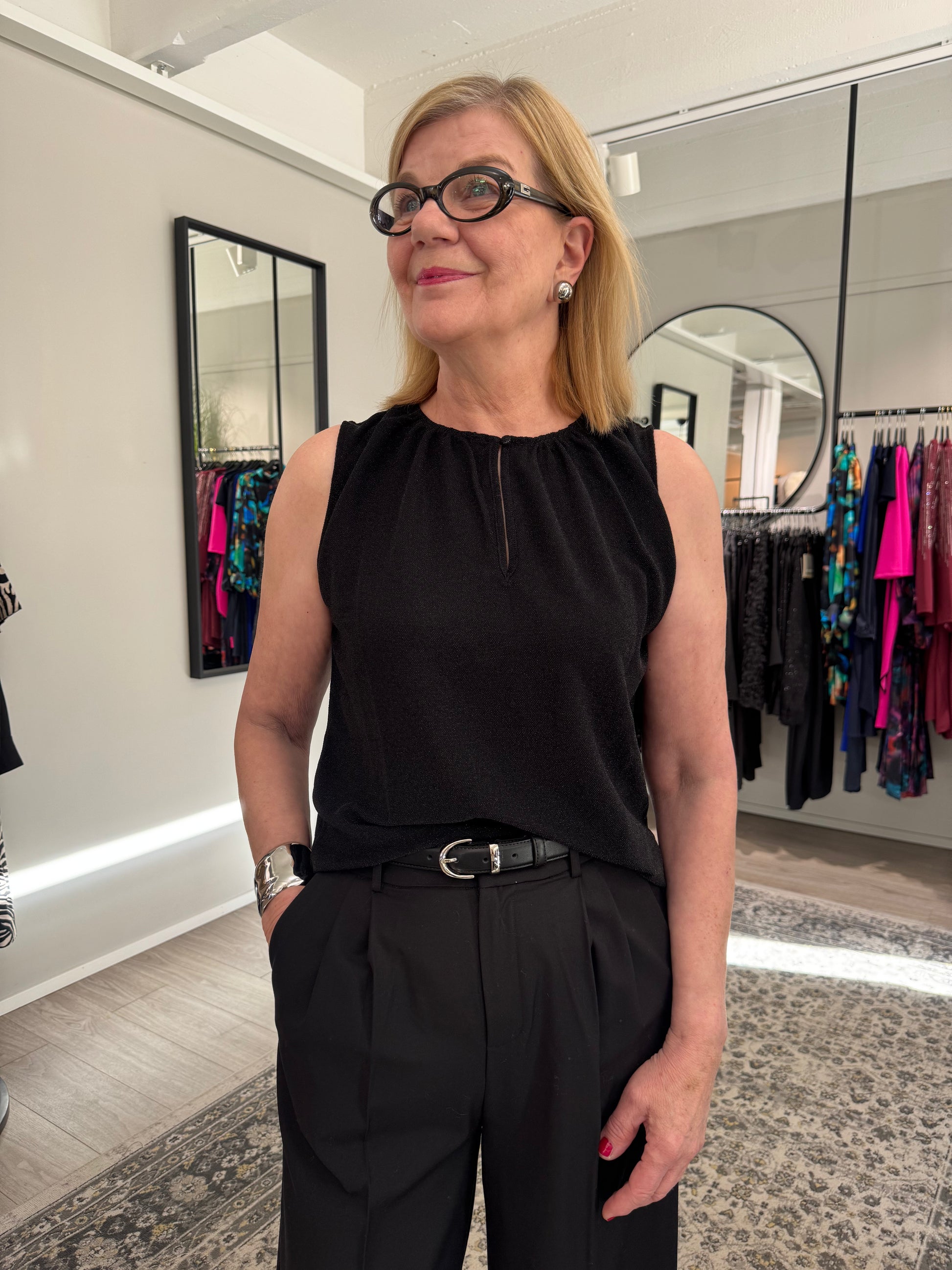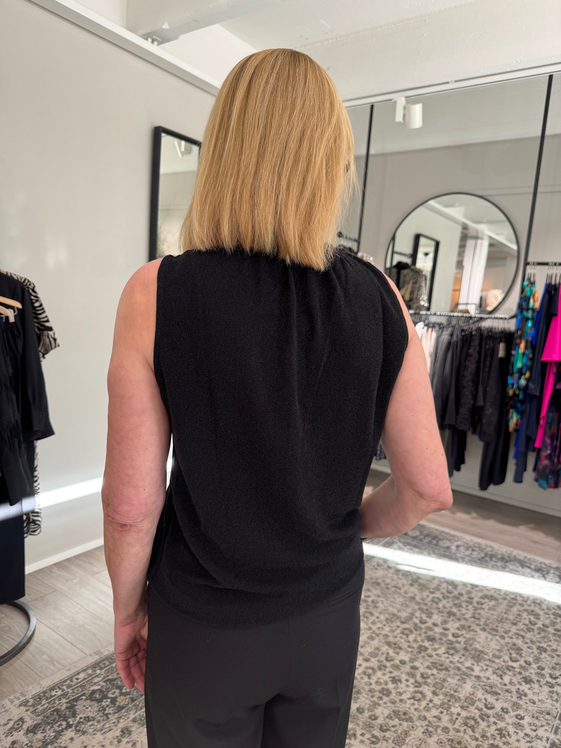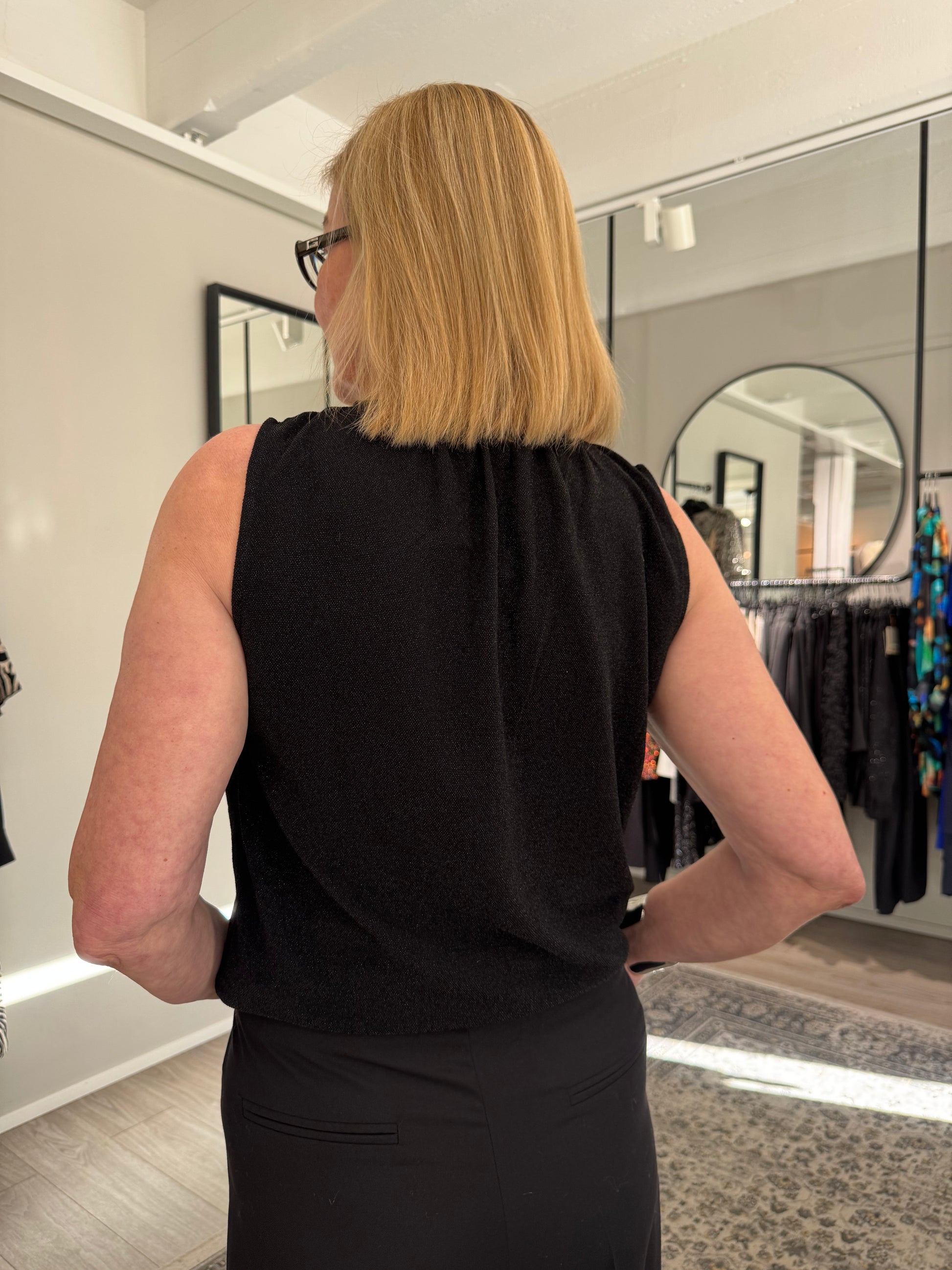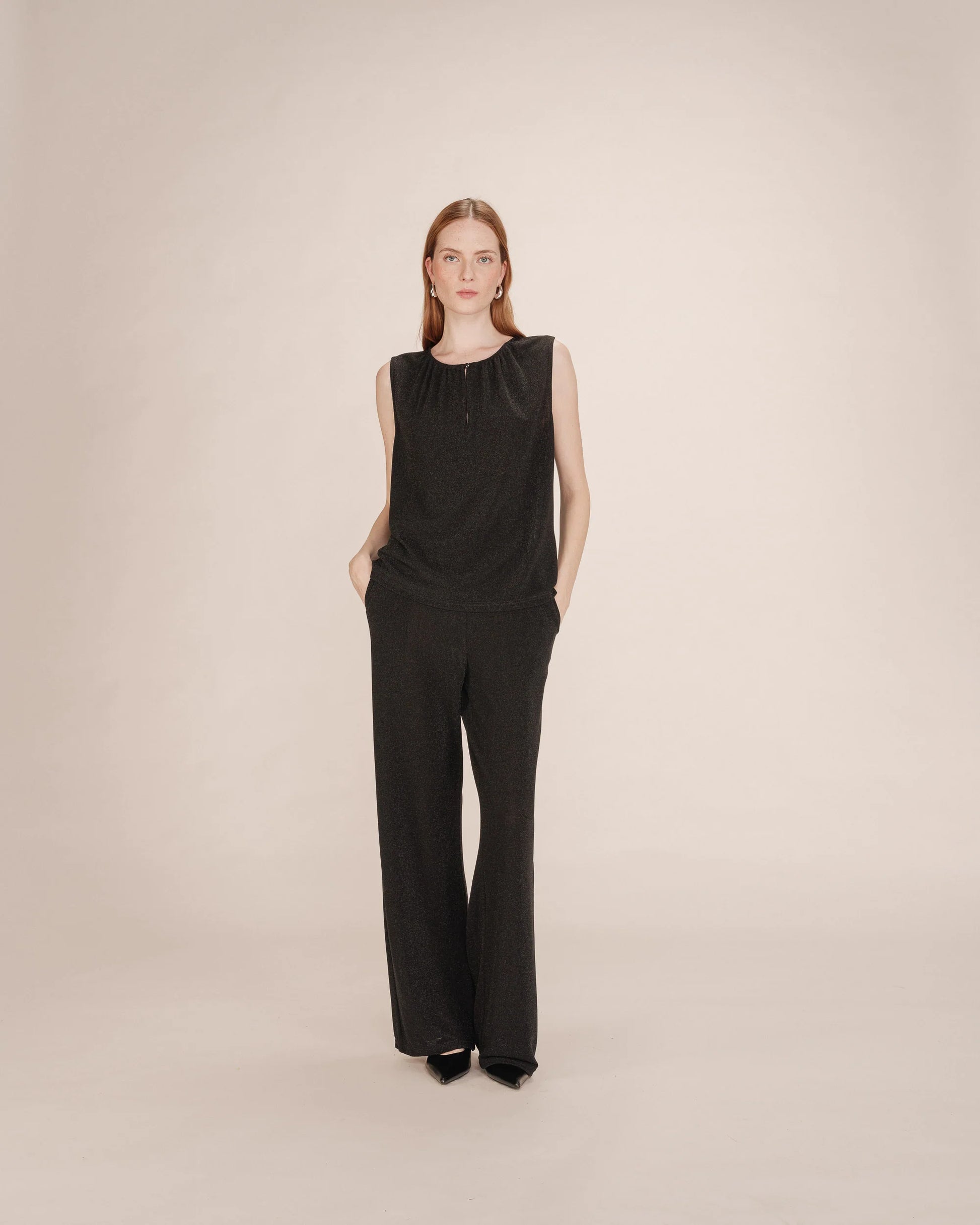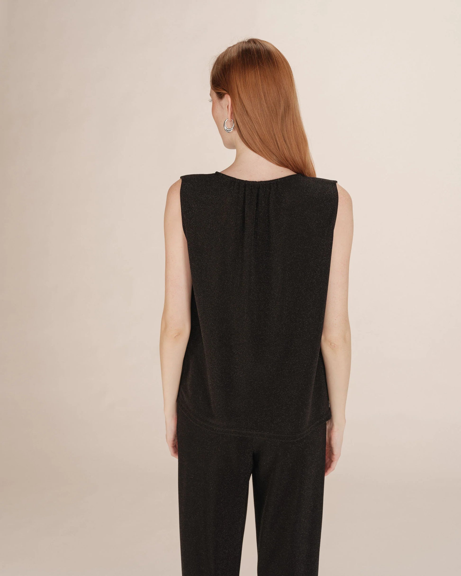 Hillitysti kimaltava Grace & Mila Texto lurextoppi, jossa pyöreä pääntie napillisella halkiolla. Grace & Mila Texto topissa on suora, väljä malli ja ohut, joustava materiaali.