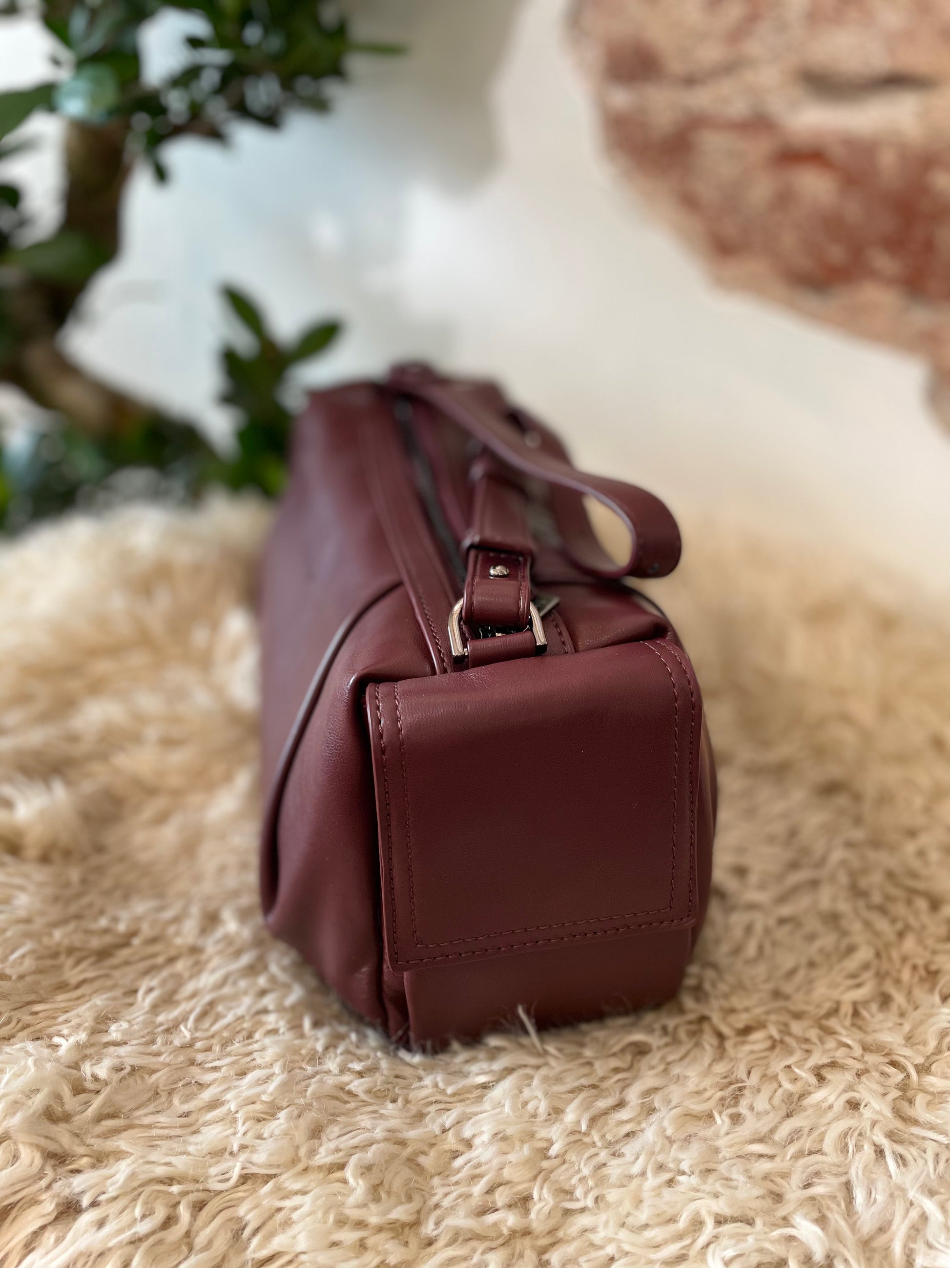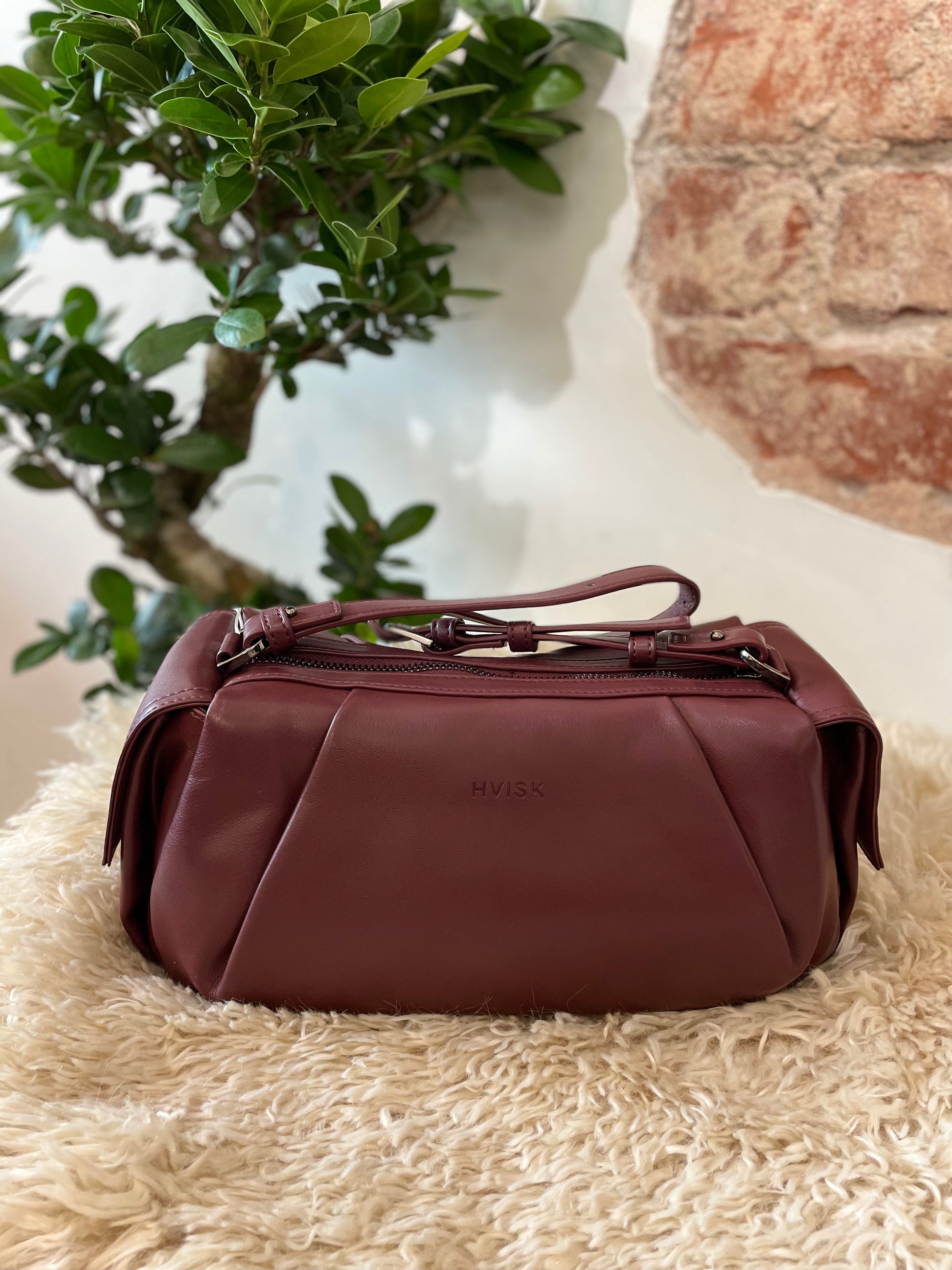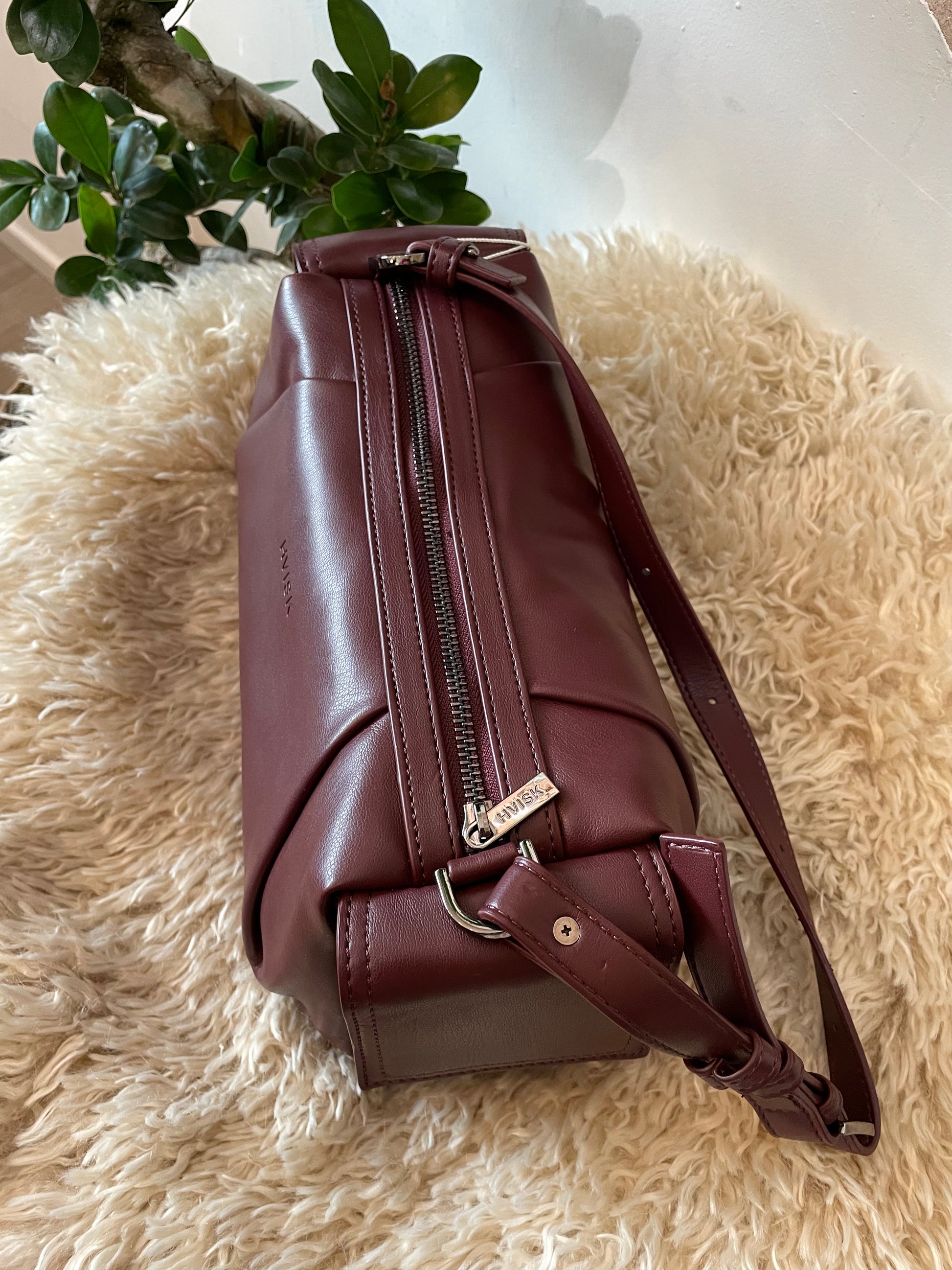 Putkimainen Hvisk elbie soft structure laukku lyhyellä olkahihnalla. Laukussa on vetoketjukiinnitys, molemmissa päissä läpälliset taskut. Sisäpuolella vetoketjullinen pikkutasku. Hvisk laukku on valmistettu erittäin pehmeästä keinonahkasta.