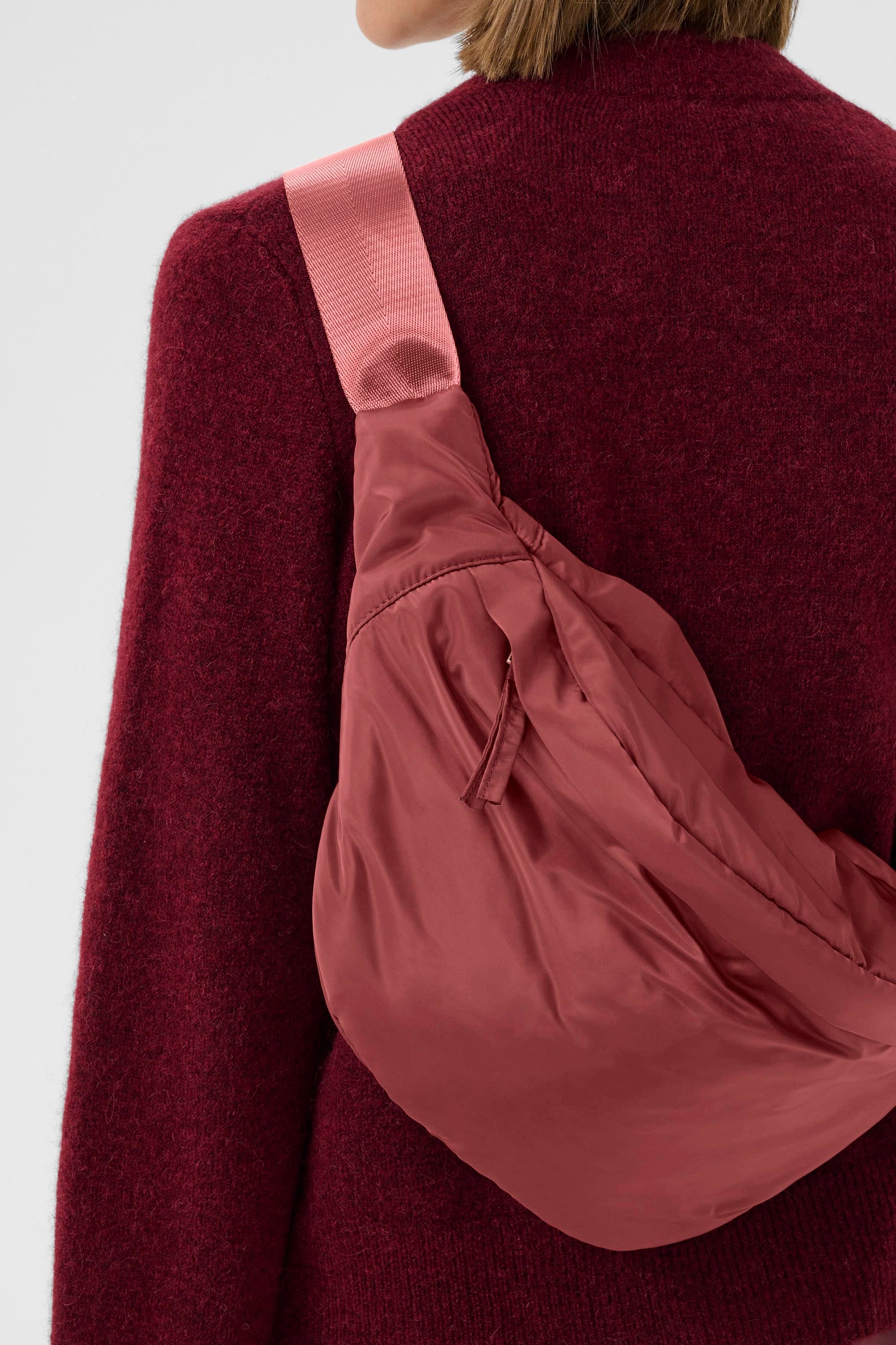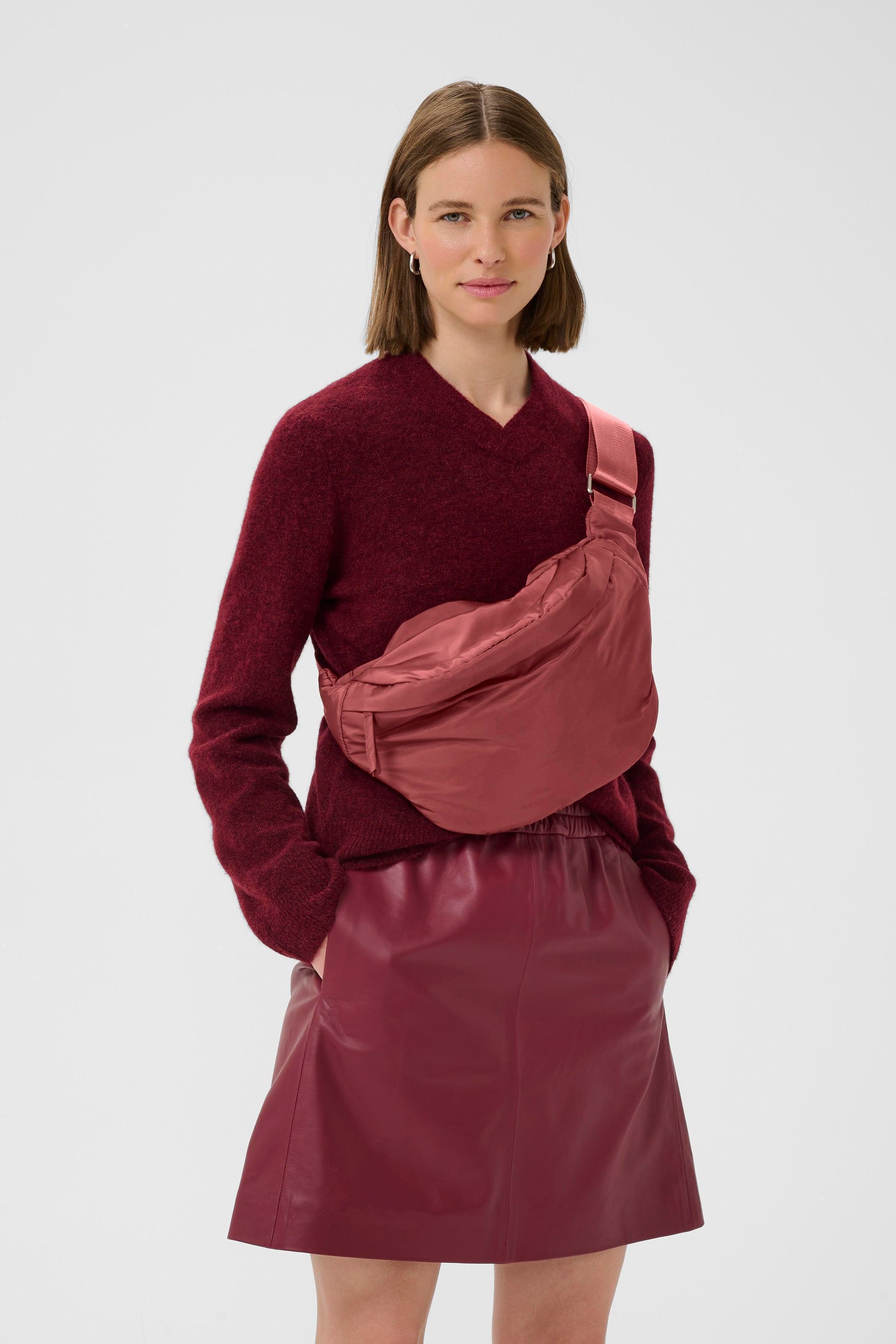 Muhkea InWear Asli toppalaukku kiiltävässä viininpunaisessa sävyssä. Laukussa on leveä, säädettävä olkahihna, sekä vetoketjulliset taskut.