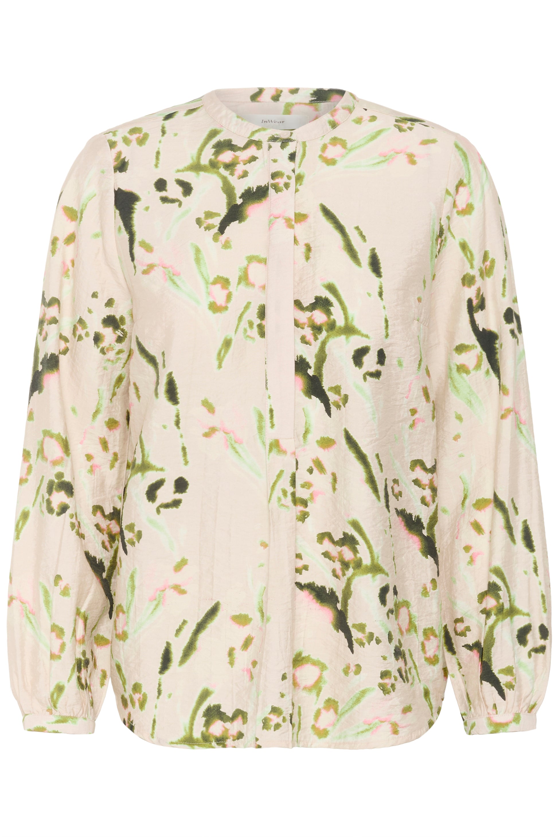 Kevyestä viskoosista valmistettu InWear Avalon pusero, jossa edessä osittainen nappilista ja selässä rypytys. InWear Avalon puserossa on väljähkö, suora malli ja pyöristetty helma.
