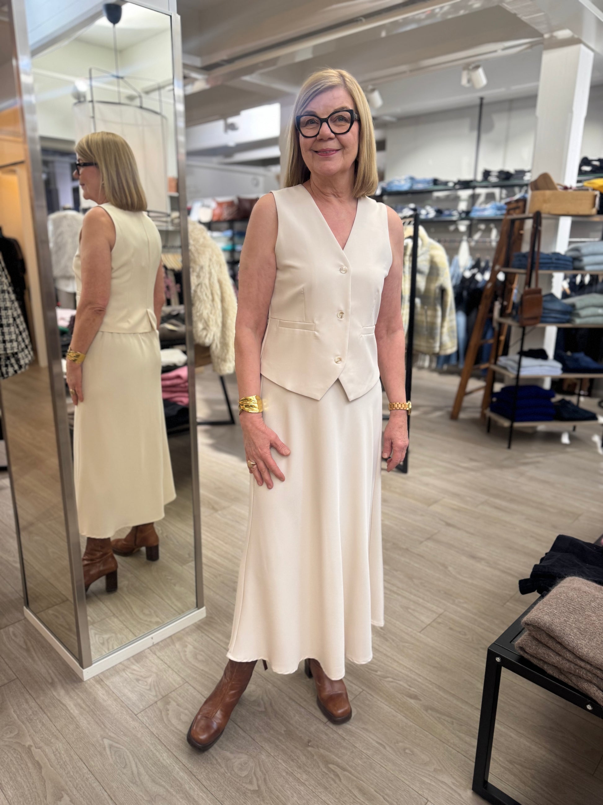 ISay Josia hame on ajaton ja elegantti. Kevyen A-linjaisen istuvuutensa ansiosta kangas laskeutuu kauniisti, sekä vyötäröllä takana oleva kuminauha varmistaa mukavan ja joustavan istuvuuden. Hieman joustava materiaali tarjoaa sekä mukavuutta että liikkuvuutta, joten hame sopii erinomaisesti sekä arkeen että juhlaan.