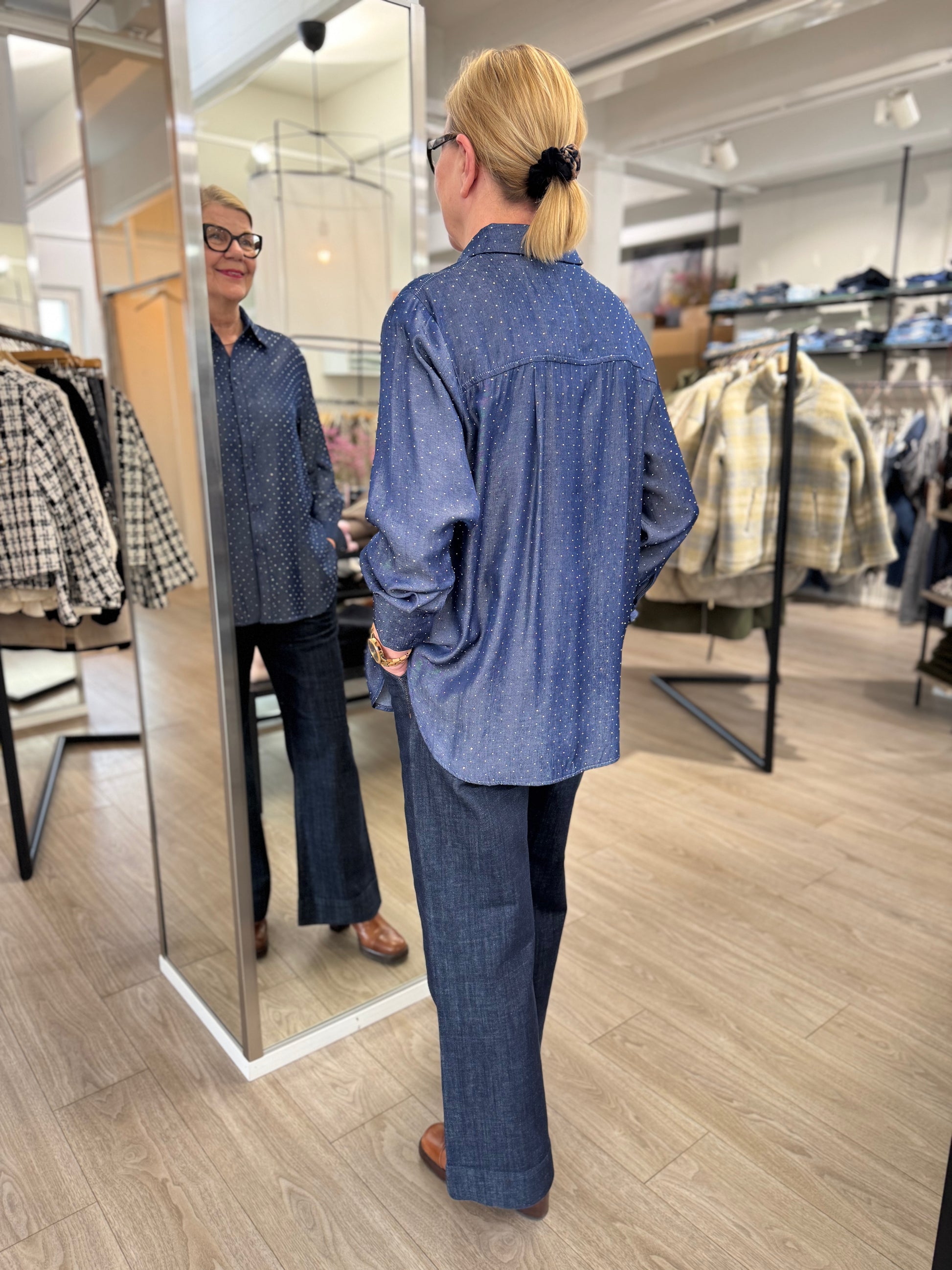 ISay Kate paidassa on perinteinen kaulus, nappikiinnitys ja pitkät hihat hihansuilla. Paita on valmistettu pehmeästä, farkkua muistuttavasta kevyestä viskoosisekoitteesta, joka laskeutuu kauniisti ja tuntuu mukavalta ihoa vasten. Väljä istuvuus tarjoaa runsaasti liikkumisvapautta ja rennon ilmeen. Yhdistä se farkkujen kanssa arkeen tai housujen kanssa juhliin.