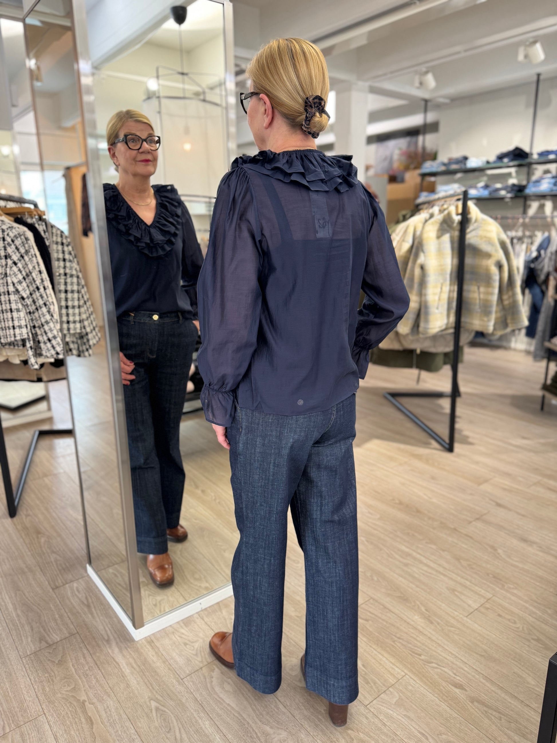 ISay Klara Flounce puserossa on pitkät, leveät hihat ja kuminauha hihansuissa, mikä lisää eleganttia ilmettä. Kevyesti kiiltävä materiaali tuntuu pehmeältä ihoa vasten ja laskeutuu kauniisti vartalon päällä. Klara Flounce -pusero on sekä mukava että tyylikäs – ja helppo yhdistää farkkujen, väljien housujen tai hameen kanssa.