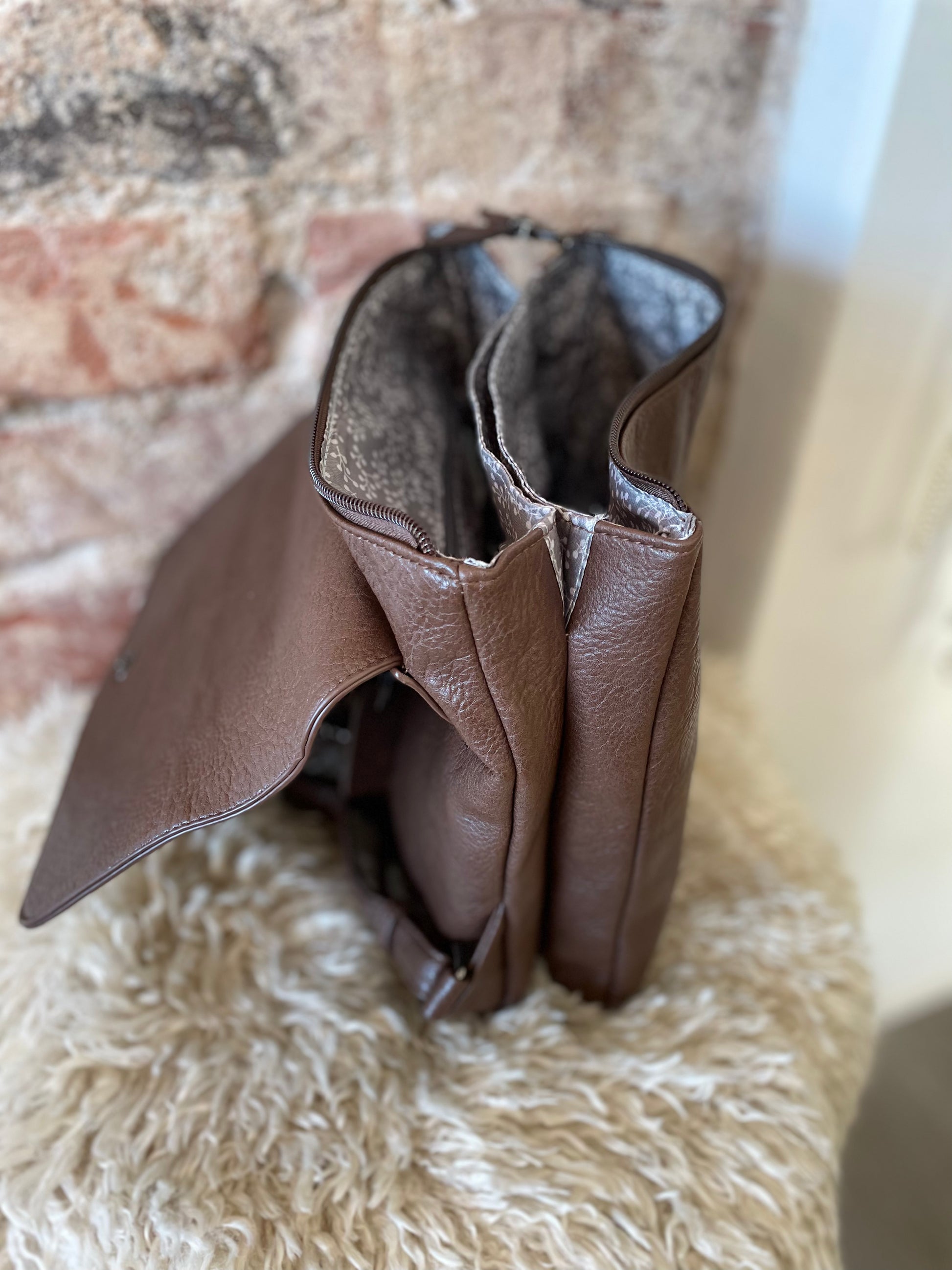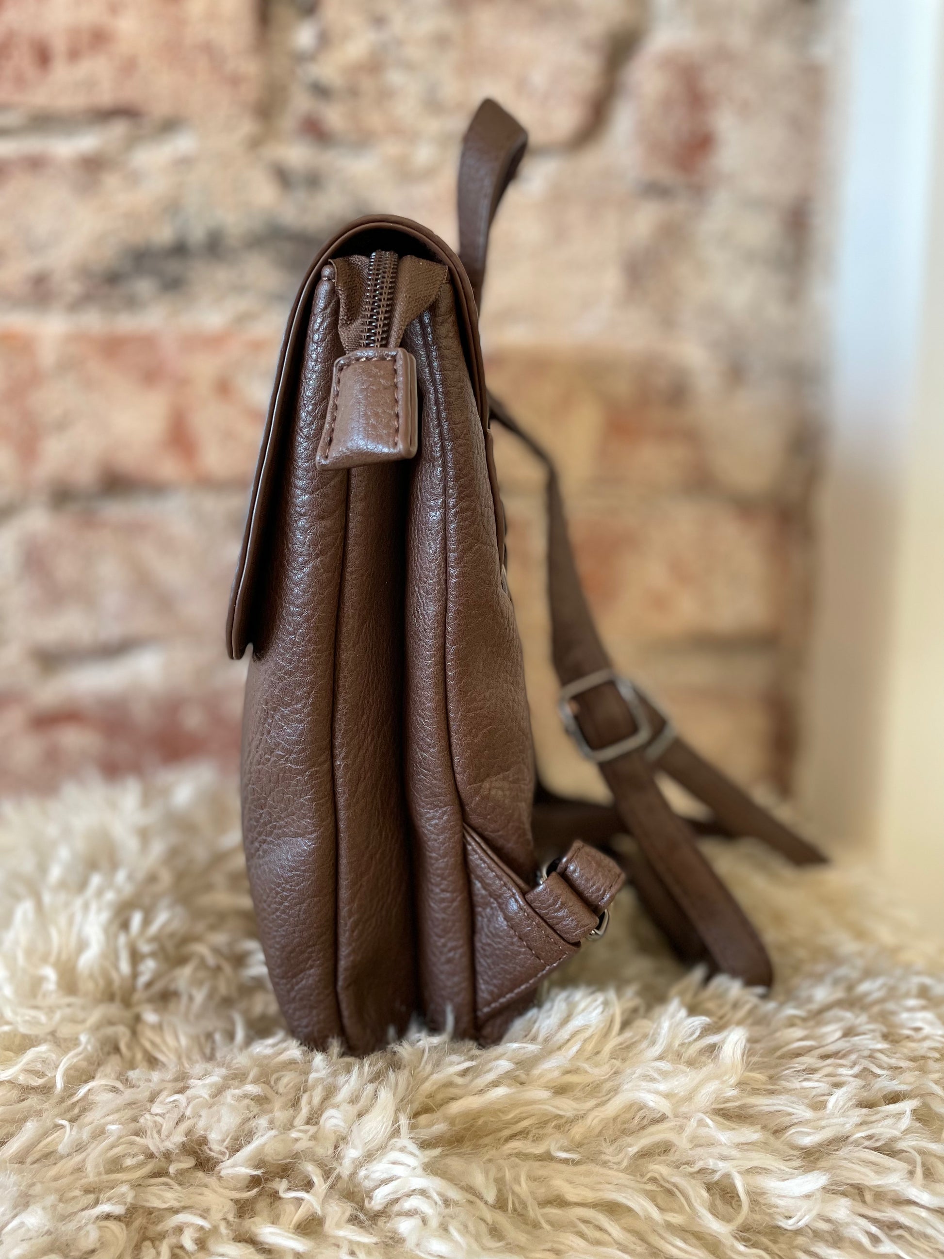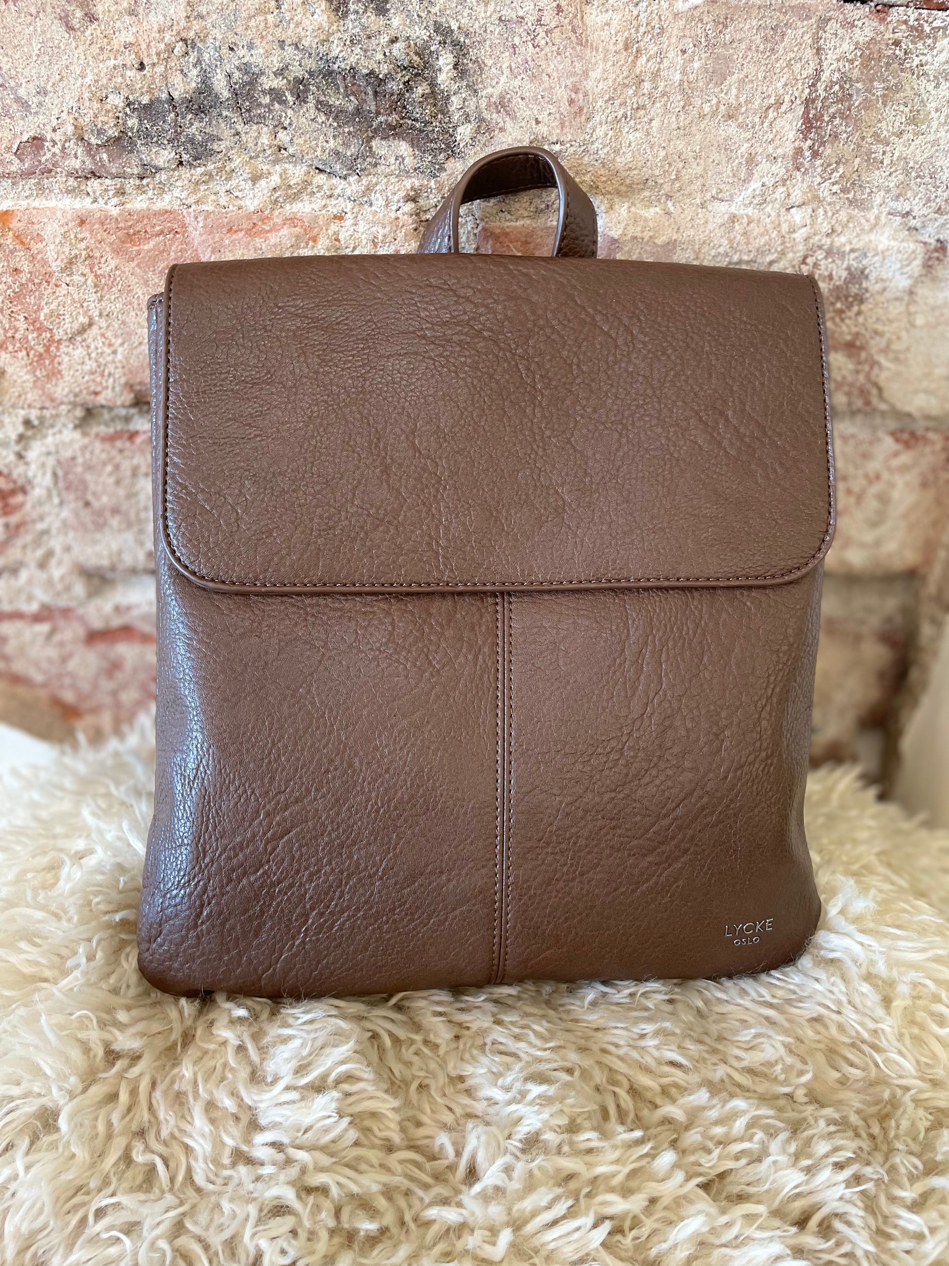 Syksyisen ruskeasävyinen, kompaktin kokoinen Lycke Oslo Grimstad pikkureppu säädettävillä olkahihnoilla. Repussa on kaksi erillistä osiota ja takana vetoketjullinen pikkutasku.