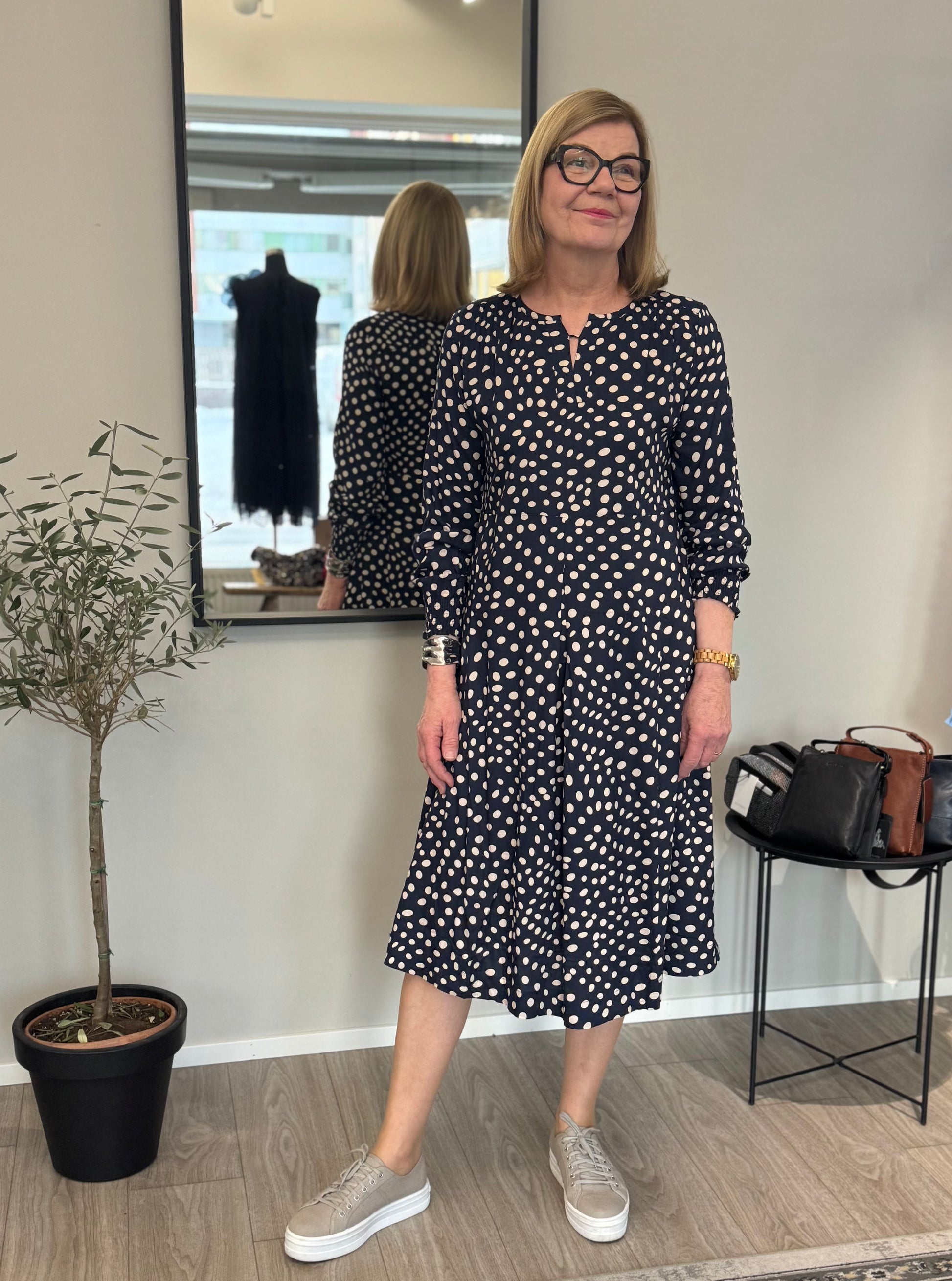 Naisellinen Masai Nexora mekko, jossa edessä laskos ja takana selässä pieni joustava kuminauha. Mekossa on kaunis yksityiskohta pääntiellä ja hihansuissa joustavat kuminauhat.