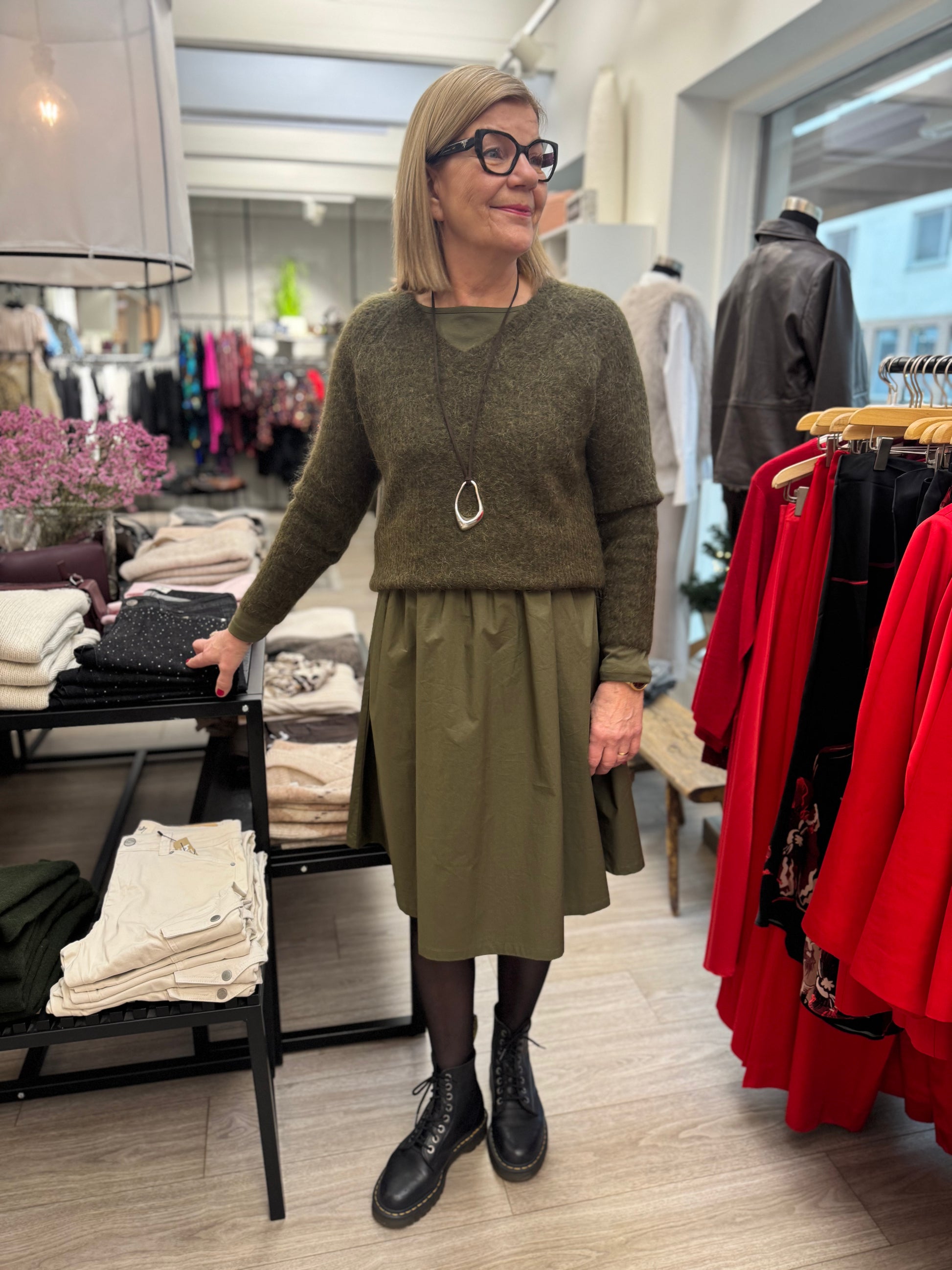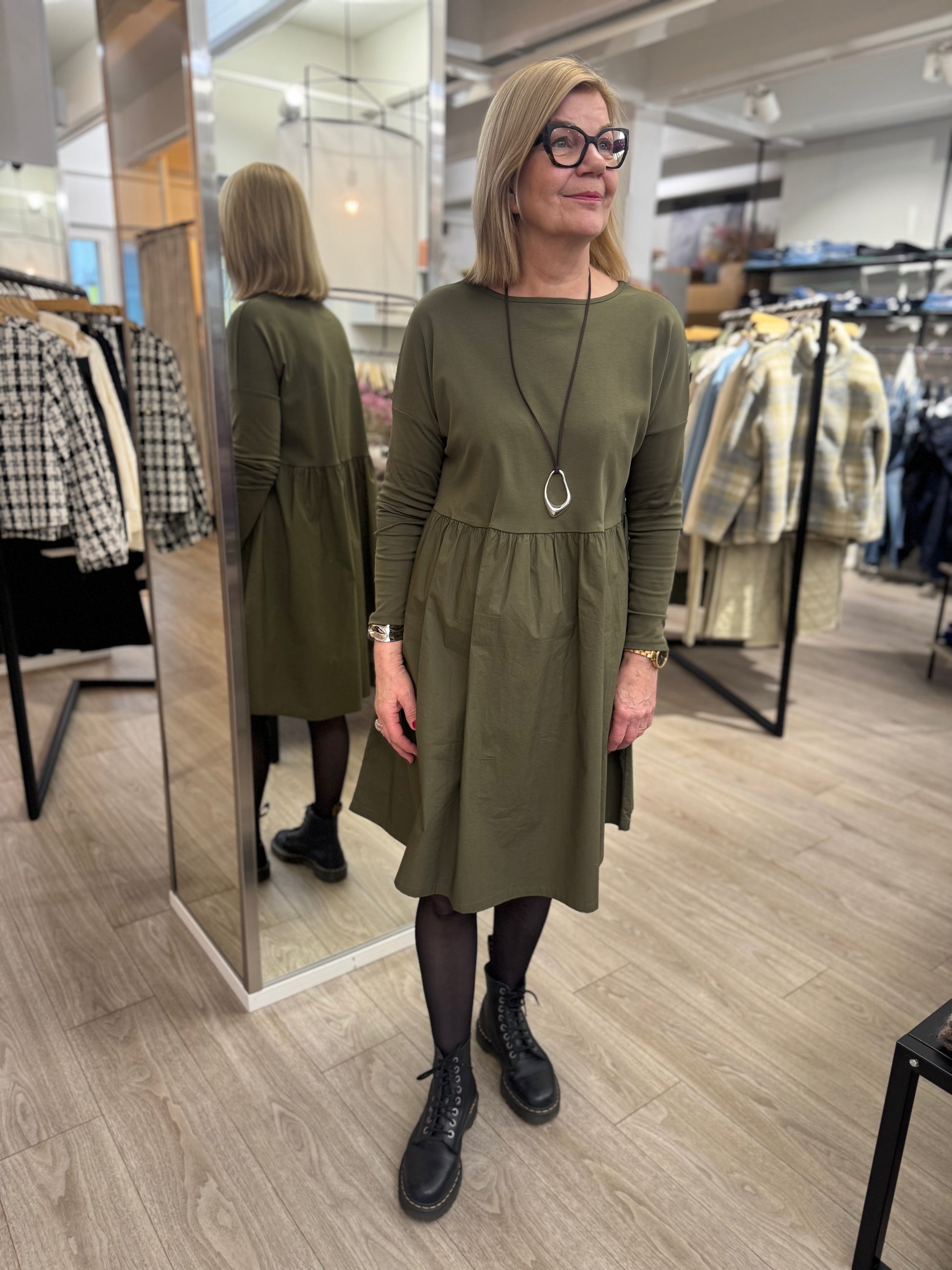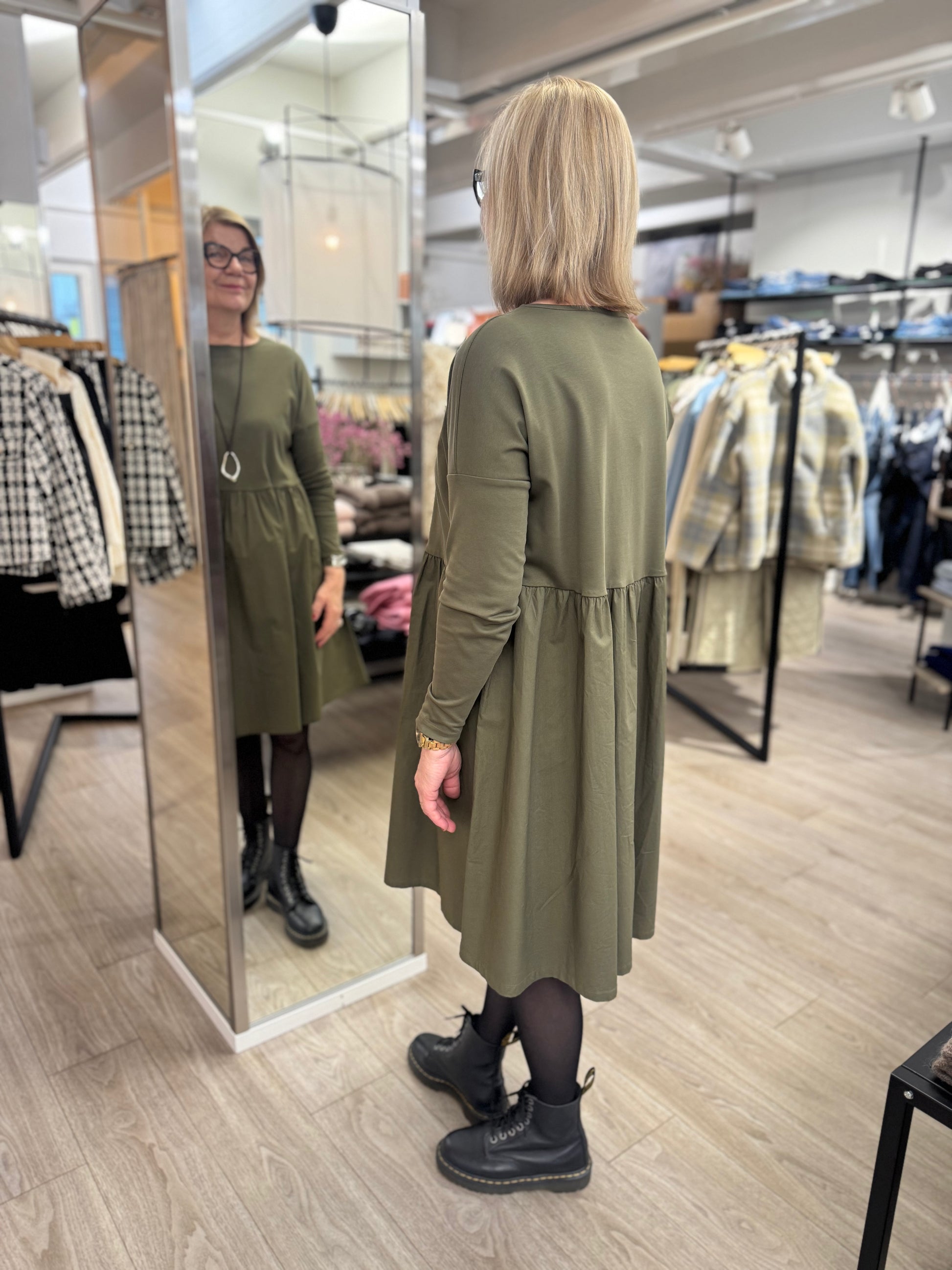 Naisellinen Masai Navira mekko, jossa on miellyttävän joustava trikoinen yläosa ja puuvillapopliininen alaosa. Masai Navira mekossa on pyöreä pääntie ja madalletut olkapäät. Mekossa on väljä, rento malli.