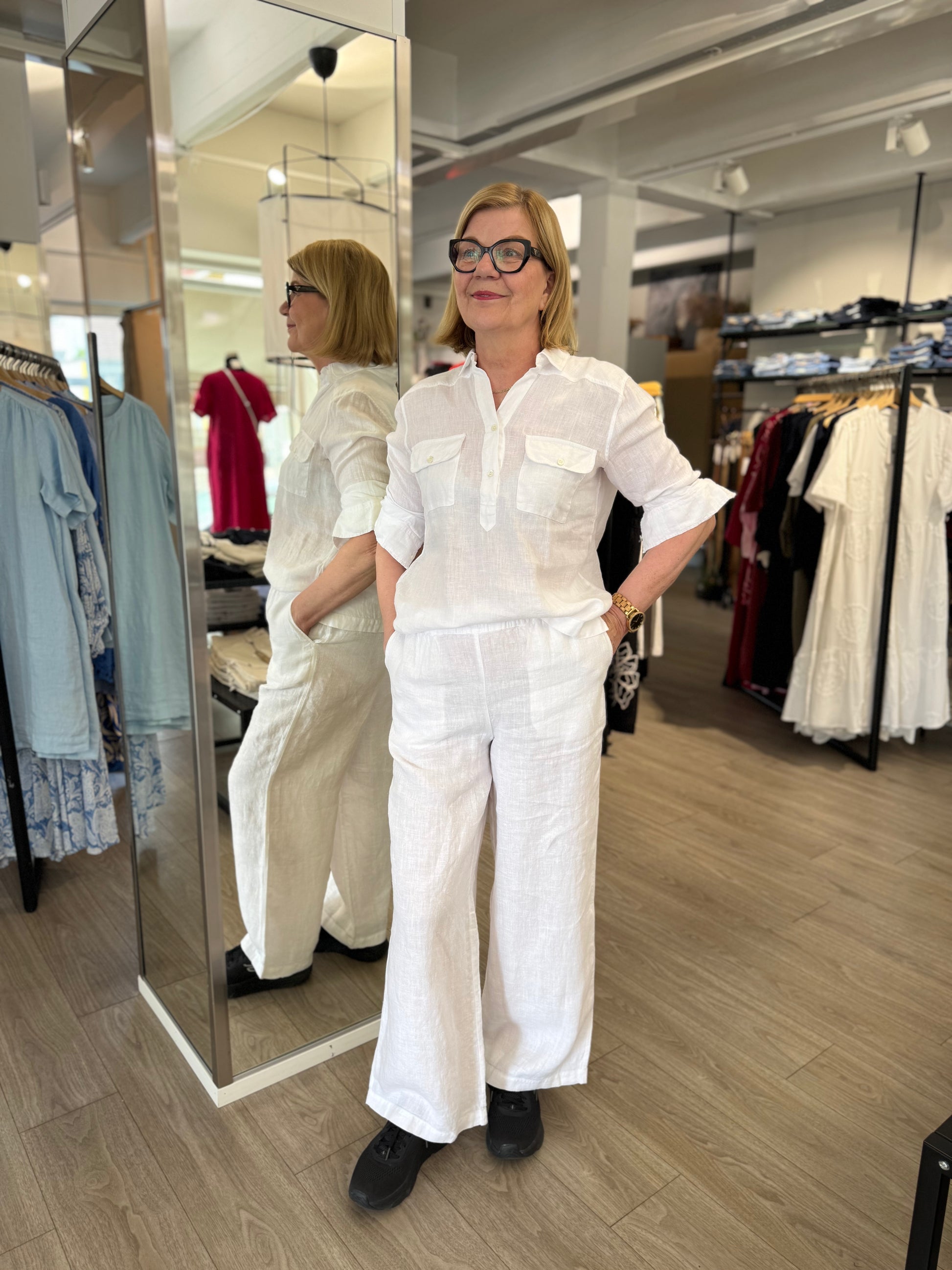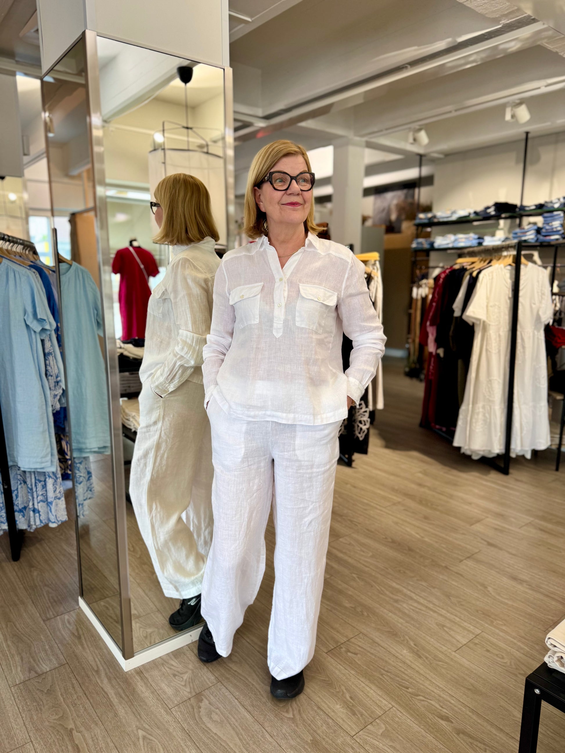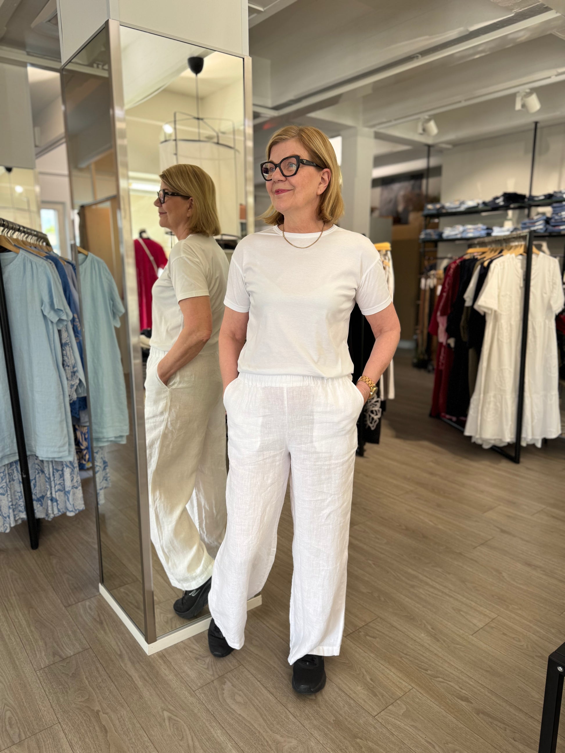 Ihanan kesäiset Mos Mosh Emmi pellavahousut kuminauhavyötäröllä ja sivutaskuilla.