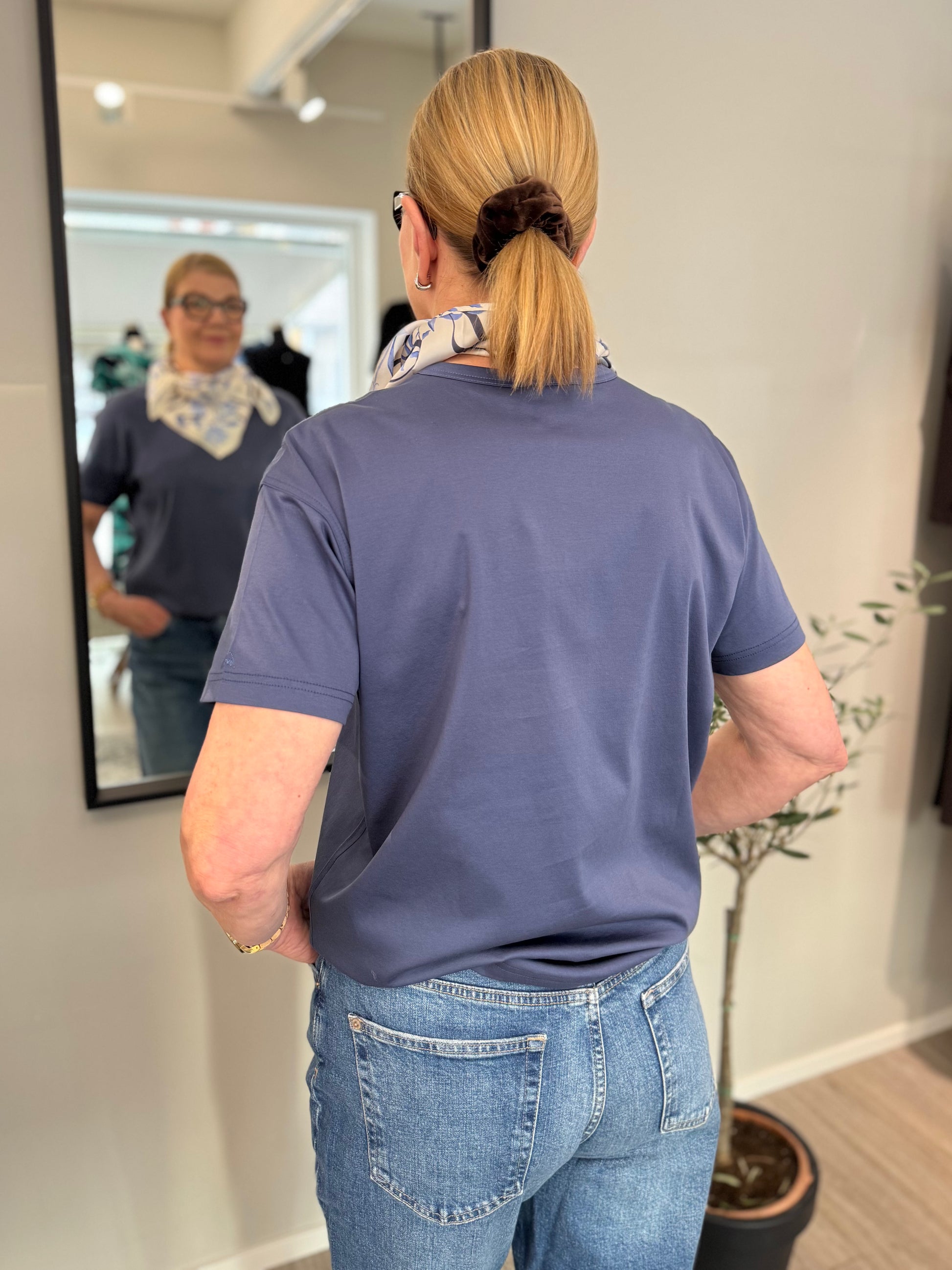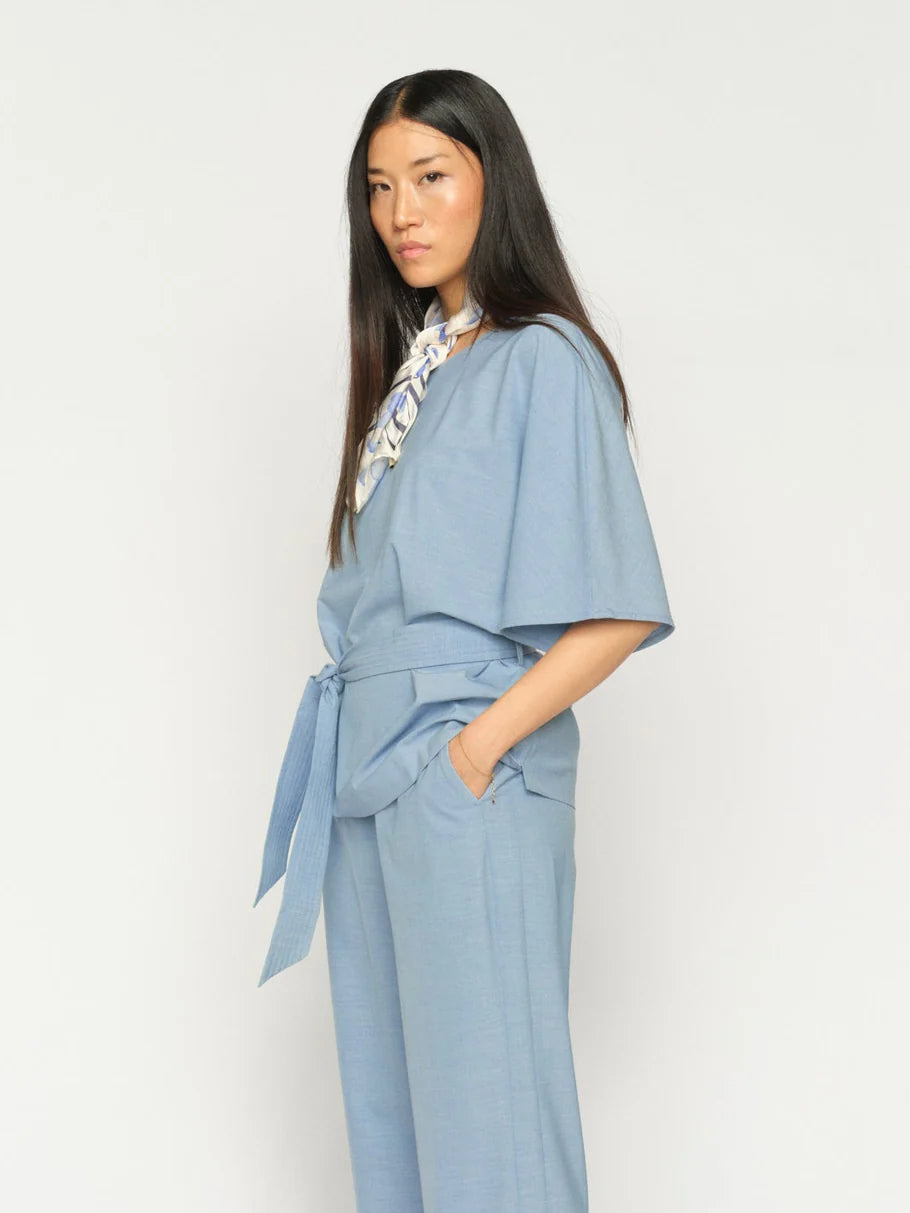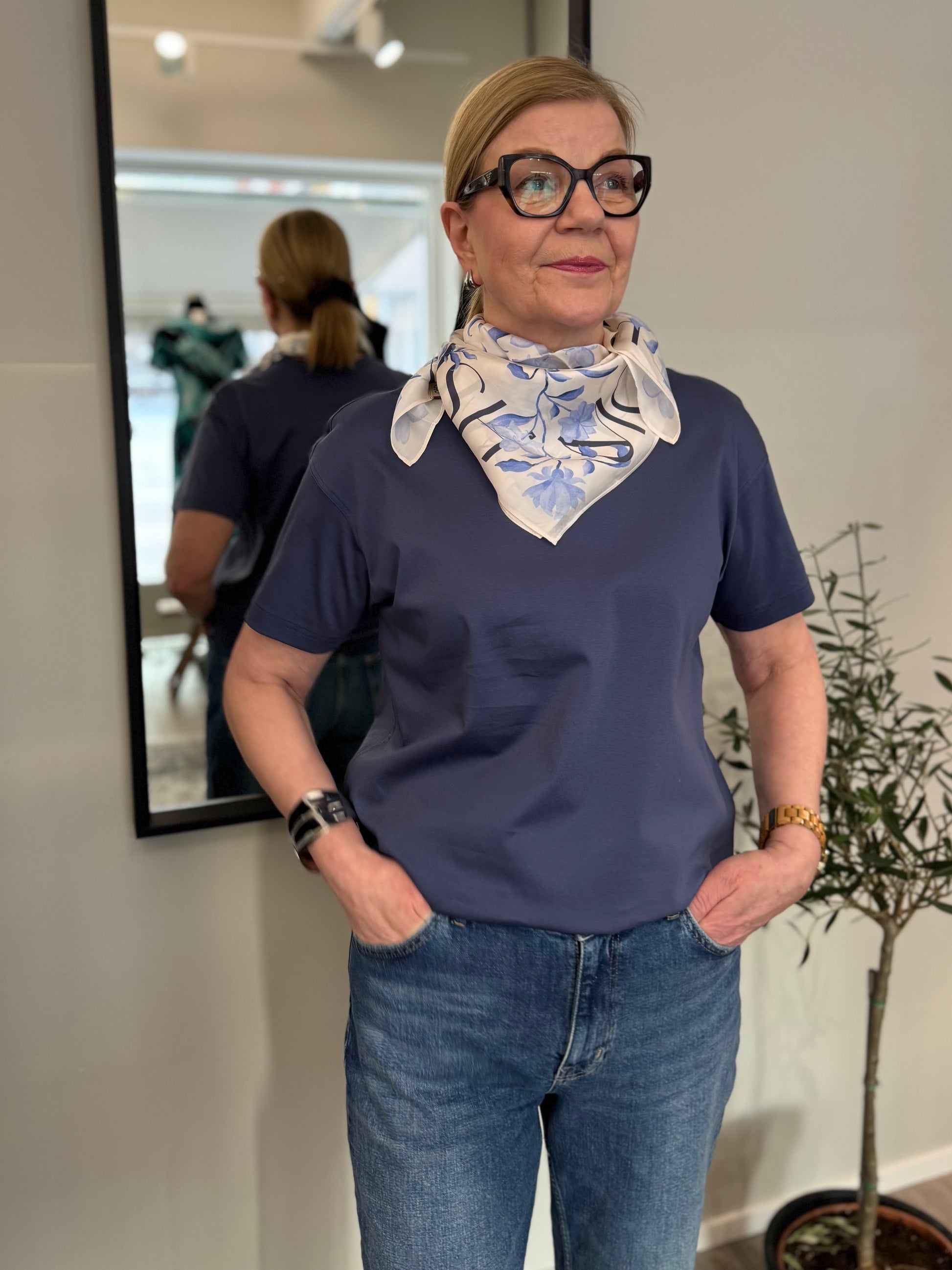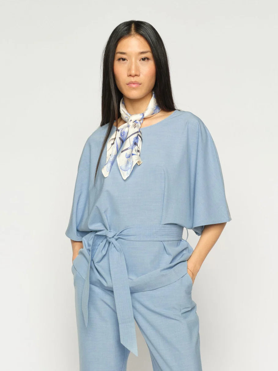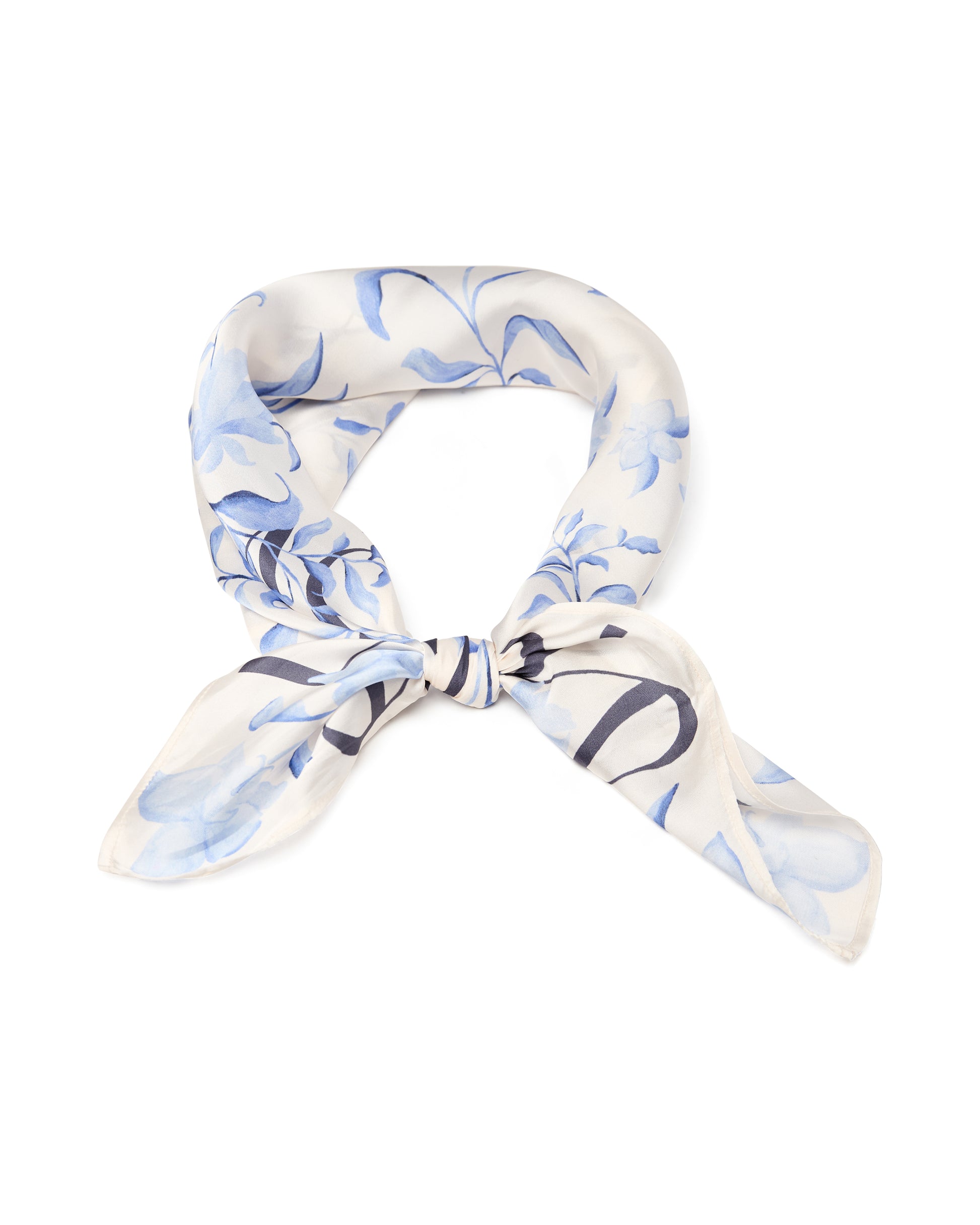 Hennon sävyinen Mos Mosh Orchid pikkuhuivi, jossa vaalea pohja ja laventelinsininen kukkakuosi.