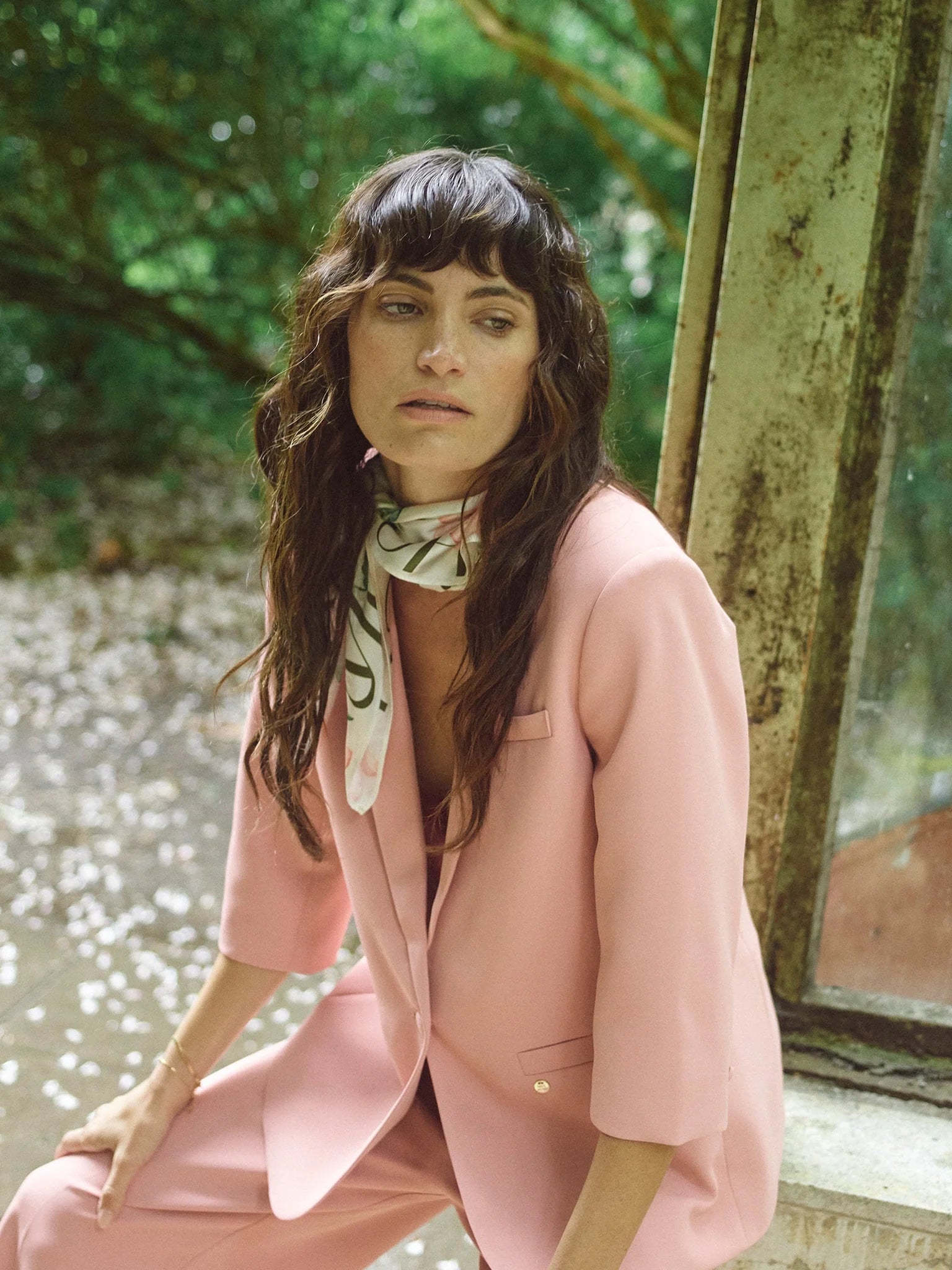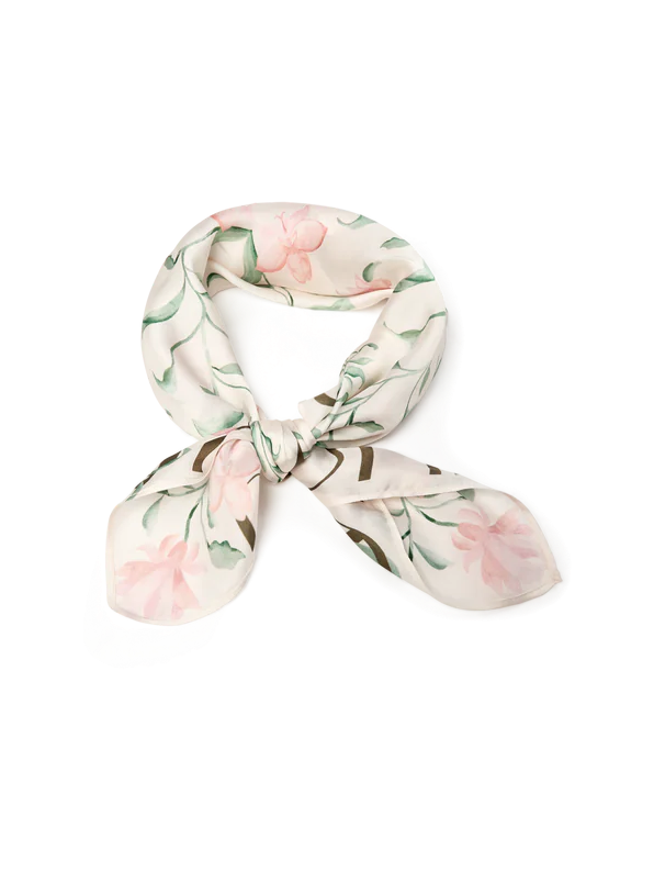 Hennon sävyinen Mos Mosh Orchid pikkuhuivi, jossa vaalea pohja ja vaaleanvihreä/-punainen kukkakuosi.