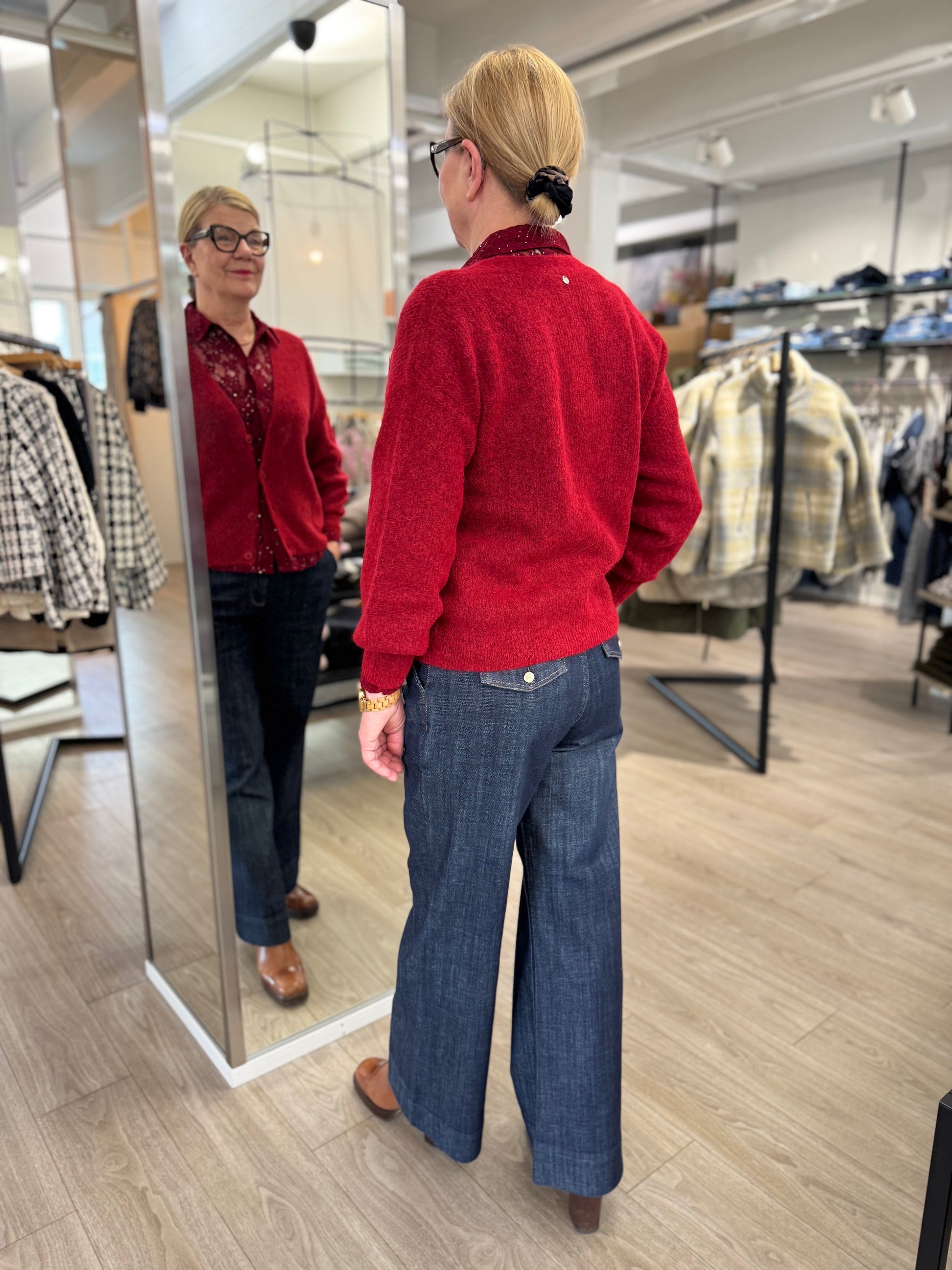 Lyhyt ja väljän mallinen Mos mosh Thora neuletakki v-pääntiellä ja samansävyisillä napeilla. Valmistettu pehmeästä ja kevyestä alpakka/villa sekoitteesta, joka joustaa mukavasti. Mos Mosh Thora neuletakissa on hihansuissa joustin-neulokset.