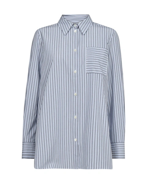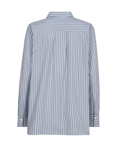 Tyylikäs Mos Mosh Elinda paitapusero raikkaan sinivalkoisella raidoituksella. Mos Mosh Elinda puserossa on pyöristetty, takaa hieman pidempi helma, sekä edessä on rintatasku. Miellyttävän sileä materiaali.