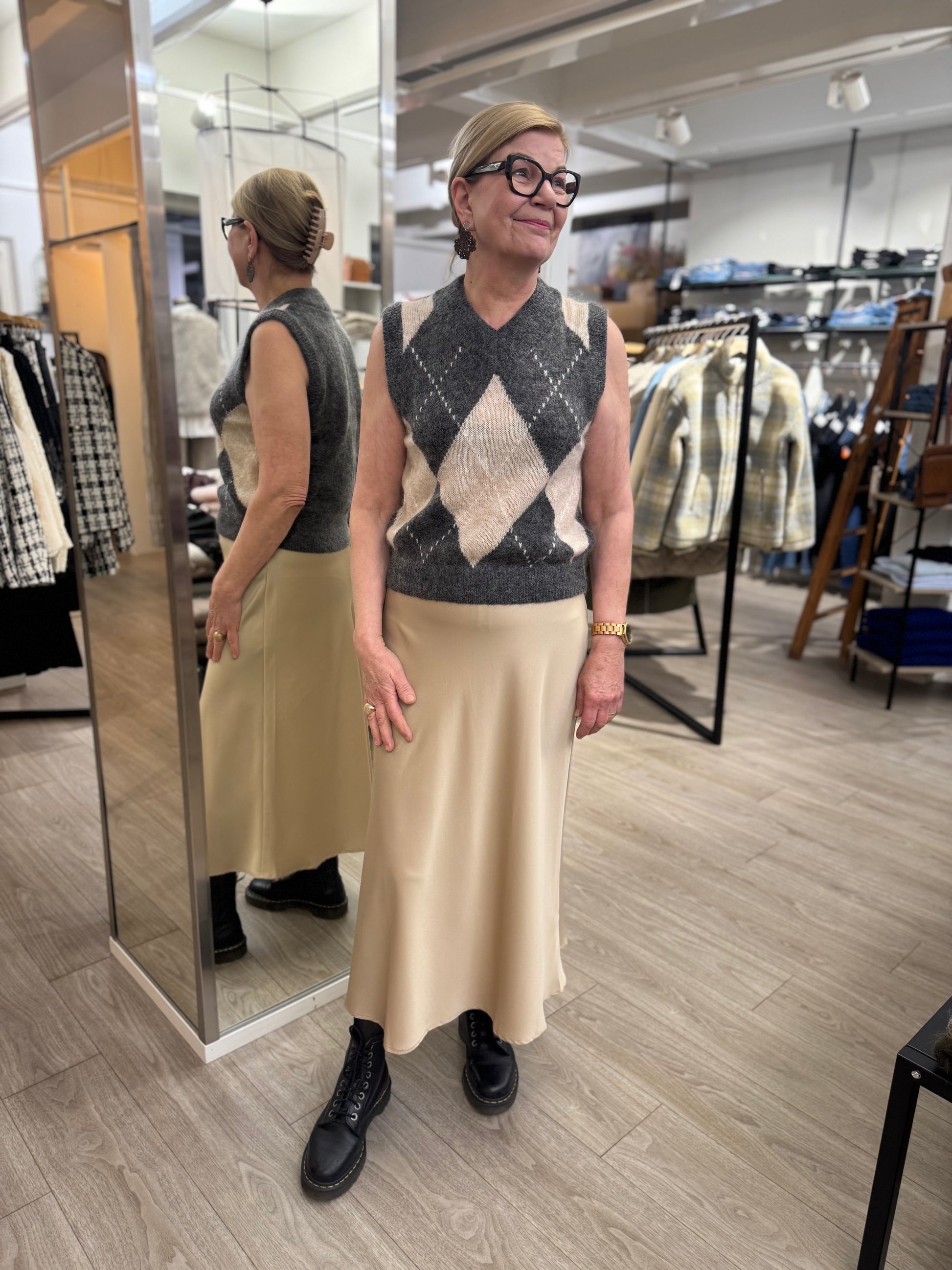 Naisellinen Moves Gebry hame, kauniilla satiinipinnalla ja maksimitalla. Moves Gebry hame on malliltaan A-linjainen ja laskeutuva. Hameessa on vyötäröllä kuminauha, ja sivulla piilovetoketju.