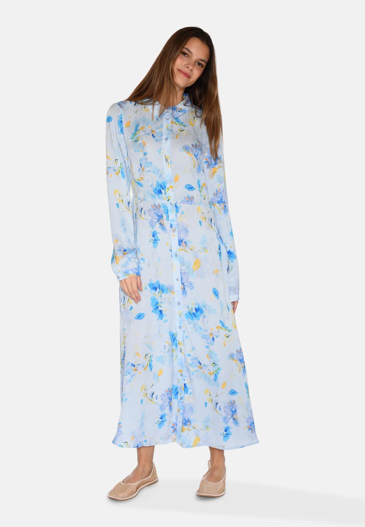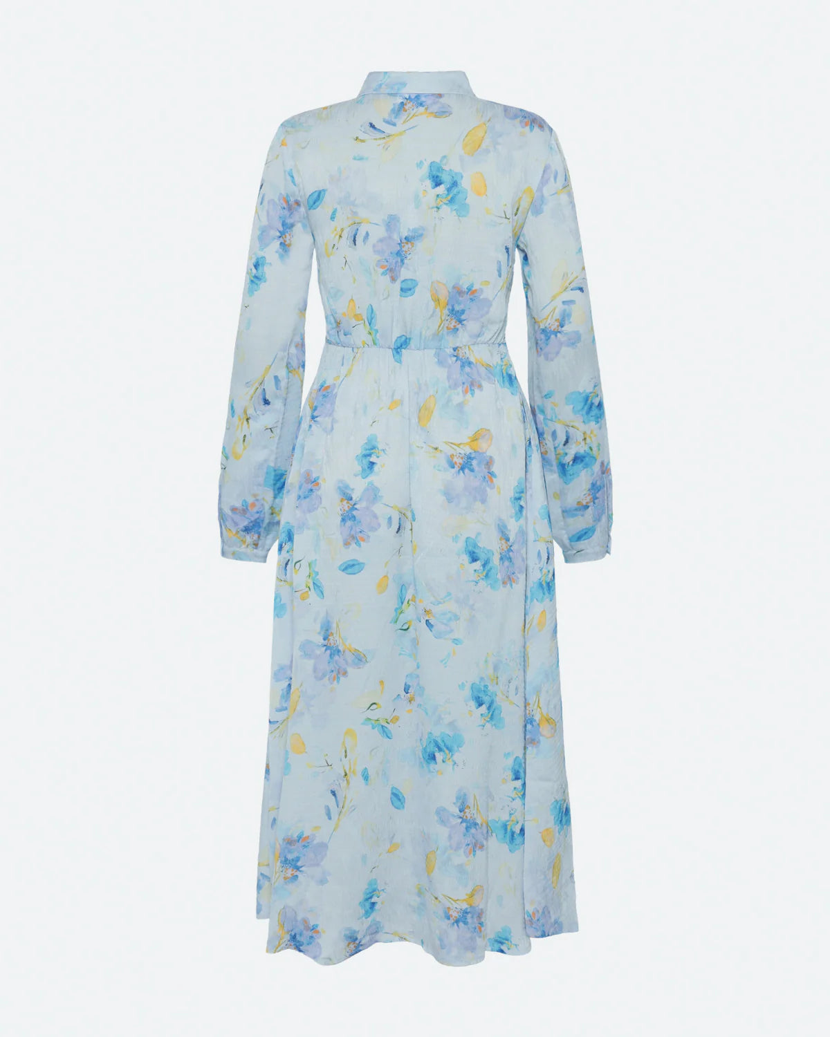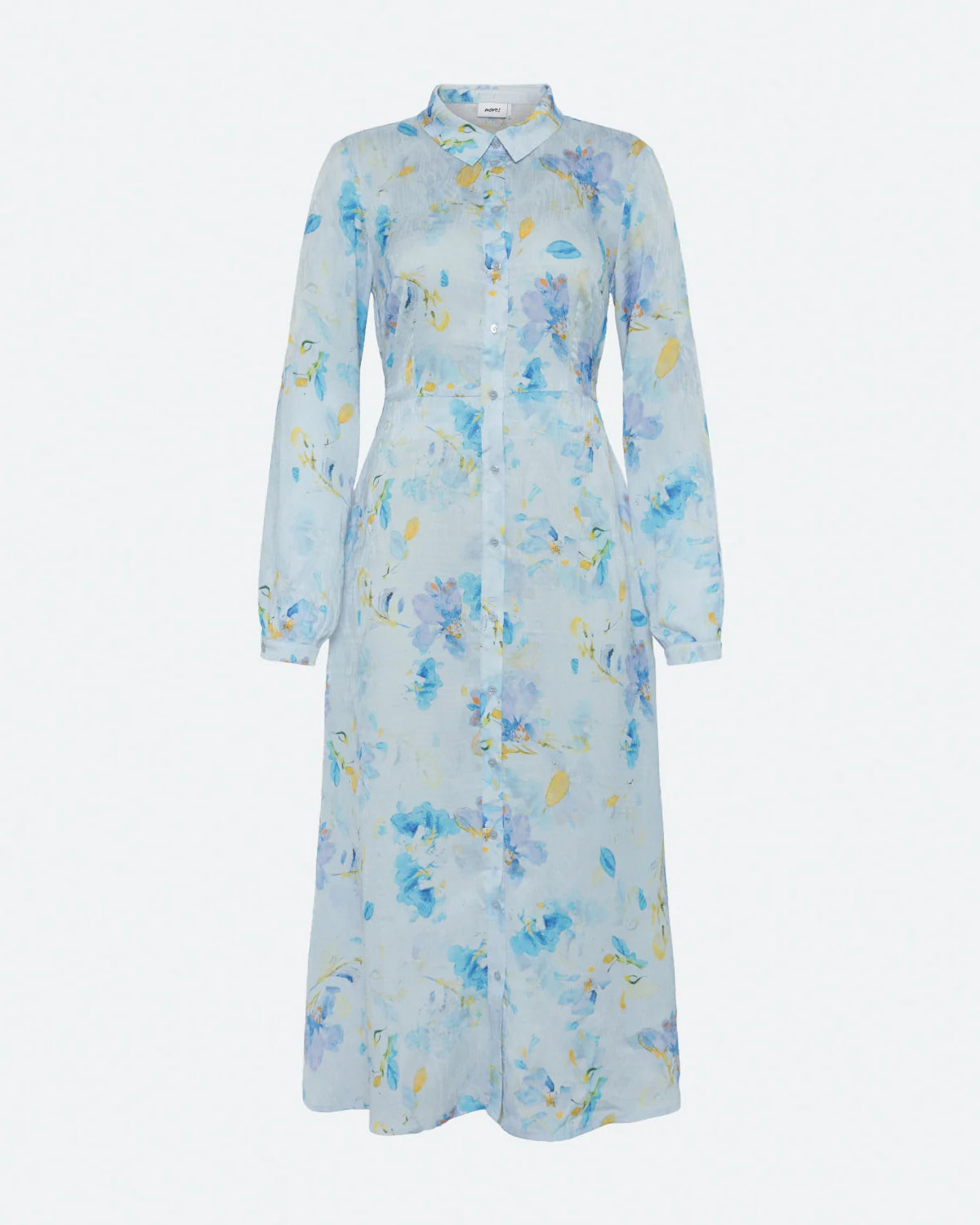 Inula midi-mekko on valmistettu 100 % polyesterista ja se on suunniteltu kauniisti laskeutuvasta vaaleansinisestä materiaalista, jossa on herkkä kukkaprintti. Mekossa on pitkät hihat, klassinen kaulus ja jatkuva nappikiinnitys, mikä antaa sille ajattoman ja hienostuneen ilmeen. Moves Inula mekko istuu ylhäältä napakasti ja siinä on väljä, A-linjainen helma, sekä sivutaskut. Vyötäröllä on poikkileikkaus ja takana kuminauha. Täydellinen mekko niin arkeen kuin juhlaan.