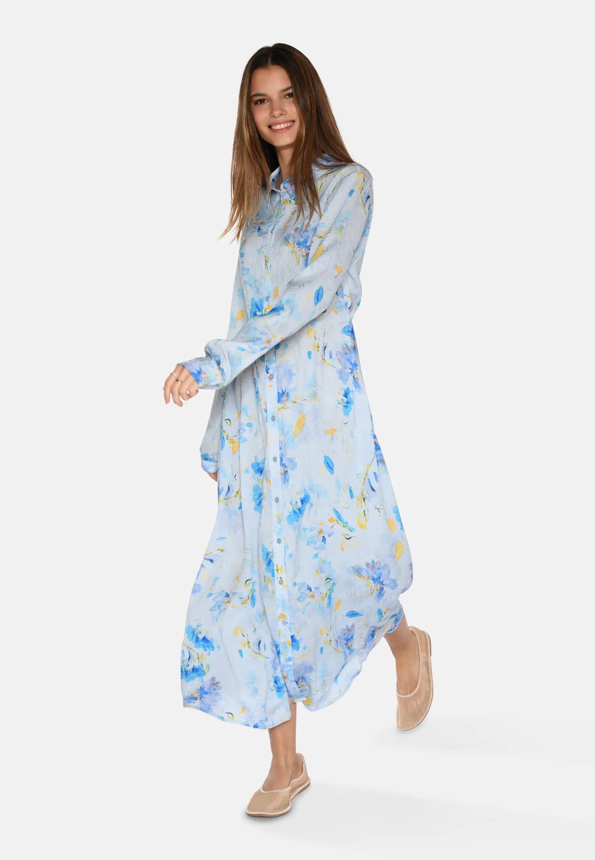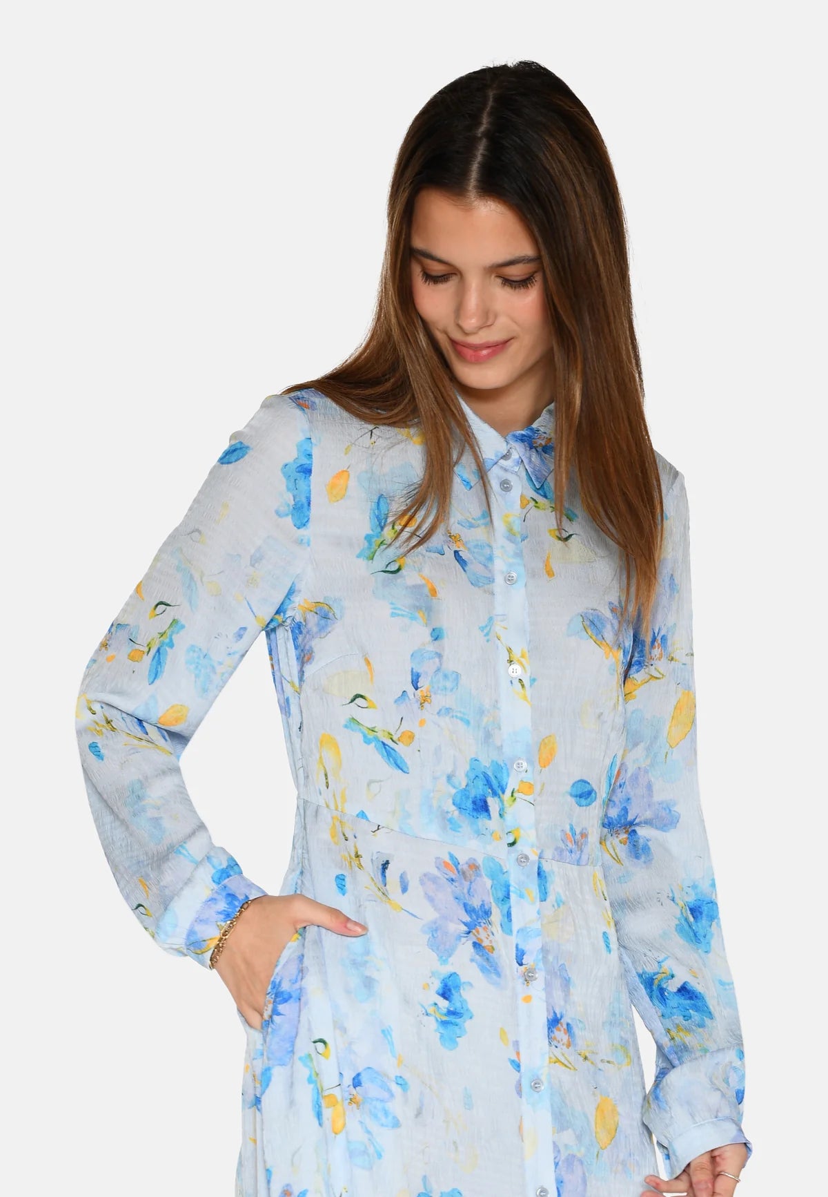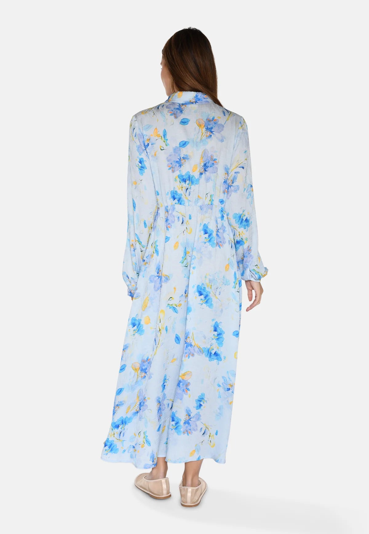 Inula midi-mekko on valmistettu 100 % polyesterista ja se on suunniteltu kauniisti laskeutuvasta vaaleansinisestä materiaalista, jossa on herkkä kukkaprintti. Mekossa on pitkät hihat, klassinen kaulus ja jatkuva nappikiinnitys, mikä antaa sille ajattoman ja hienostuneen ilmeen. Moves Inula mekko istuu ylhäältä napakasti ja siinä on väljä, A-linjainen helma, sekä sivutaskut. Vyötäröllä on poikkileikkaus ja takana kuminauha. Täydellinen mekko niin arkeen kuin juhlaan.