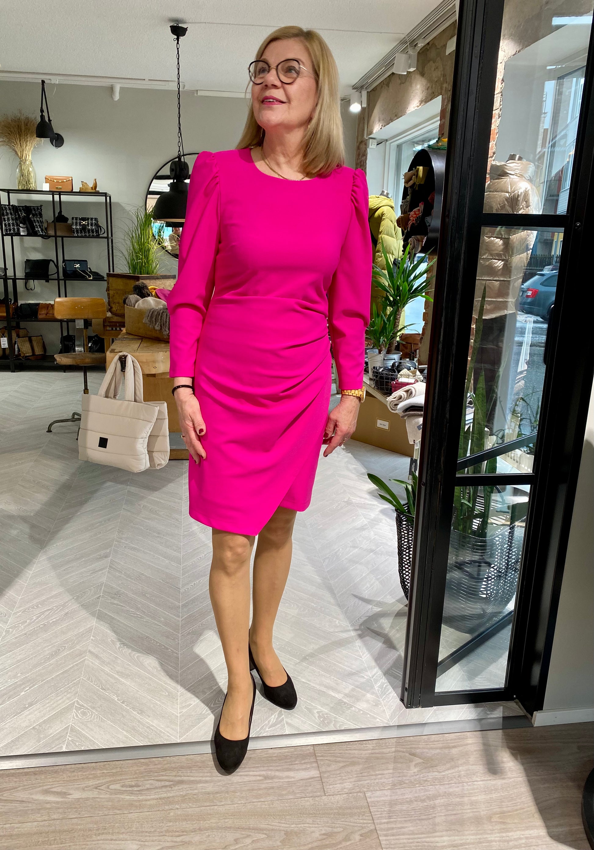 Joseph Ribkoffin räiskyvän pinkki, pitkähihainen mekko, jossa vartaloa imarteleva leikkaus. Miellyttävän napakka ja joustava materiaali. Piilovetoketju takana.