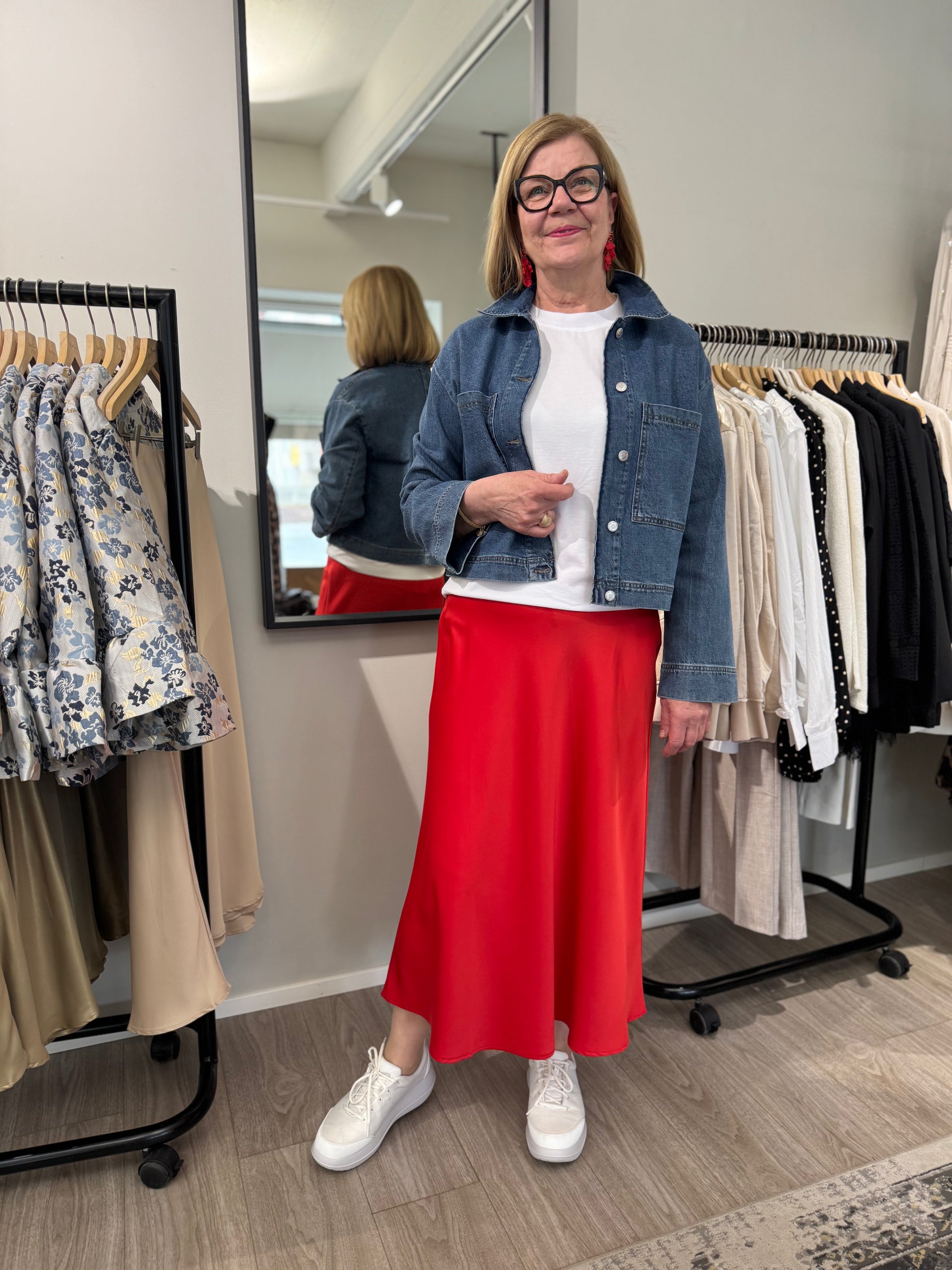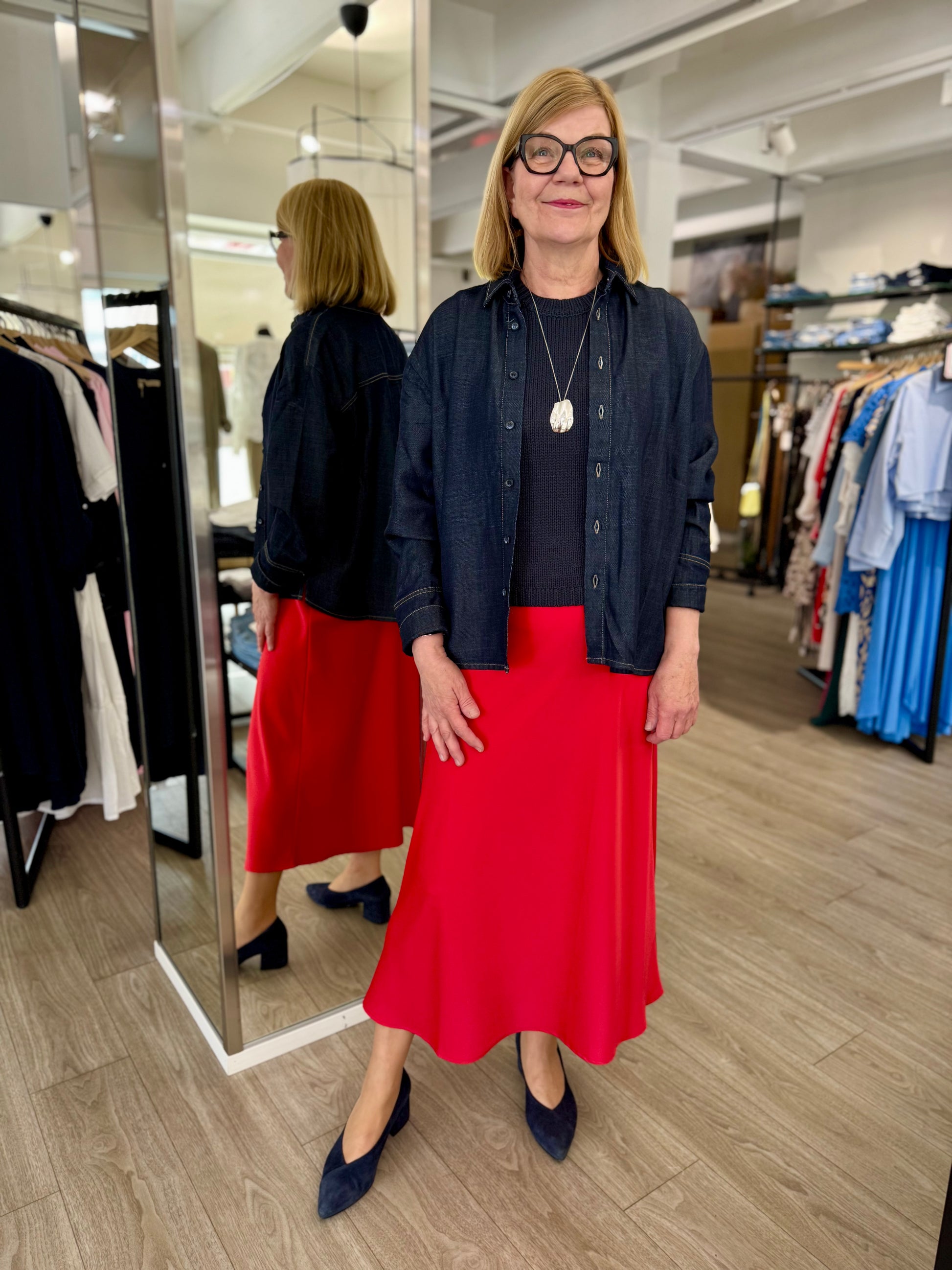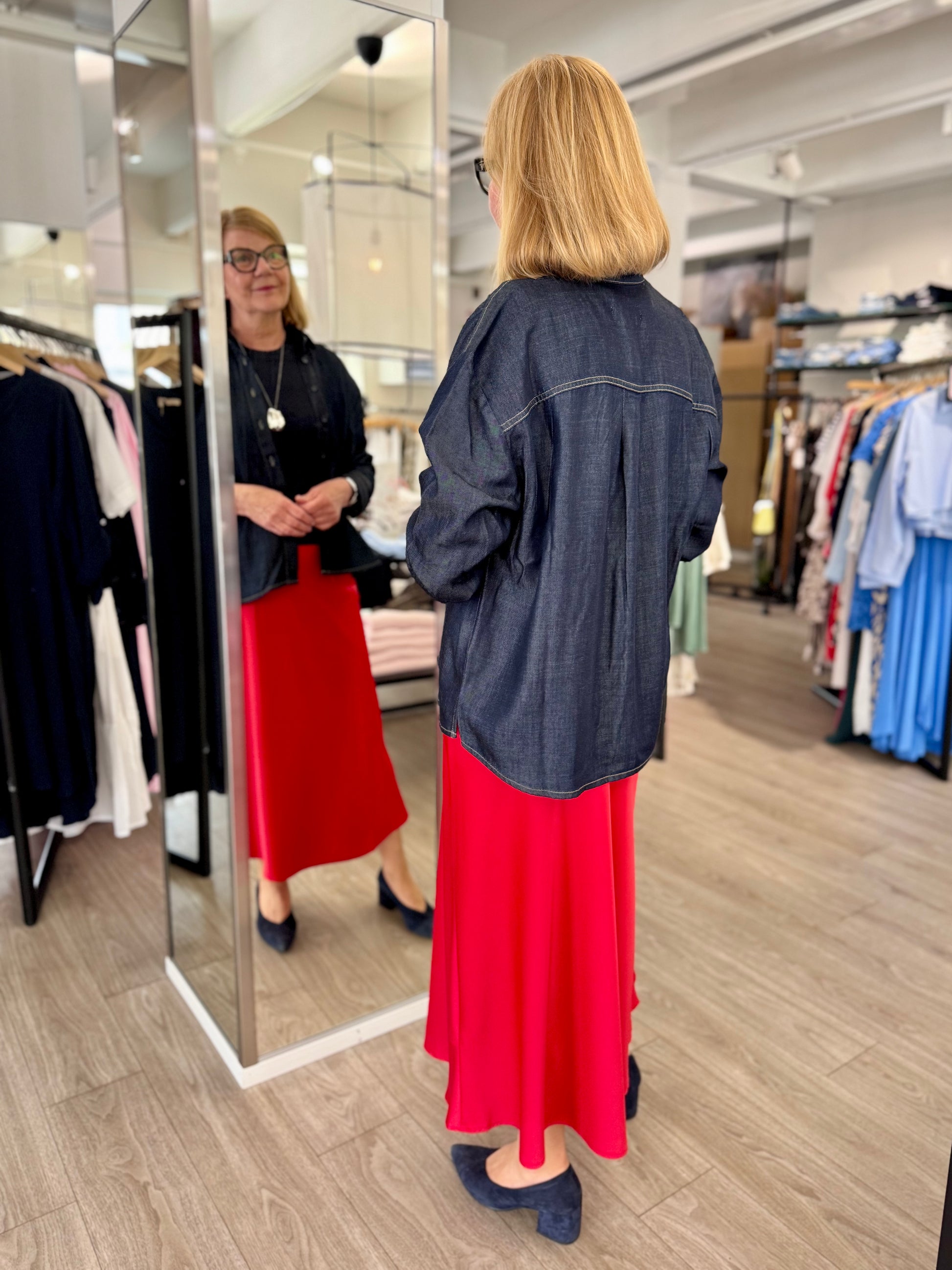 Naisellinen Moves Gebry hame, kauniilla satiinipinnalla ja maksimitalla. Moves Gebry hame on malliltaan A-linjainen ja laskeutuva. Hameessa on vyötäröllä kuminauha, ja sivulla piilovetoketju.