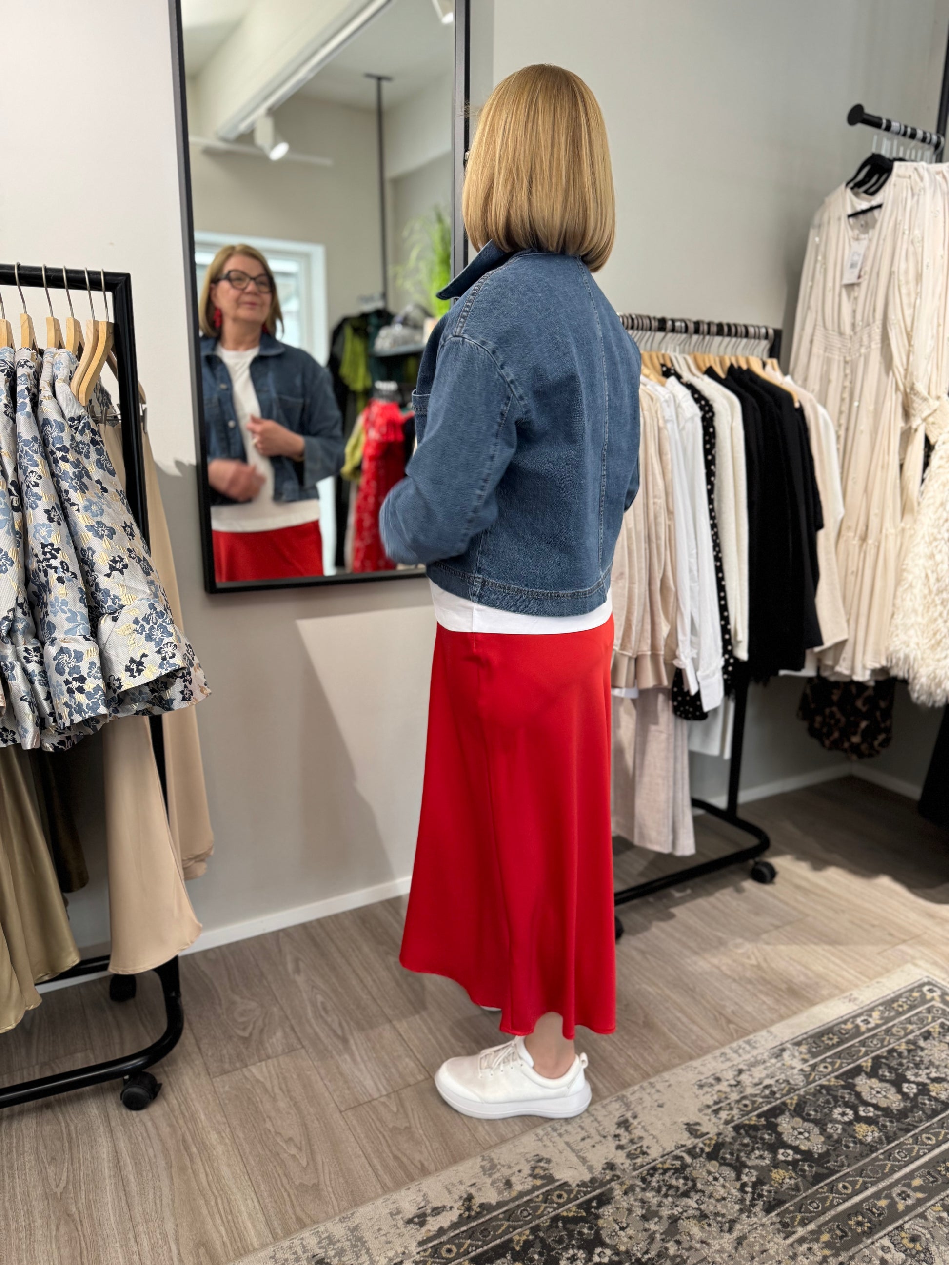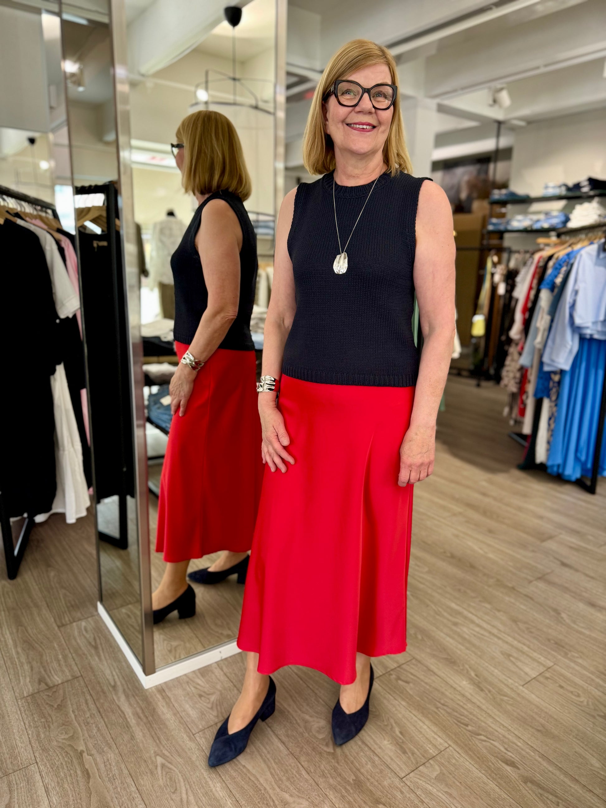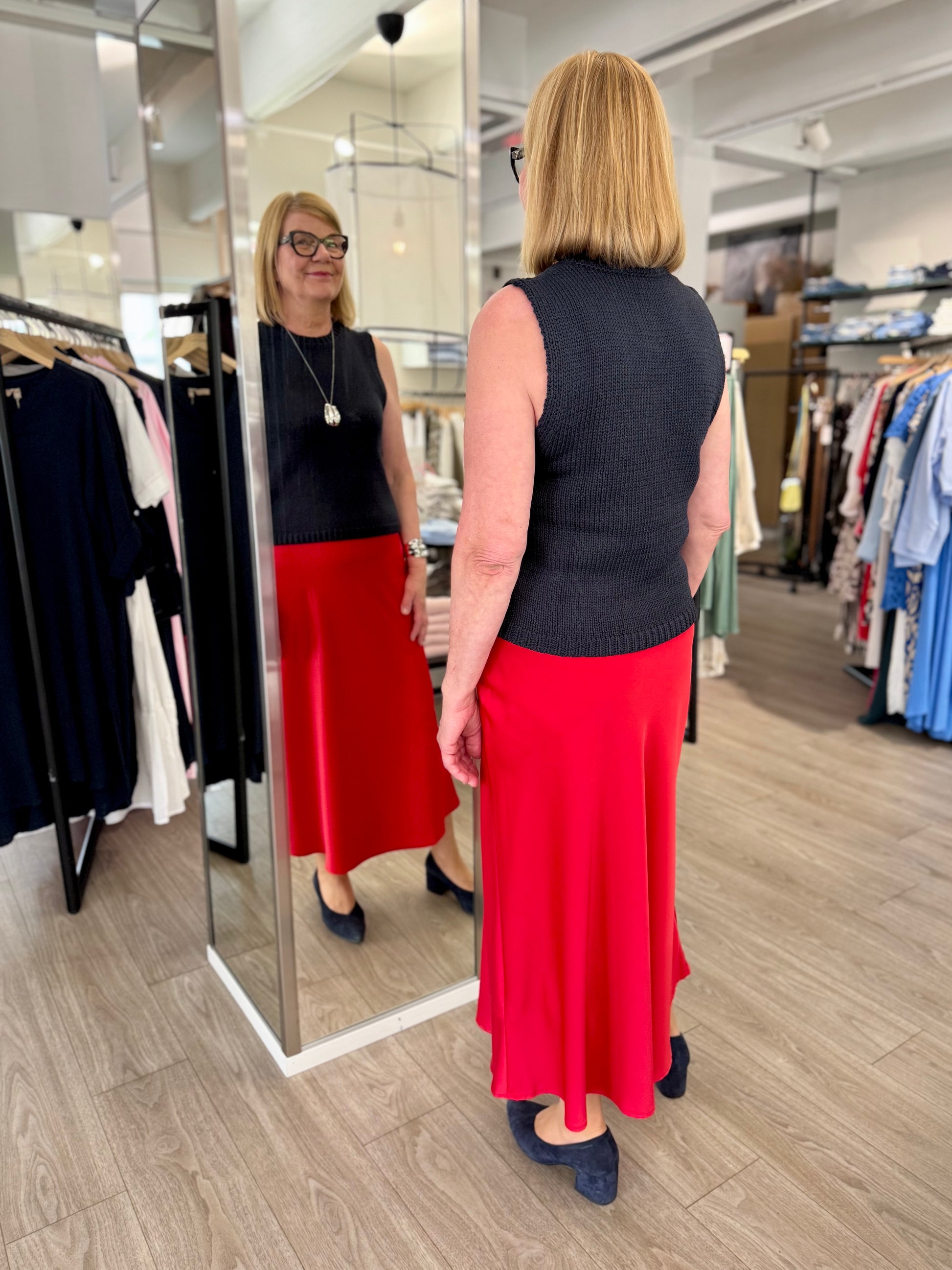 Naisellinen Moves Gebry hame, kauniilla satiinipinnalla ja maksimitalla. Moves Gebry hame on malliltaan A-linjainen ja laskeutuva. Hameessa on vyötäröllä kuminauha, ja sivulla piilovetoketju.