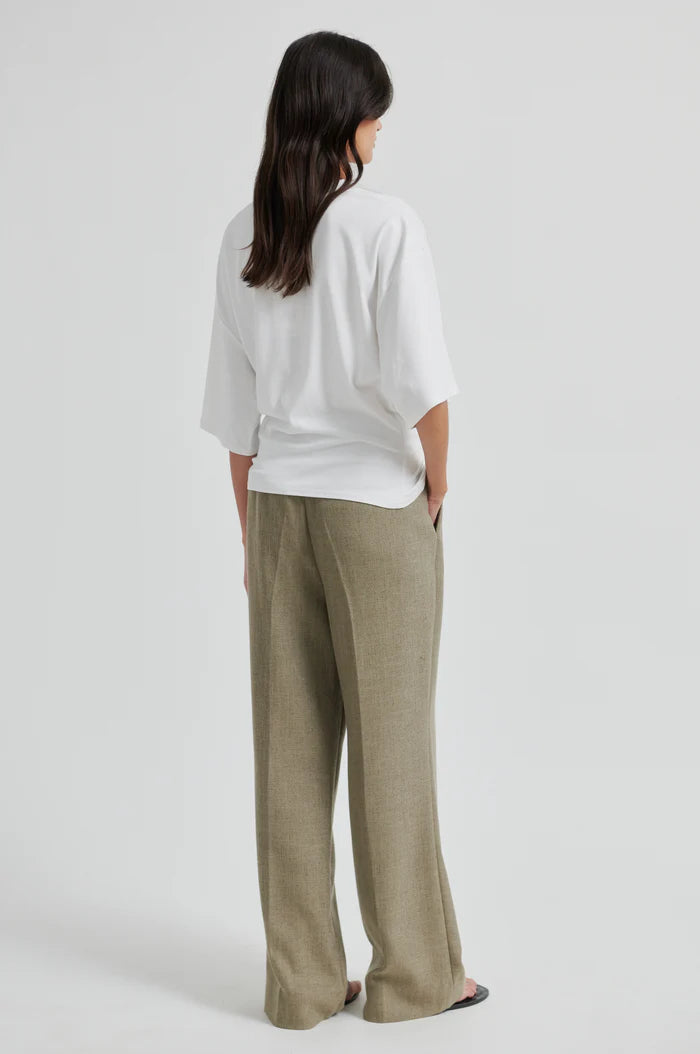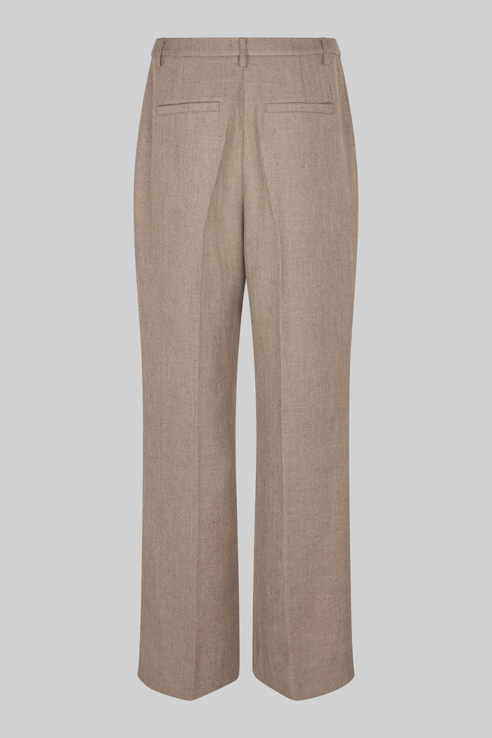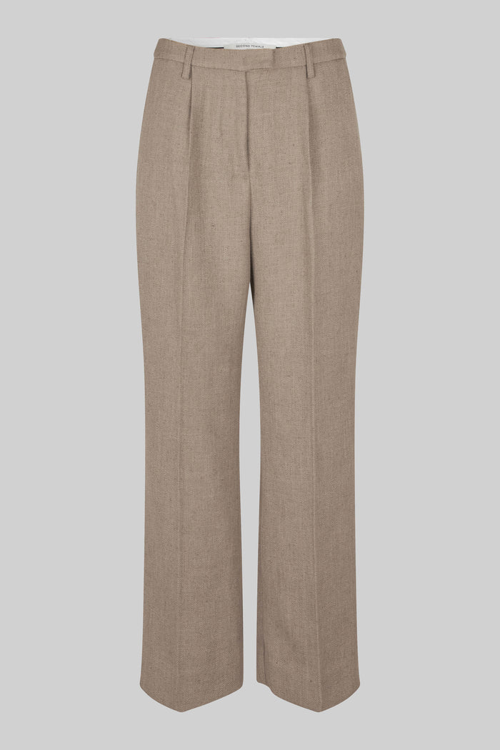Second Female Rosaria housut, joissa suorat, leveät lahkeet ja vyötäröllä laskokset. Housut on valmistettu meleeratusta pellavasekoitteesta. Second Female Rosaria housuissa on piilovetoketju, hakas- ja nappikiinnitys sekä edessä taskut.