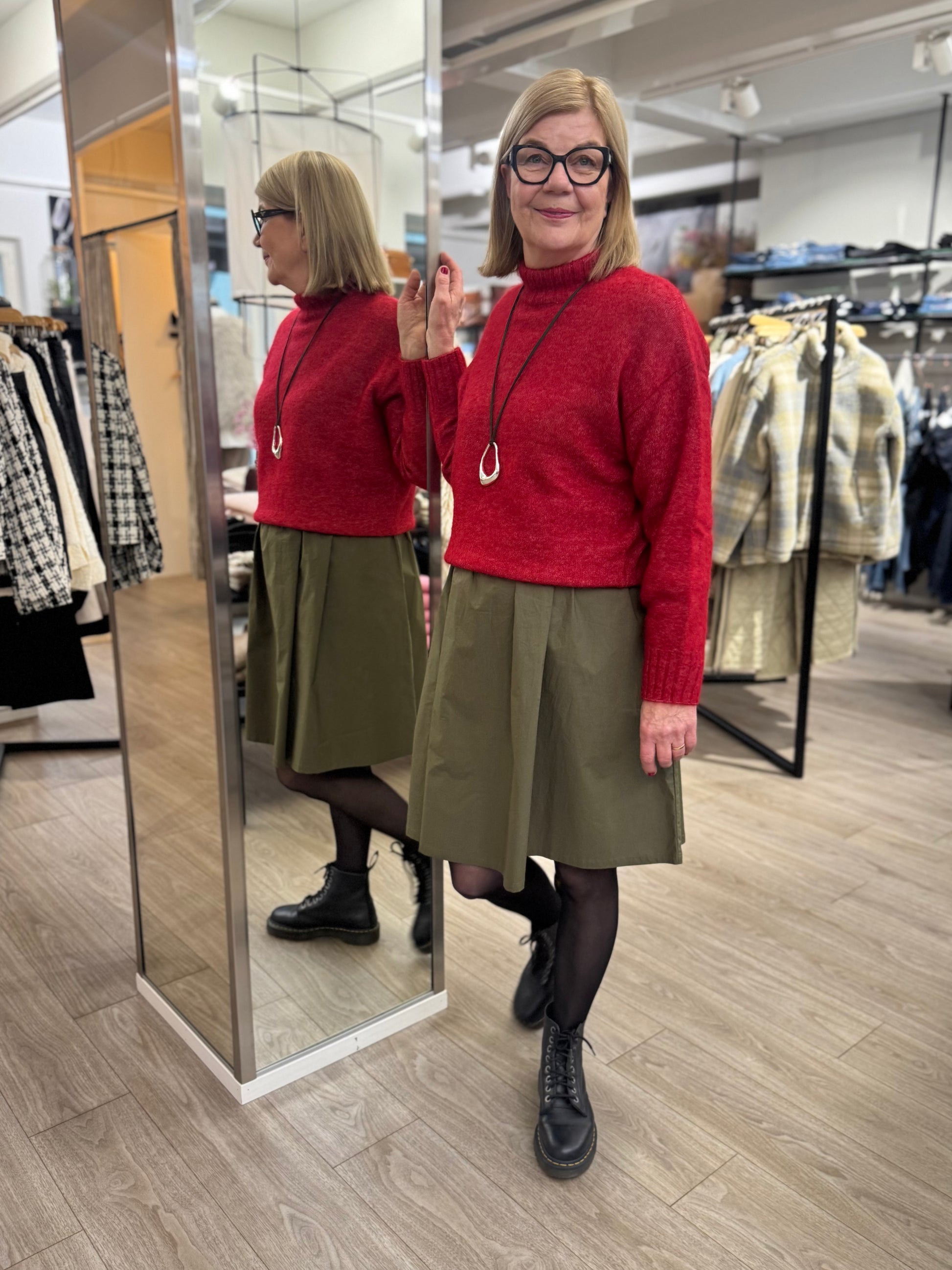 Laadukas Second Female neule pystykauluksella. Second Female Ina neule on mitoitukseltaan väljä ja siinä on lasketut olkapäät. Helmassa, hihansuissa ja kaulukaessa resorineulokset. Lämmin ja pehmeä, hieman pörröinen materiaali, sekä kaunis meleerattu punaisen sävy.