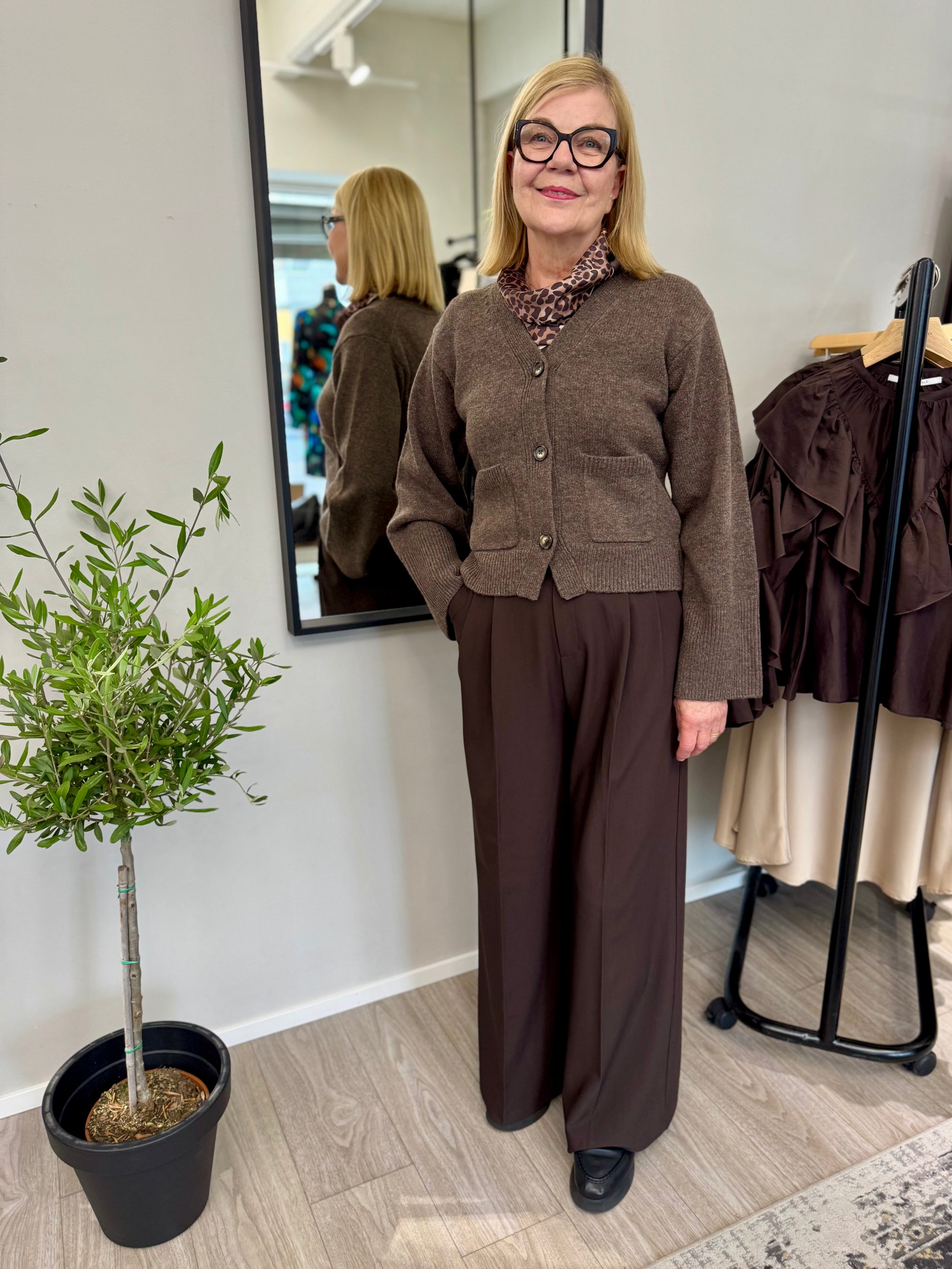 Laadukas Second Female Alpha neuletakki, jossa on edessä nappikiinnitys ja päälitaskut. Second Female Alpha neuletakki on valmistettu pehmeästä ja lämpimästä villasta. Luonnollinen, meleerattu ruskean sävy. Neuletakissa on linjakas vyötärön malli ja leveät hihat.