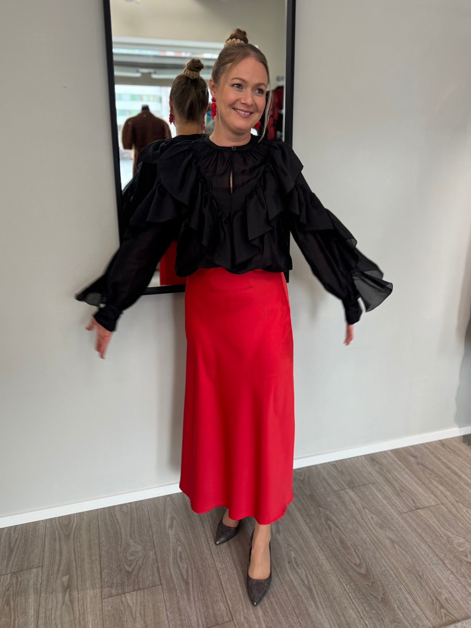 Upea Second Female Fria Frill röyhelöpusero, joka on valmistettu hieman läpikuultavasta ja ilmavasta materiaalista. Second Female Fria puserossa on väljä istuvuus ja pyöreä pääntie, jossa napillinen halkio edessä, sekä kauniit röyhelöt koristamassa yläosaa.