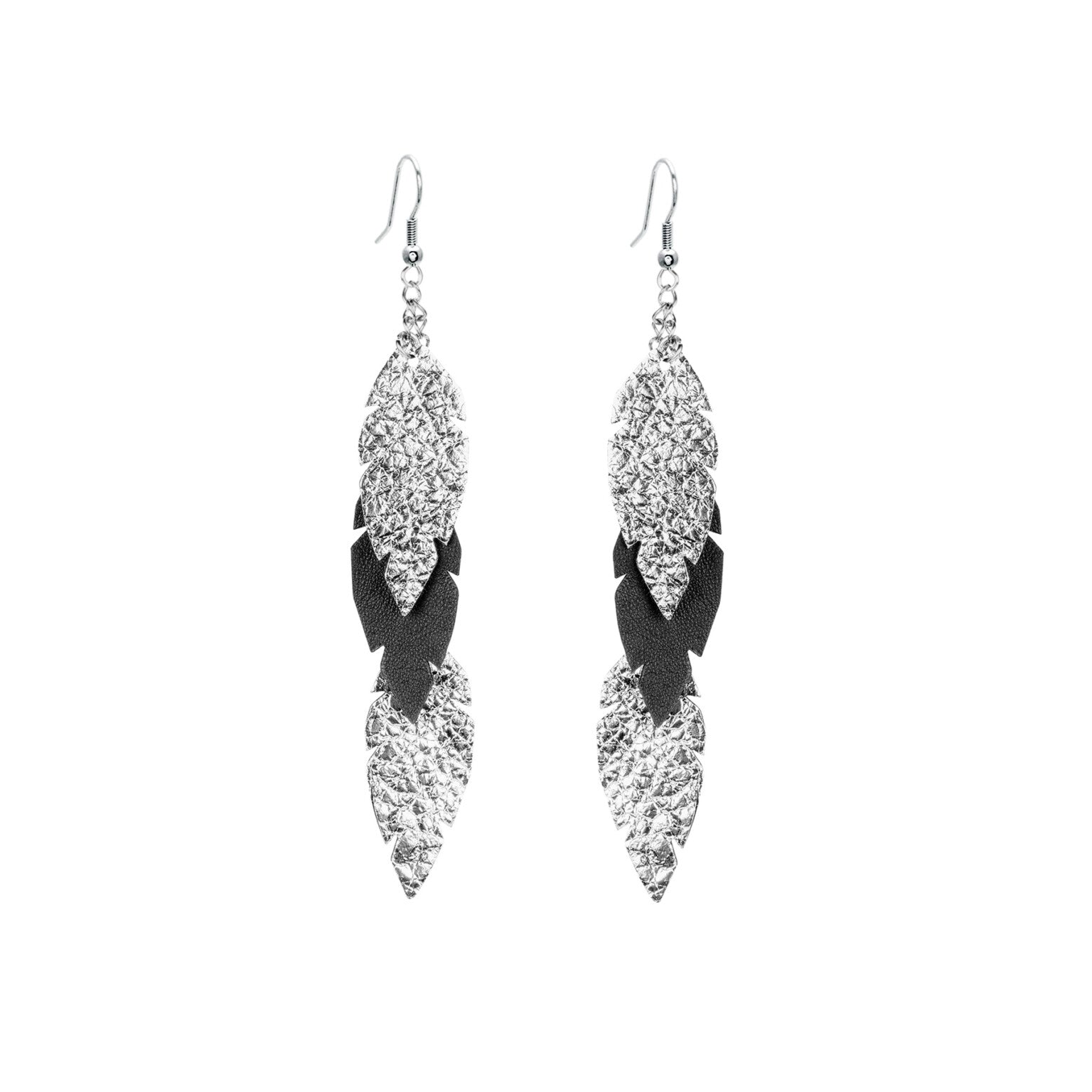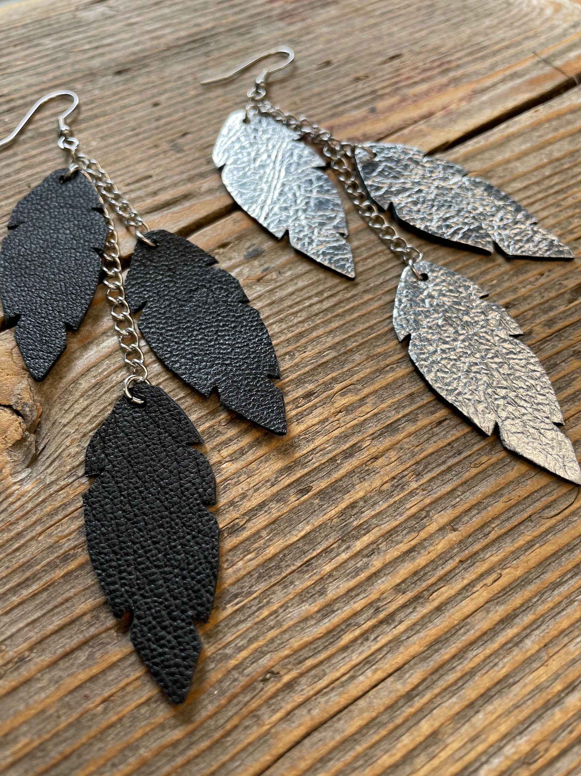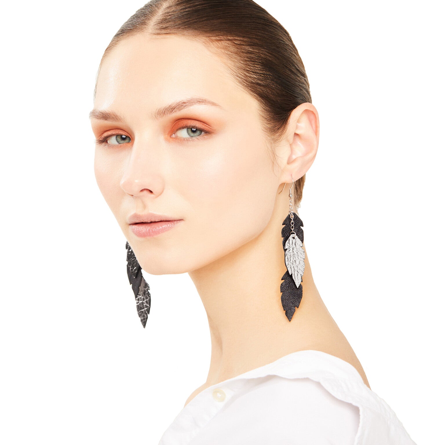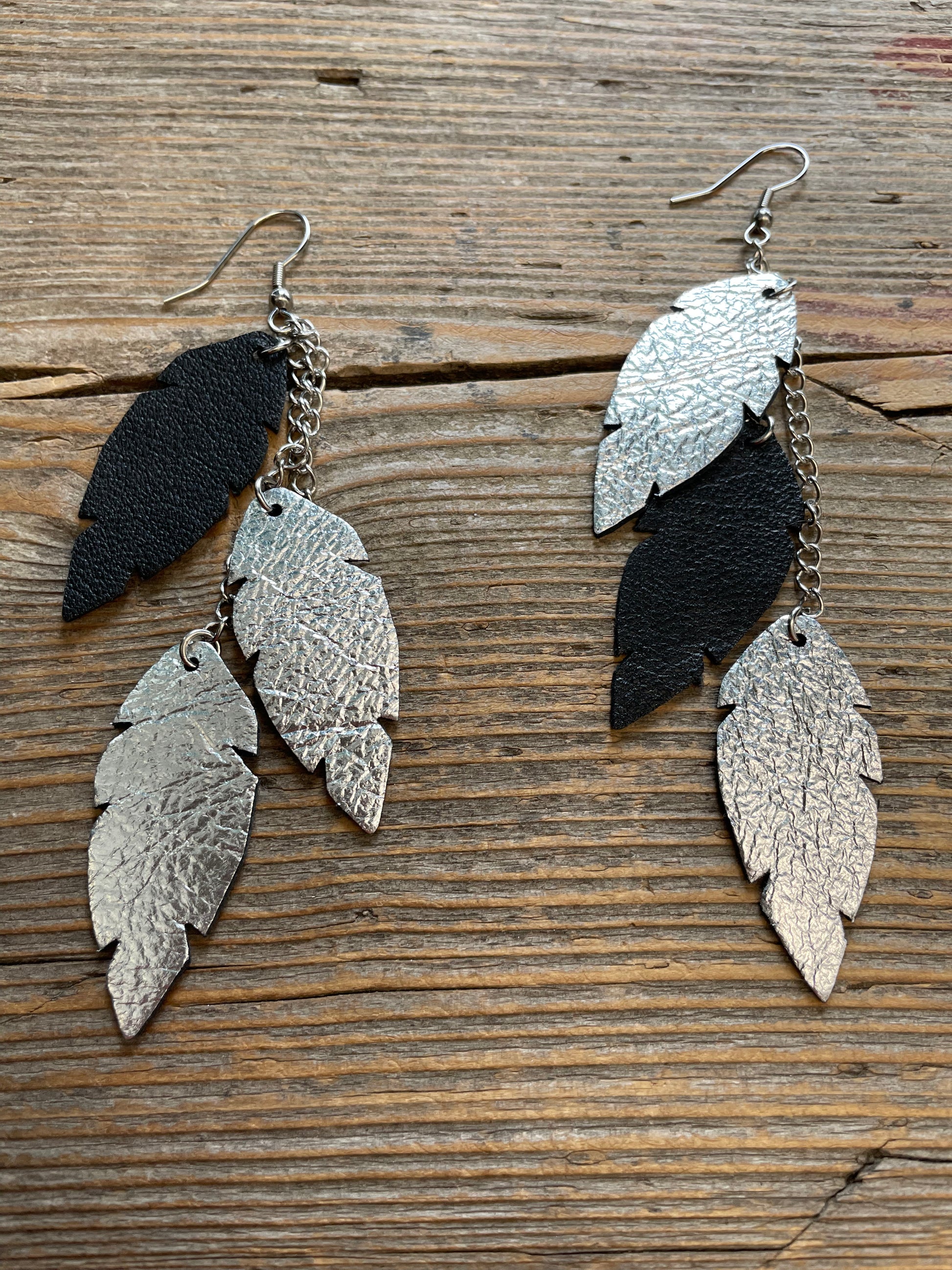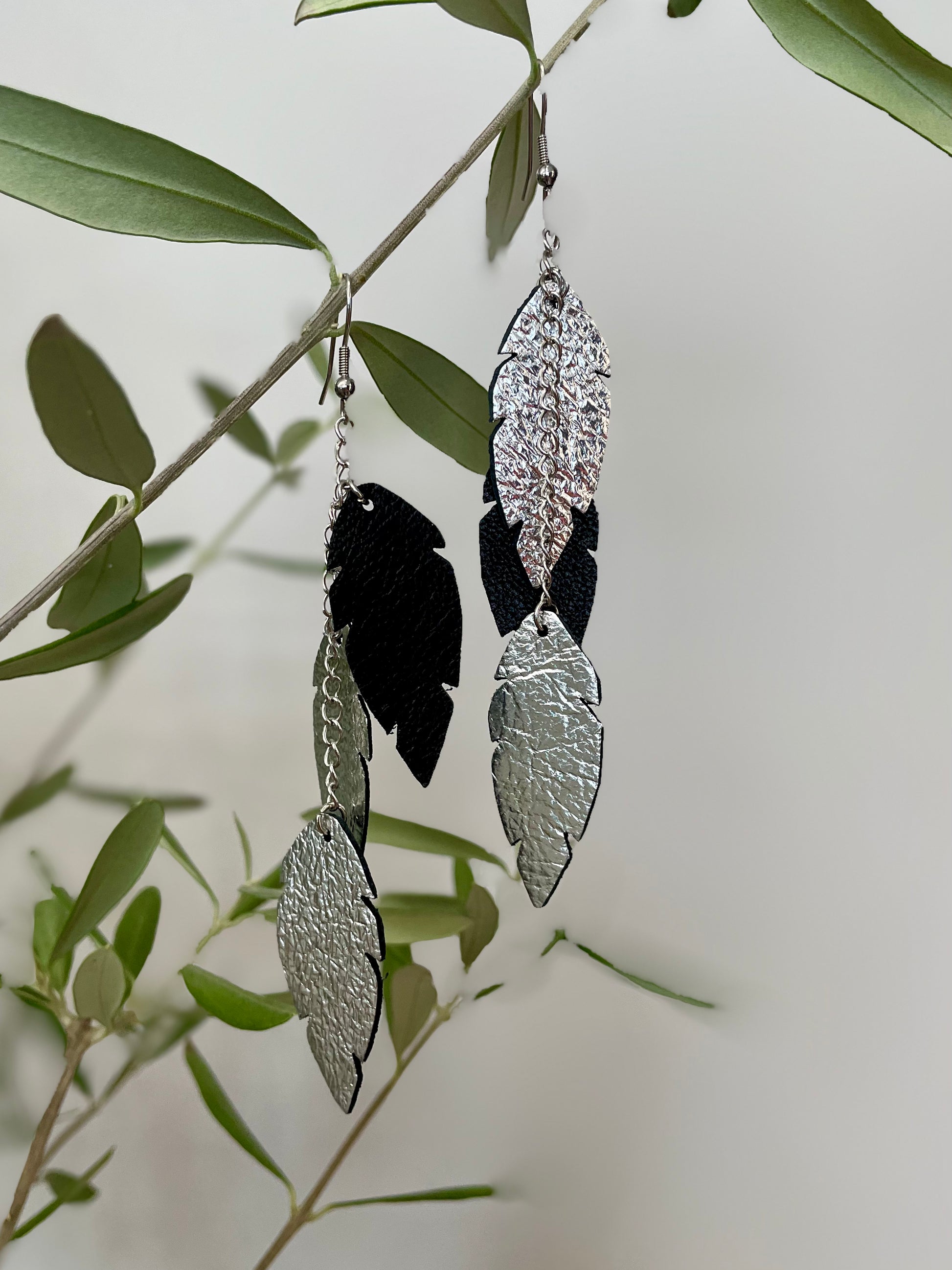 Feathers Petite Trio -nahkakorvakorut asettuvat hyvin myös korkeamman kauluksen sekä huivin kanssa. Koukut ja ketjut ovat valmistettu hopeansävyisestä nikkelittömästä teräksestä. Koruissa käyttämämme nahkamateriaali on peräisin Suomesta tai Italiasta