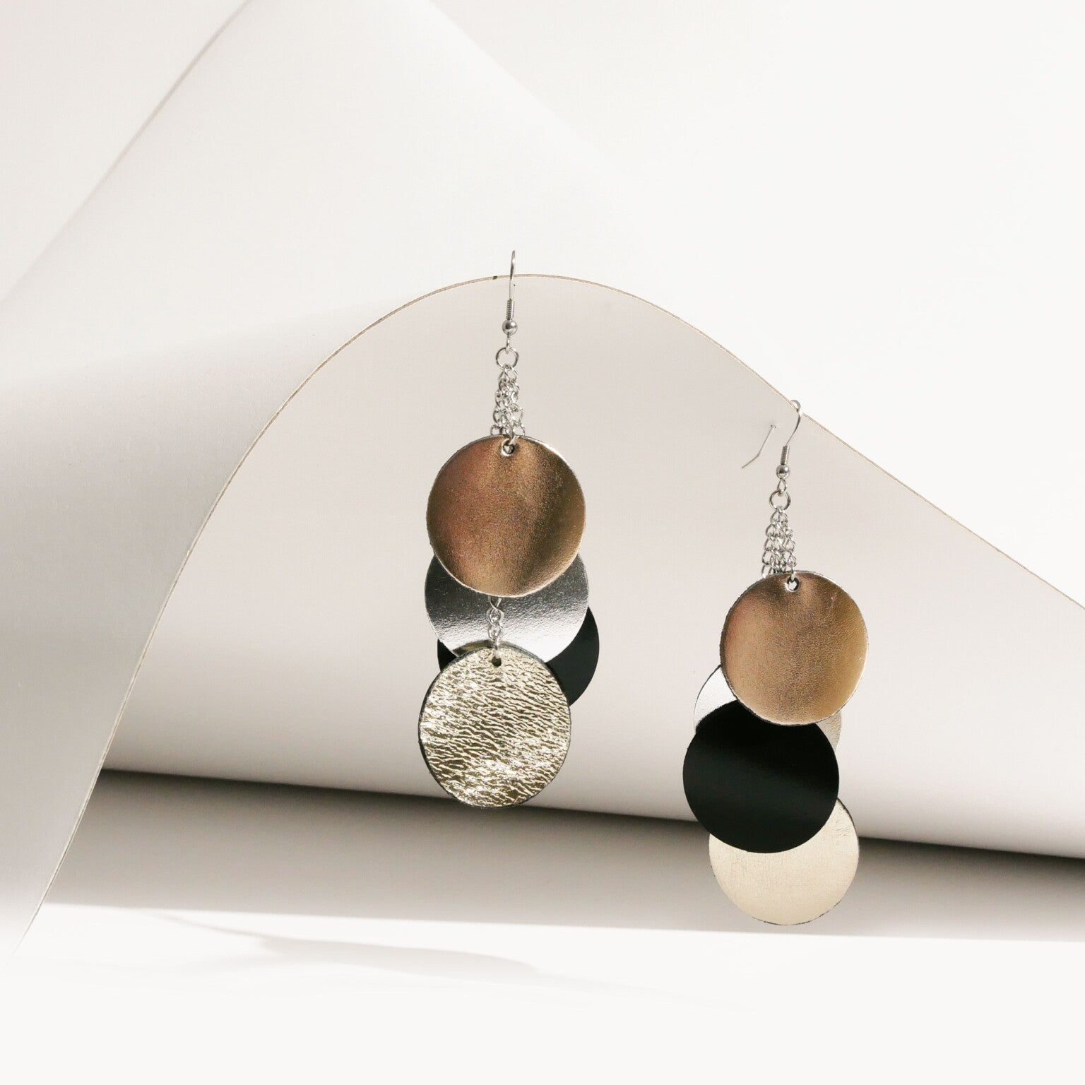 Nahasta valmistetut, kevyet Viaminnet Dance korvakorut, ovat leikkisä yhdistelmä modernia ja suoraviivaista muotoilua, sekä juhlavaa hohtoa. Malliston pehmeät muodot ja geometria luovat kontrastin sen korvakorujen kirkkaille ja hohtaville väreille.