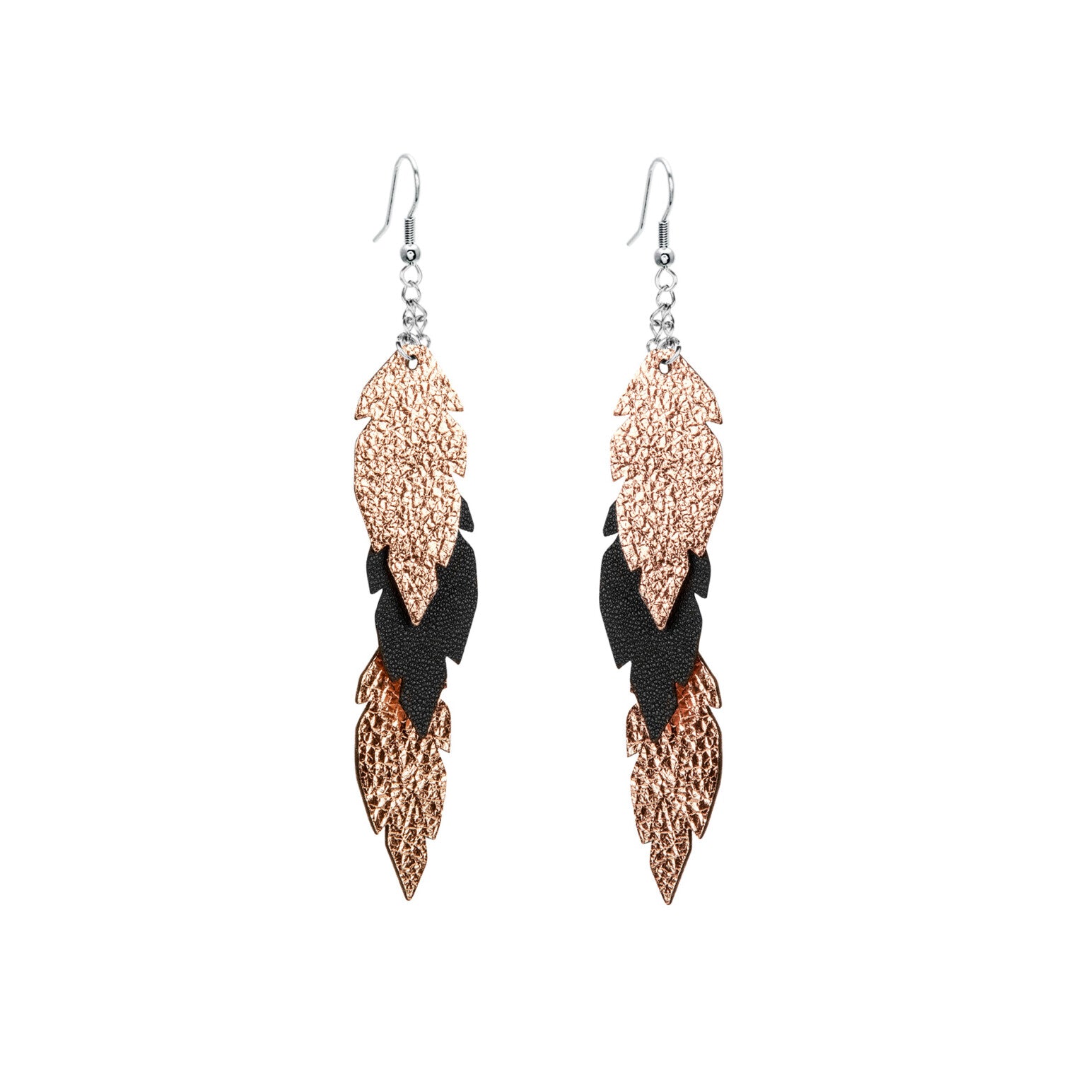 Viaminnet Feather korvakorut ovat leikkisän designin ja pehmeän nahan ansiosta hyvin ilmavat ja kevyet käyttää. Hopean tai ruusukullan sävy yhdistettynä mustan kanssa on aina klassinen valinta, jolla luottoasu muuntautuu astetta hehkeämmäksi hetkessä. Näissä korvakorissa jokaisen sulan toinen puoli on ruusukultaa ja toisen musta.